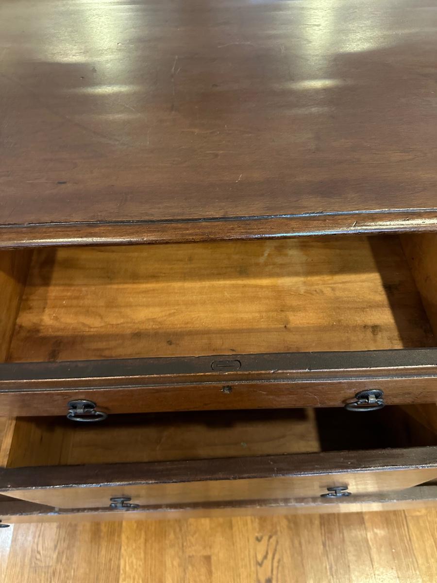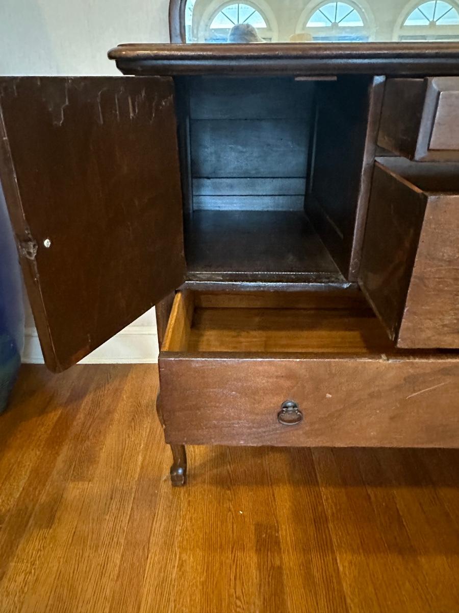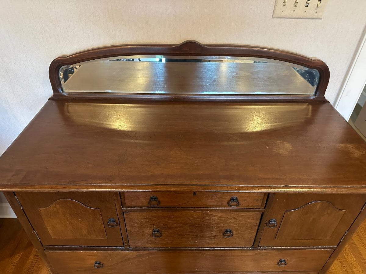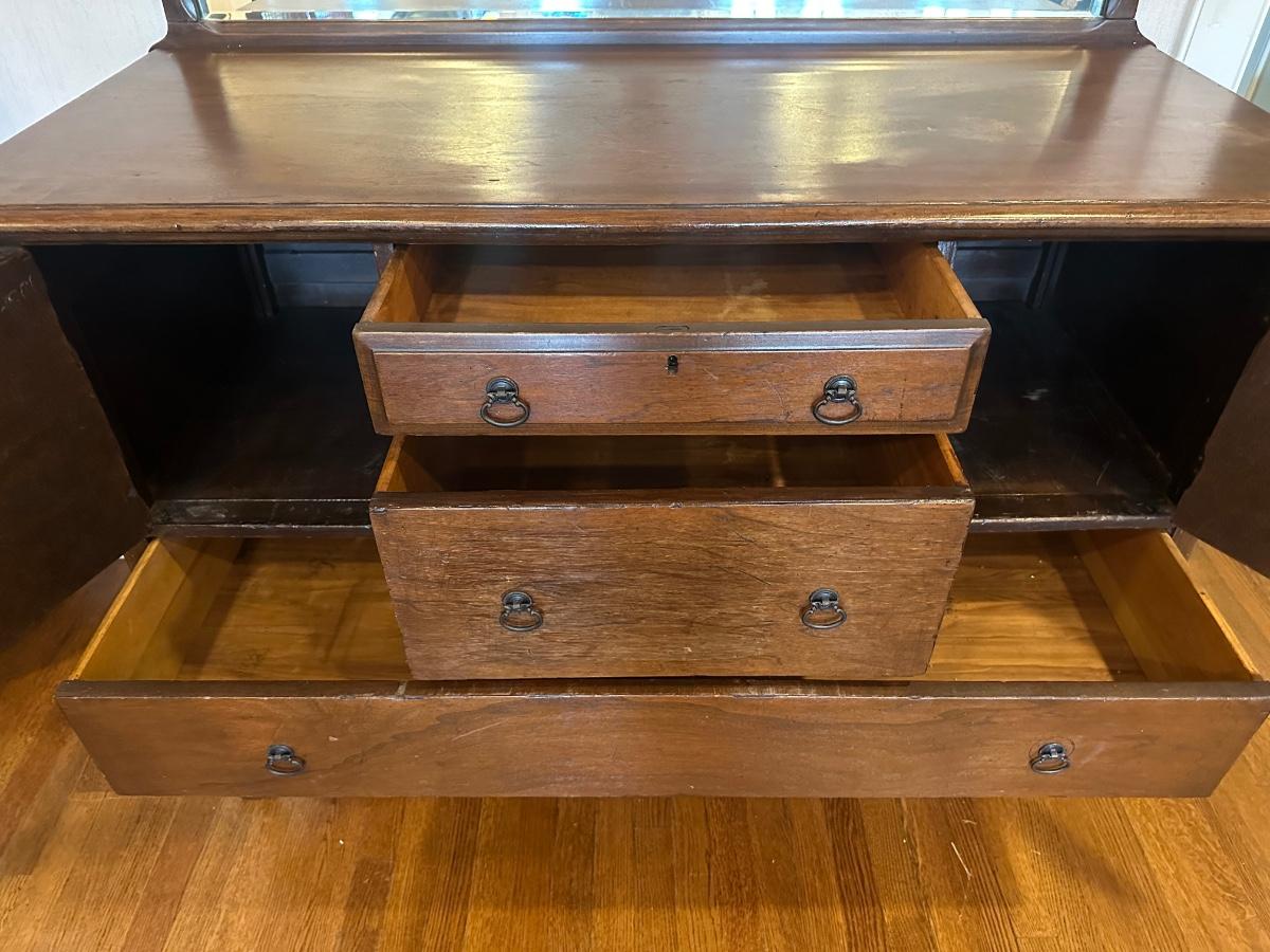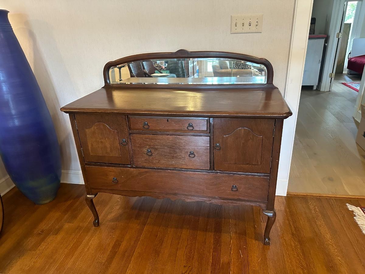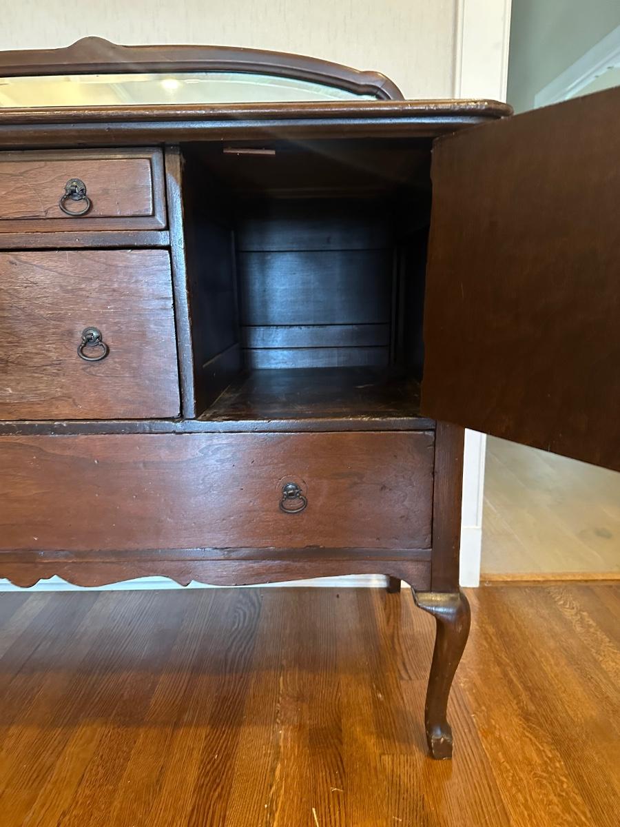 This beautiful antique sideboard has 3 drawers and 2 cabinets. It has the original mirror. There is some minor wear on the piece due to its age, see pictures.