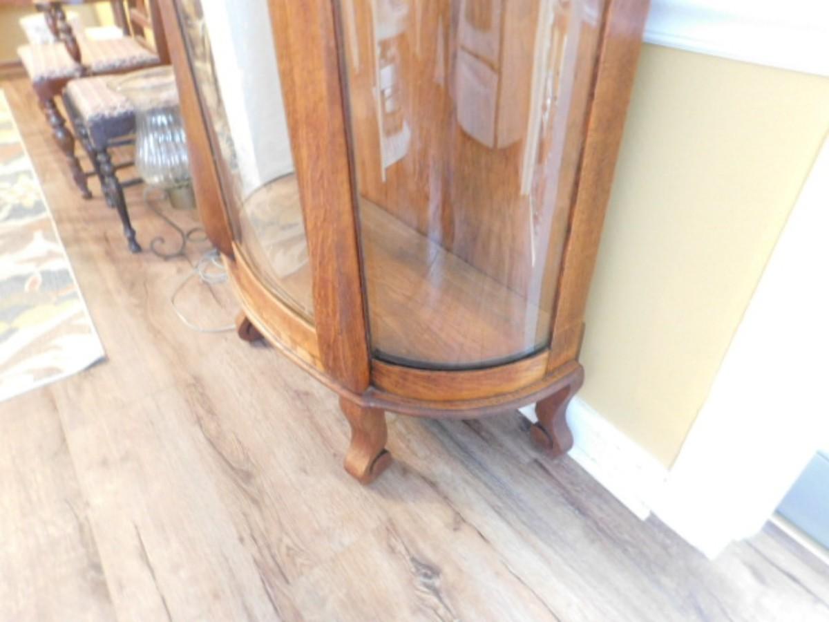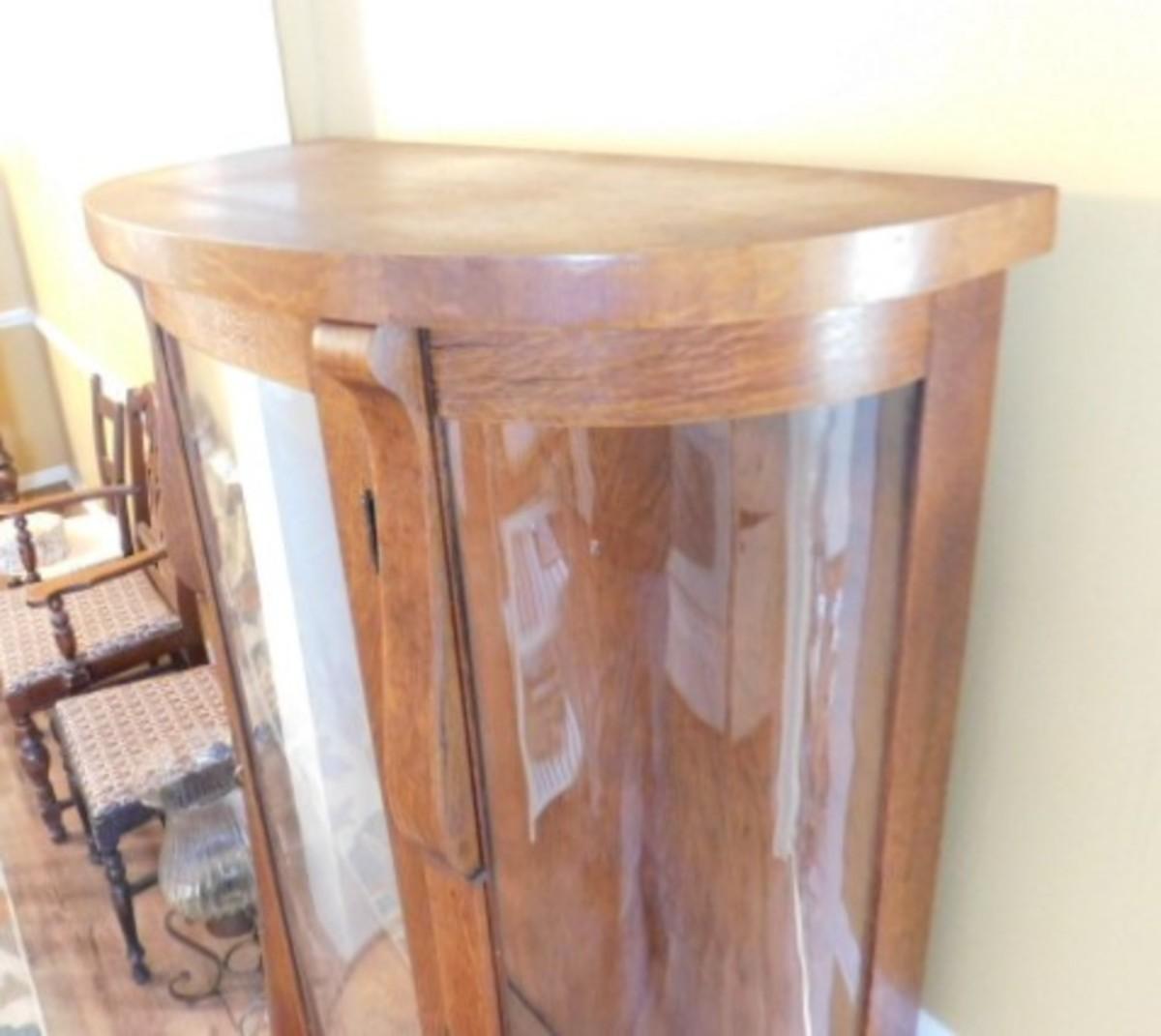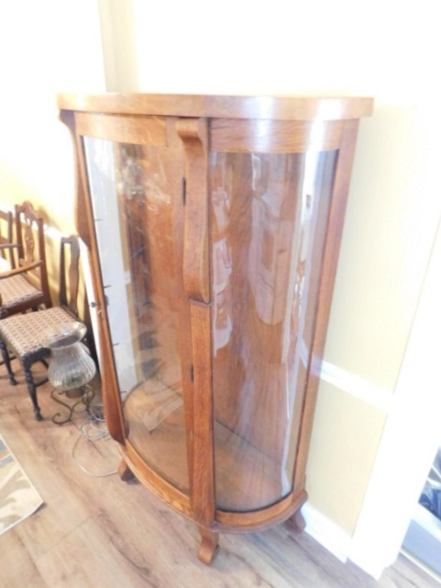 Antique Solid Tiger Oak Bow Front Curio Cabinet including 4 Matching Wood Shelves and Door Key
