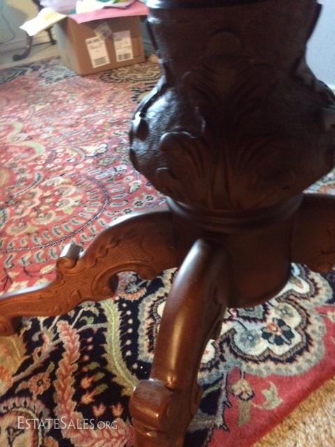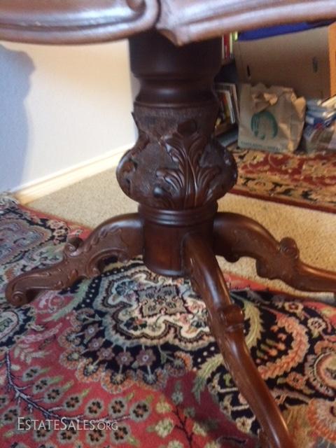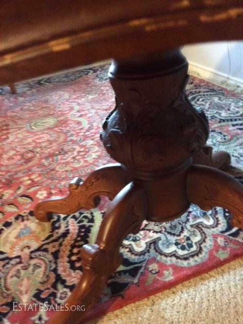 Antique walnut pedestal dining table. English oval dining table, overlaid on wood, pedestal table base with hand carved design. Solid oak wood.