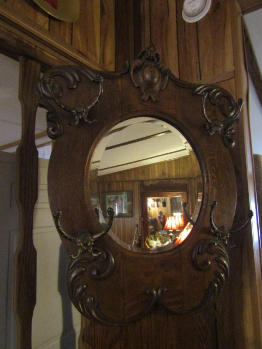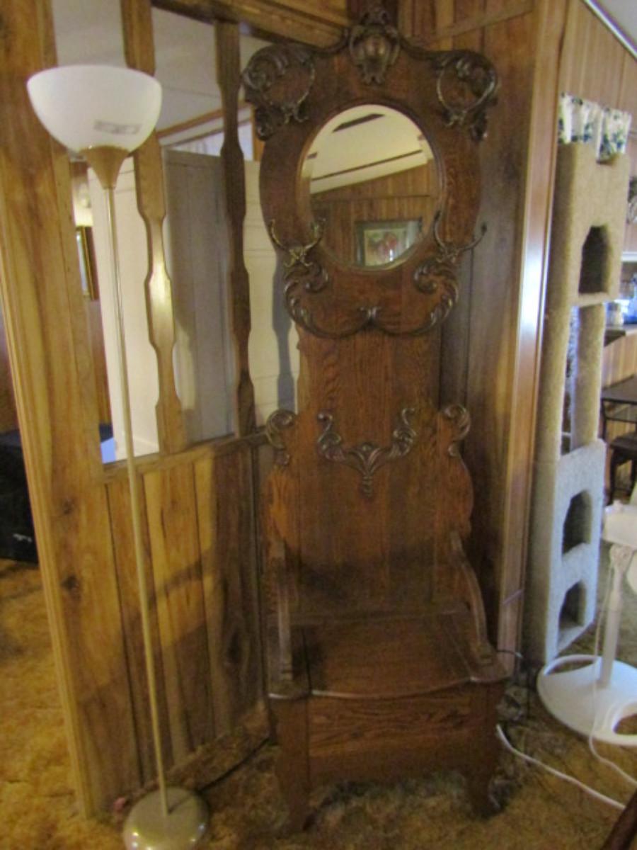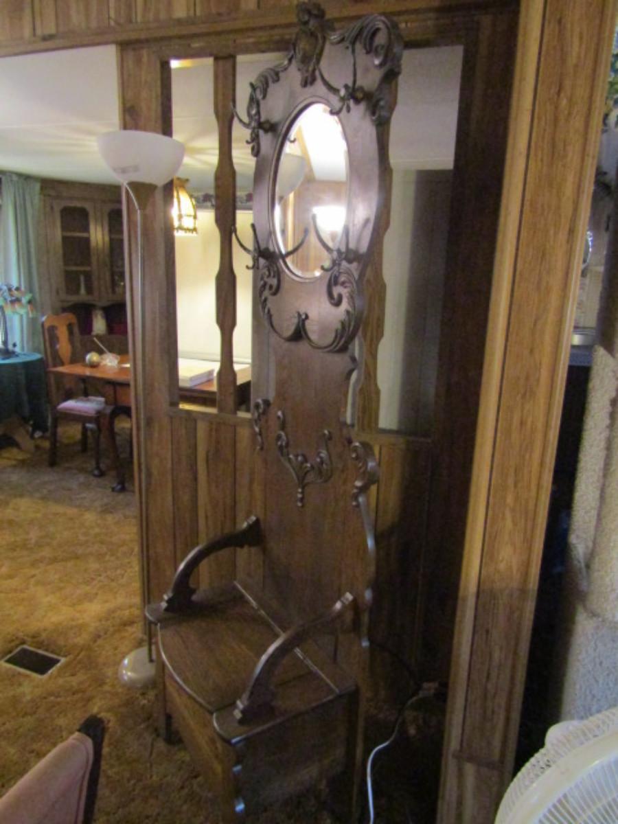 Antique Solid Wood Hall Tree with Mirror and Storage Seat. Approx 76" tall.