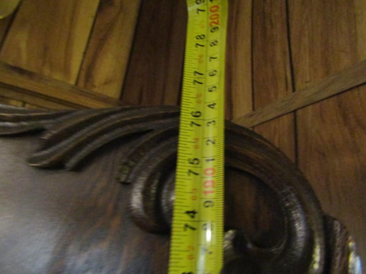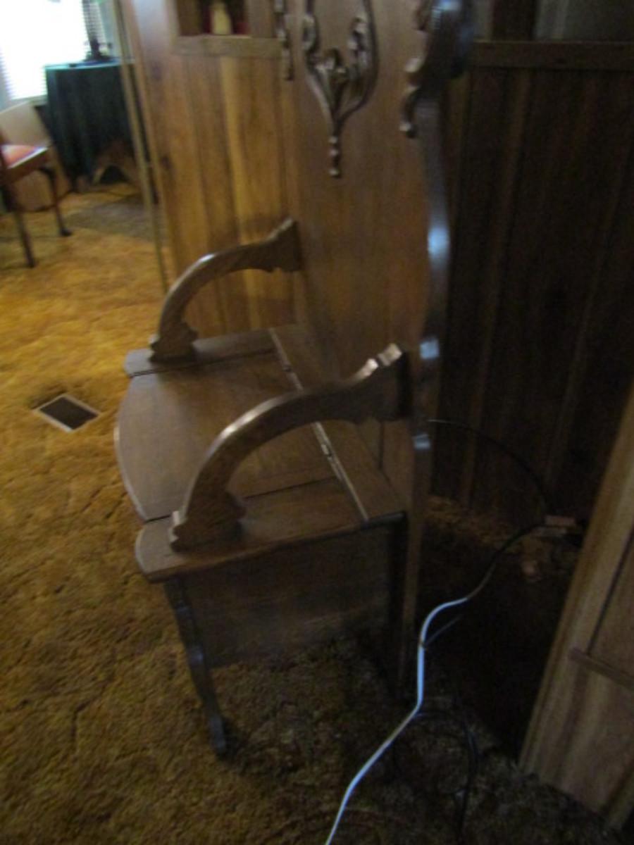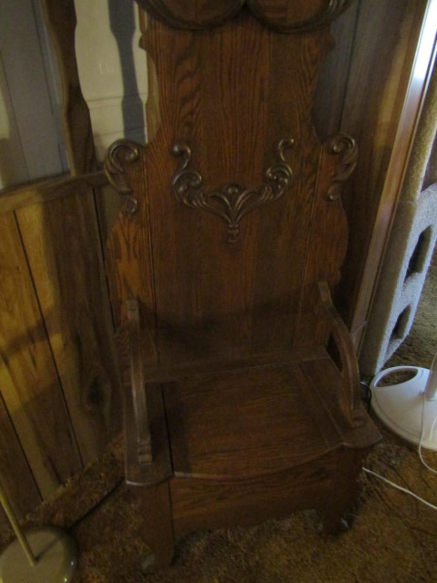 Antique Solid Wood Hall Tree with Mirror and Storage Seat. Approx 76" tall.