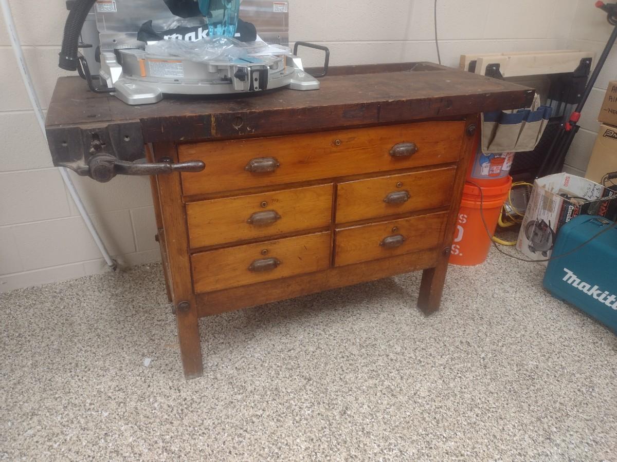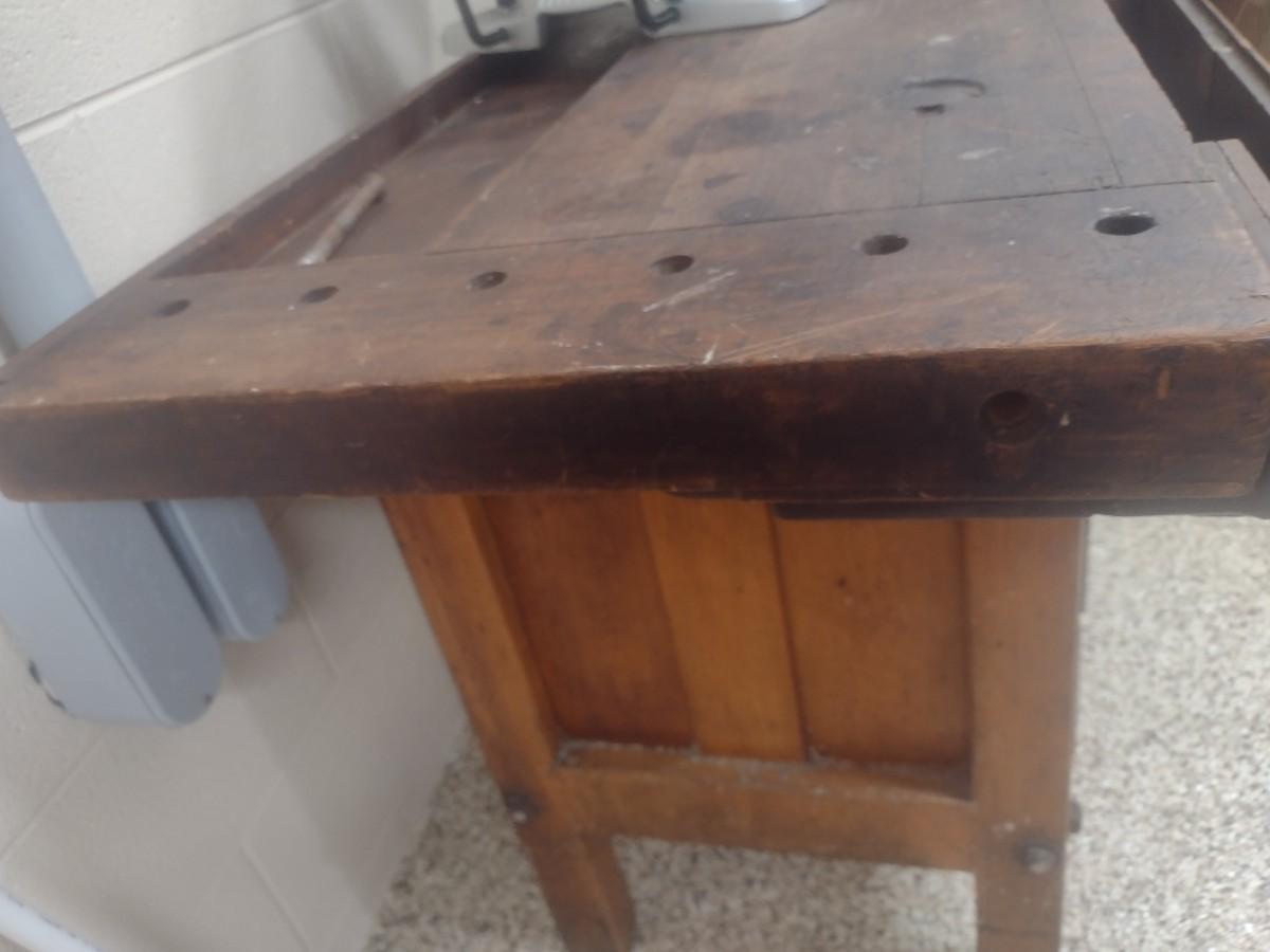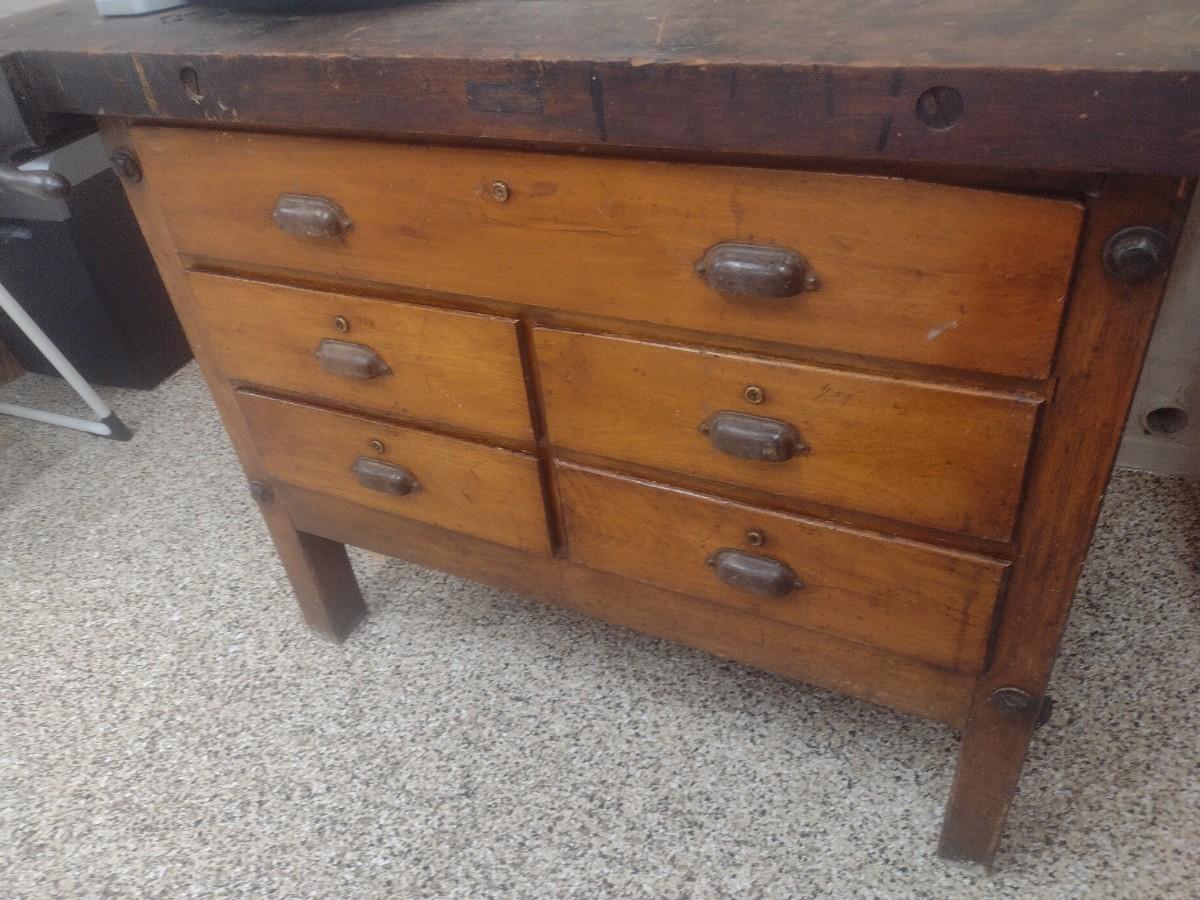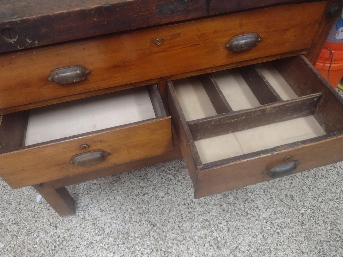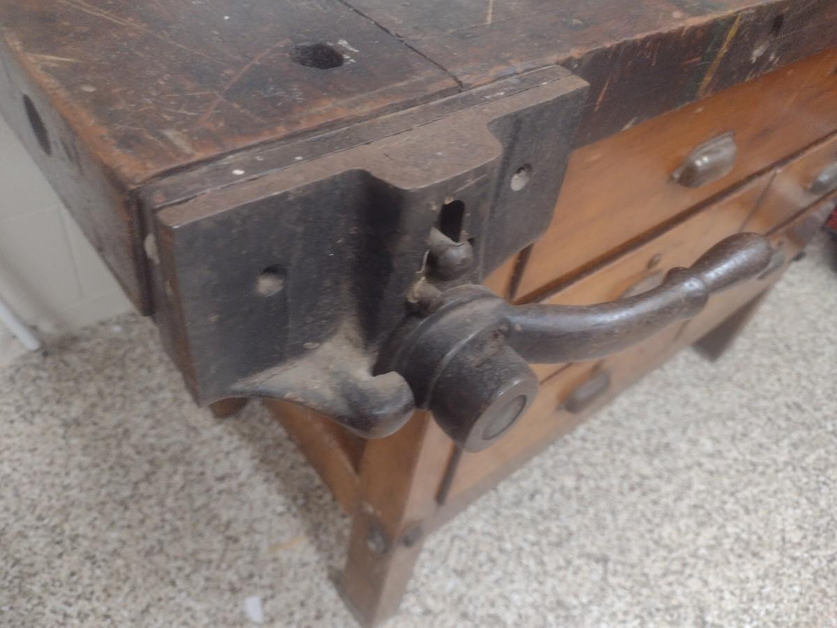Antique Solid Wood Multi-Drawer Work Bench with Vise Attachment
