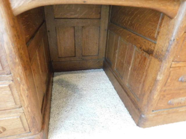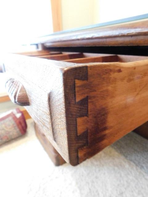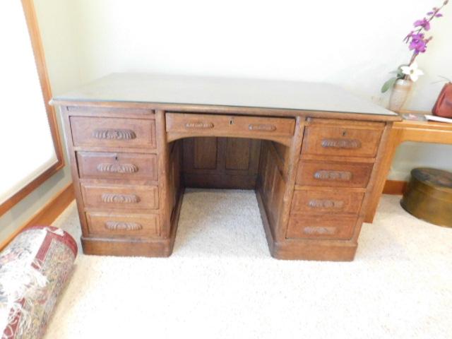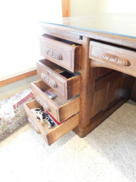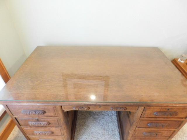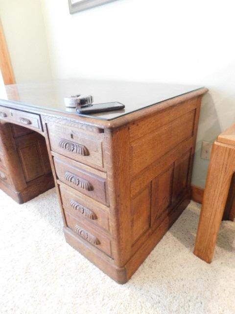 Antique Solid Wood Oak Knee Hole Desk with Protective Glass Top downstairs item