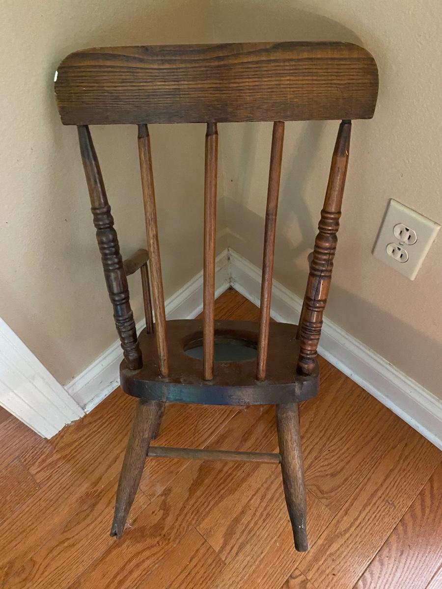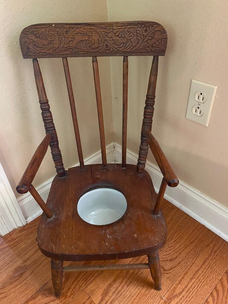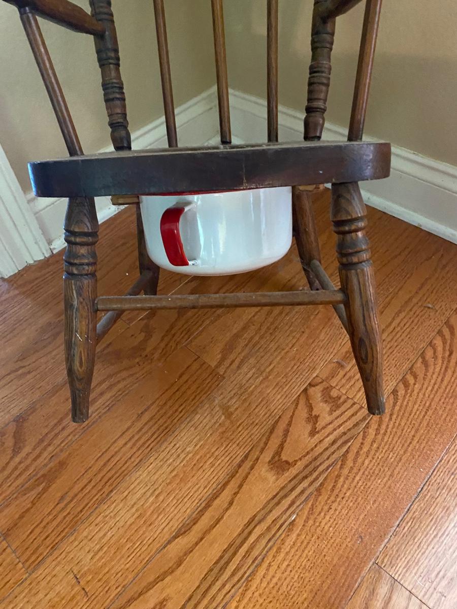 Antique solid wood potty chair with enamel pot. 11-1/2w x 11-1/2d x 24h back. Very good antique condition
