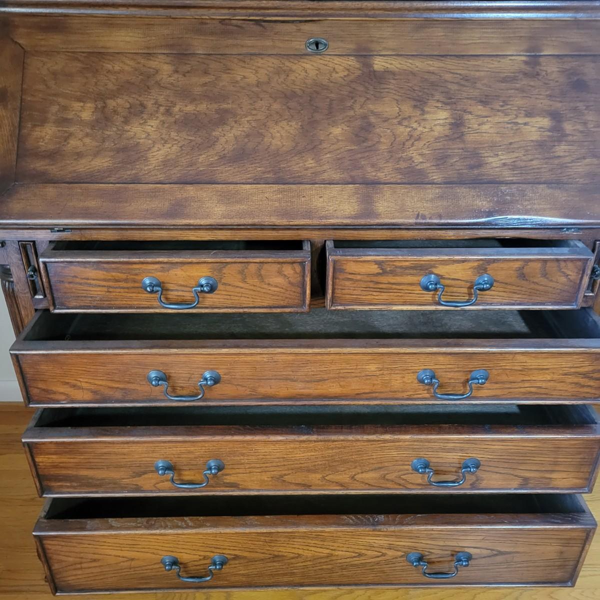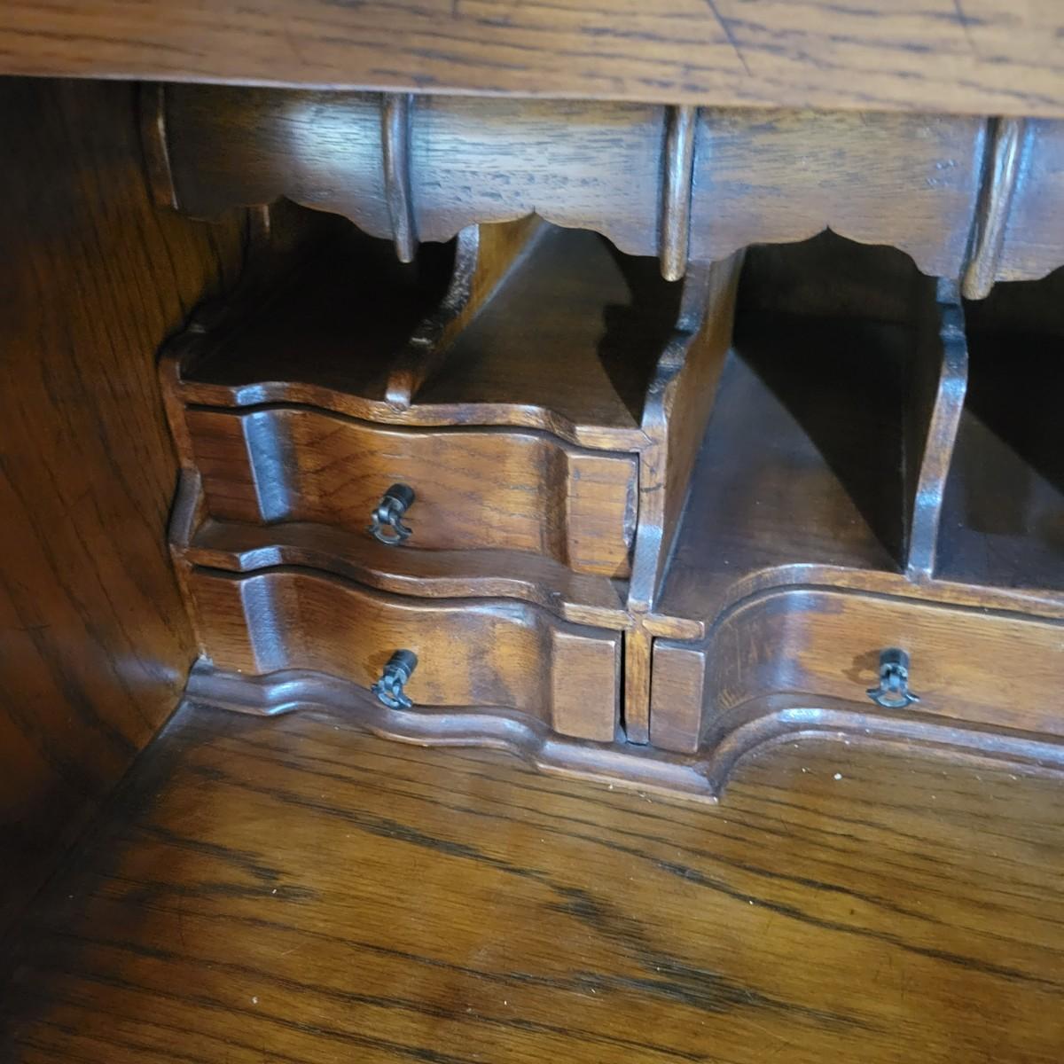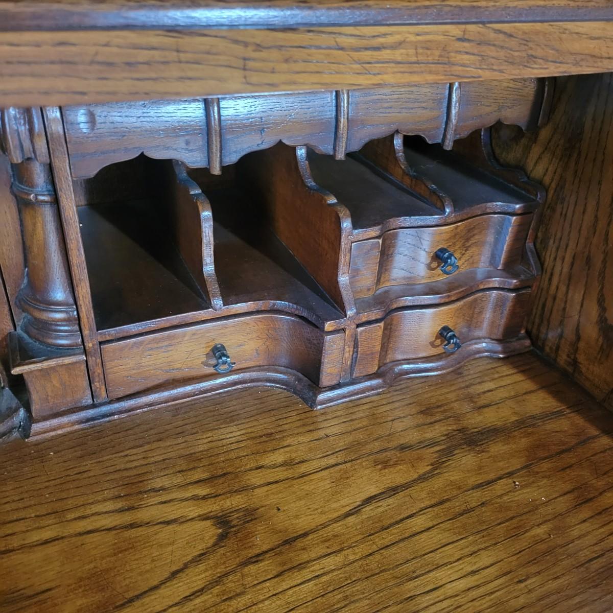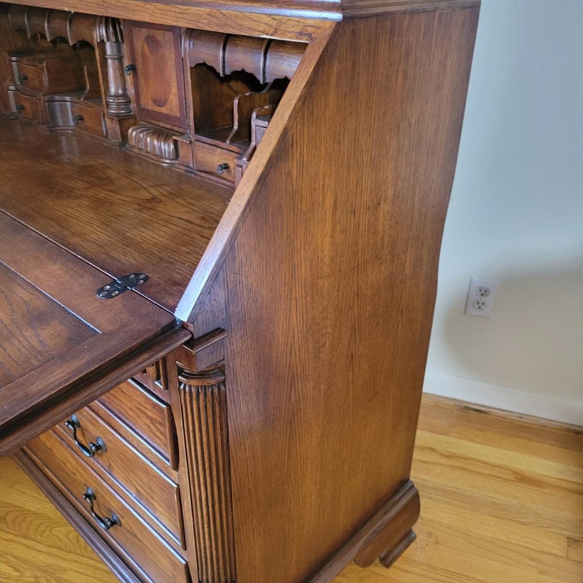 An antique solid wood secretary in good condition with a few minor blemishes. It appears that this piece was likely restored based on its condition and the condition of the wood blemishes. There are no scratches on this piece. This is a five drawer secretary with dovetailed drawers and two shelves in the hutch. The hutch features beveled glass on its doors and a two key locking/latching mechanism. Only the right side still works. The writing desk has a drop down writing surface with a functional locking mechanism. Inside, there are numerous drawers and hidden cubbies. All hardware is brass and there are some carved details on the piece. Measures approximately 41.5" x 22" x 87". The hutch and secretary will separate without tools. The winning bidder will need to bring assistance as this piece is substantial. Local Pickup Only
