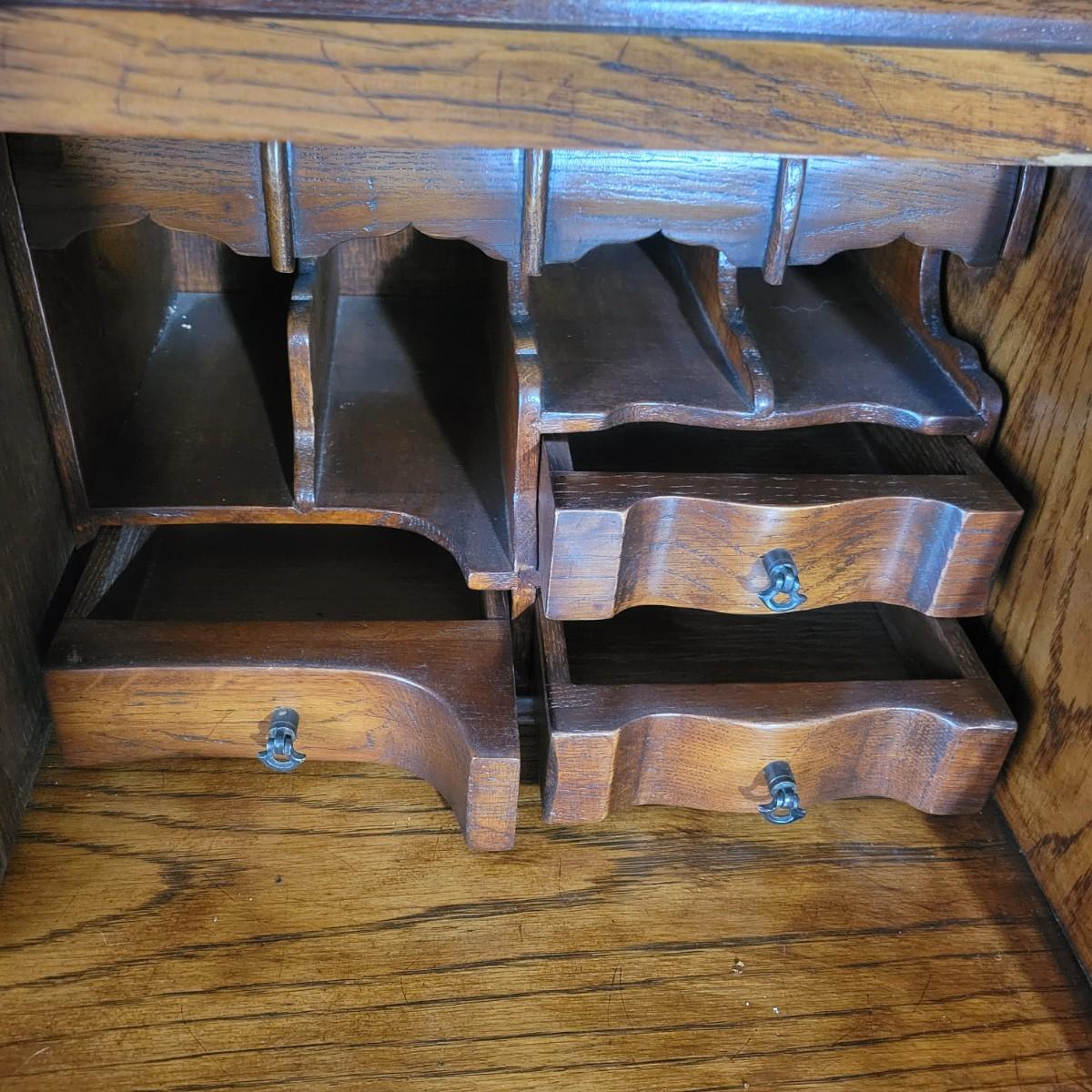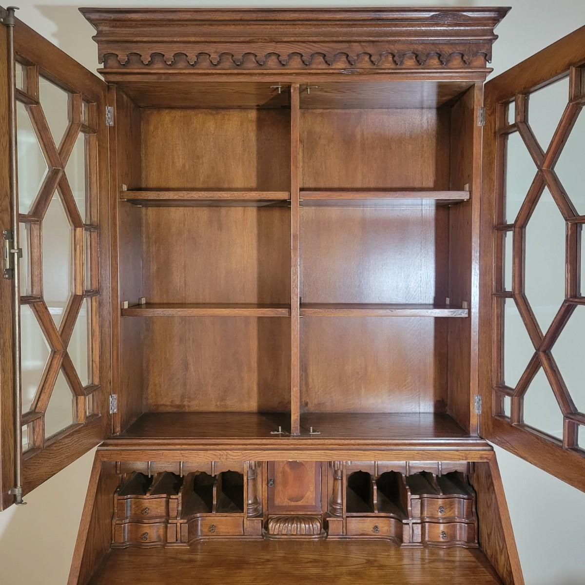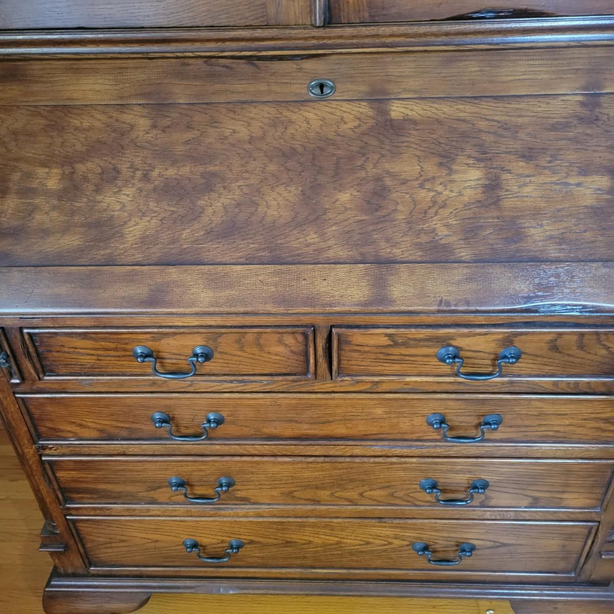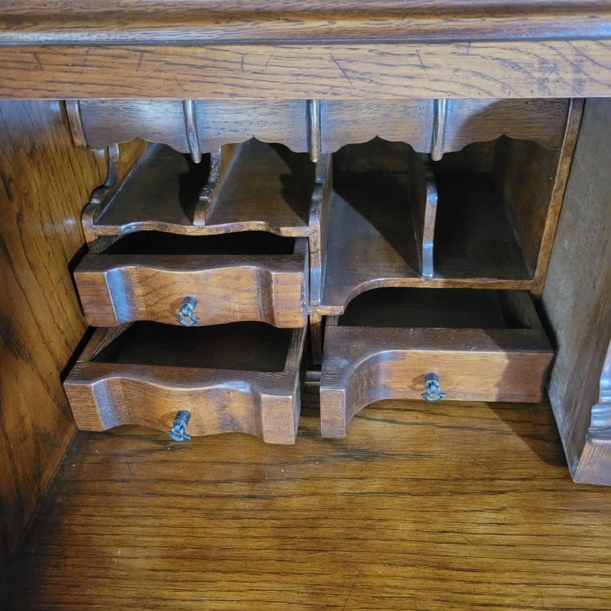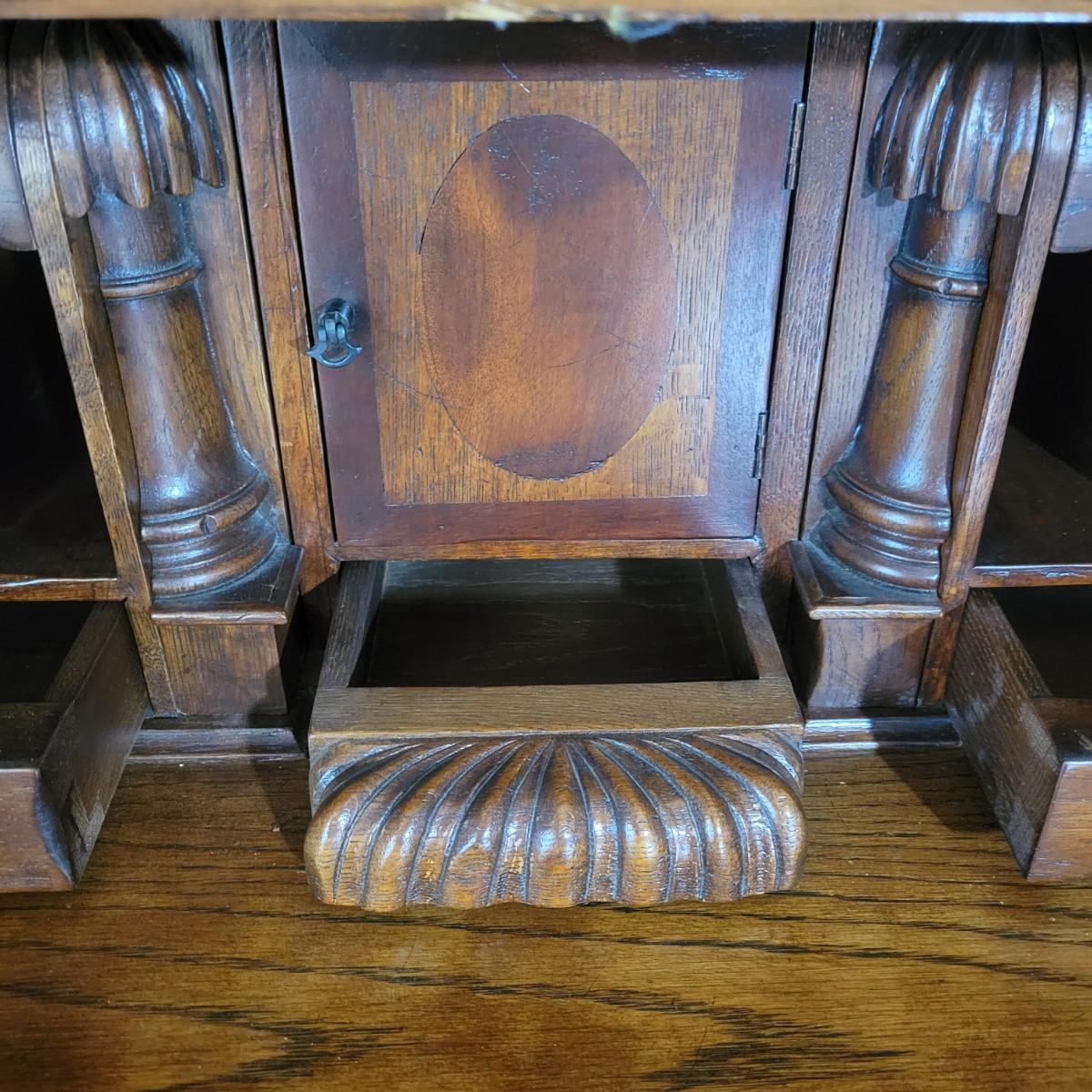 An antique solid wood secretary in good condition with a few minor blemishes. It appears that this piece was likely restored based on its condition and the condition of the wood blemishes. There are no scratches on this piece. This is a five drawer secretary with dovetailed drawers and two shelves in the hutch. The hutch features beveled glass on its doors and a two key locking/latching mechanism. Only the right side still works. The writing desk has a drop down writing surface with a functional locking mechanism. Inside, there are numerous drawers and hidden cubbies. All hardware is brass and there are some carved details on the piece. Measures approximately 41.5" x 22" x 87". The hutch and secretary will separate without tools. The winning bidder will need to bring assistance as this piece is substantial. Local Pickup Only