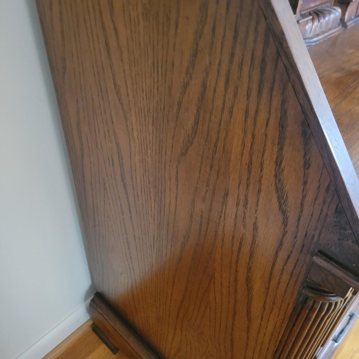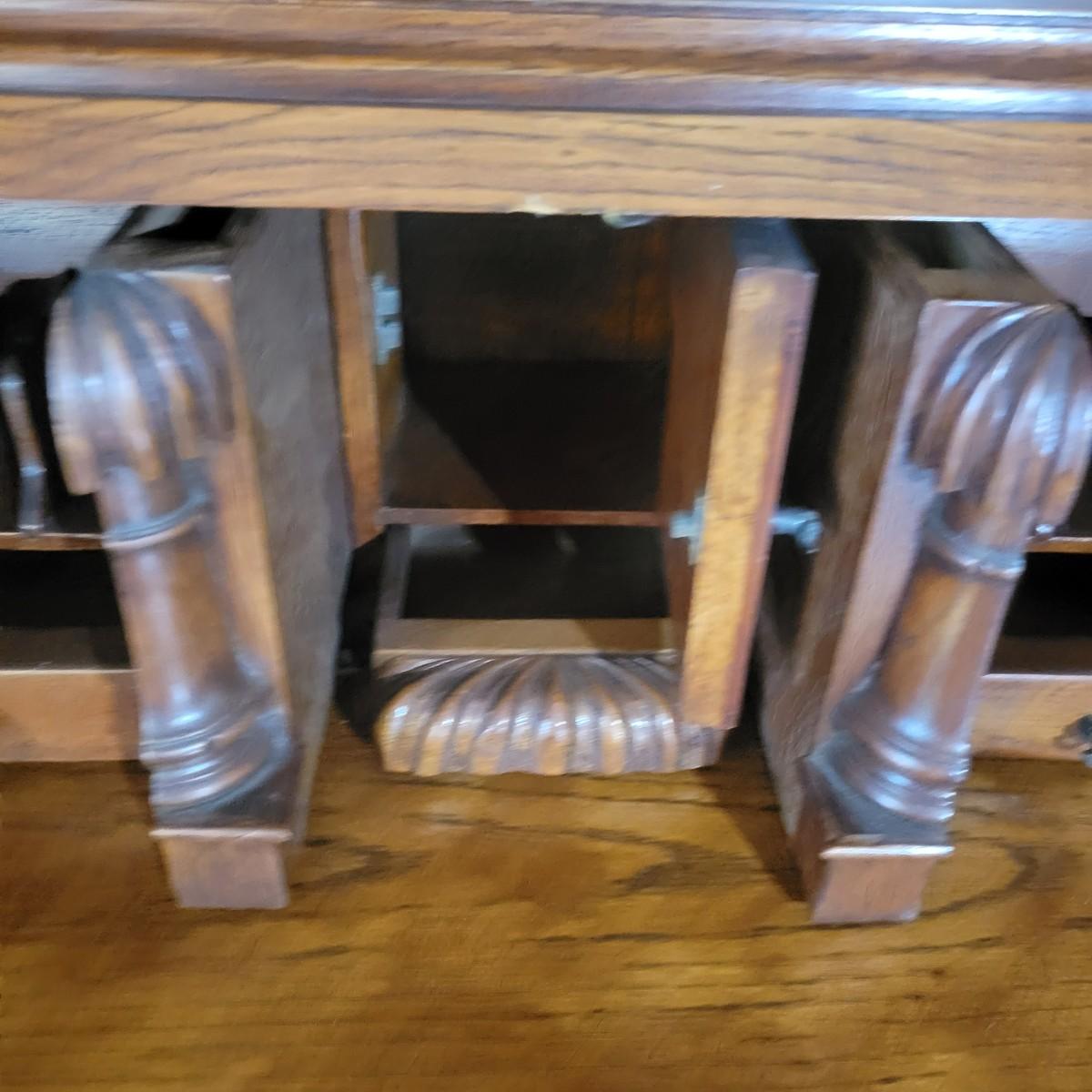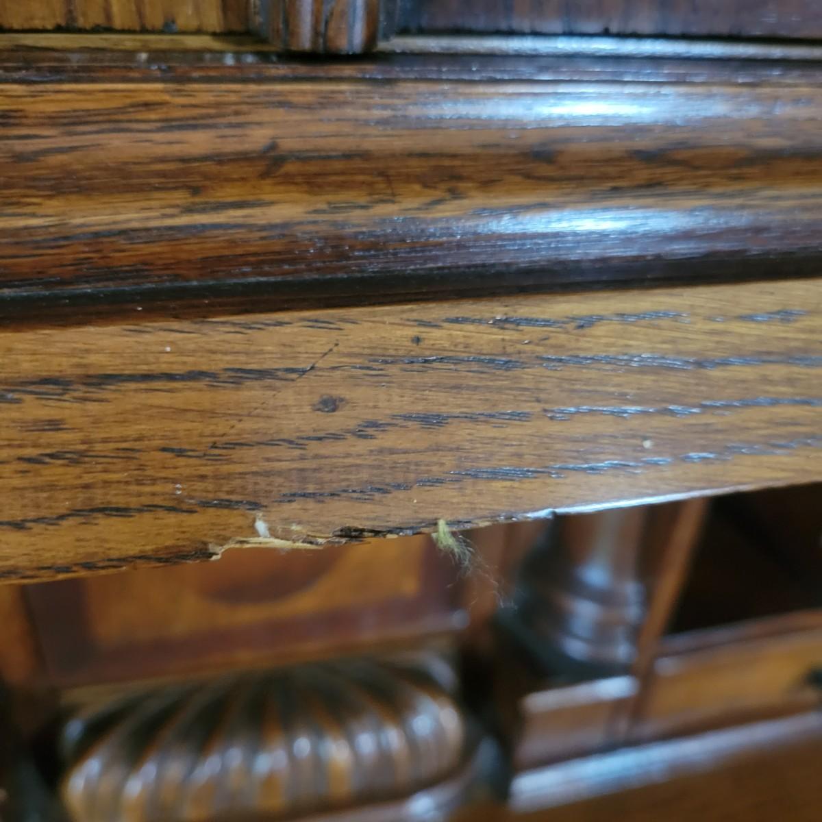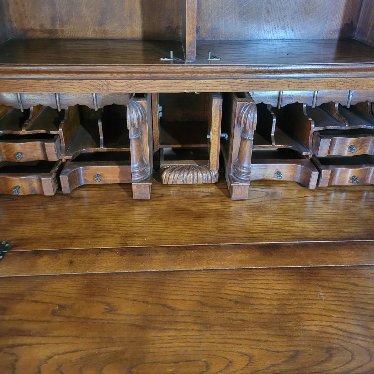 An antique solid wood secretary in good condition with a few minor blemishes. It appears that this piece was likely restored based on its condition and the condition of the wood blemishes. There are no scratches on this piece. This is a five drawer secretary with dovetailed drawers and two shelves in the hutch. The hutch features beveled glass on its doors and a two key locking/latching mechanism. Only the right side still works. The writing desk has a drop down writing surface with a functional locking mechanism. Inside, there are numerous drawers and hidden cubbies. All hardware is brass and there are some carved details on the piece. Measures approximately 41.5" x 22" x 87". The hutch and secretary will separate without tools. The winning bidder will need to bring assistance as this piece is substantial. Local Pickup Only