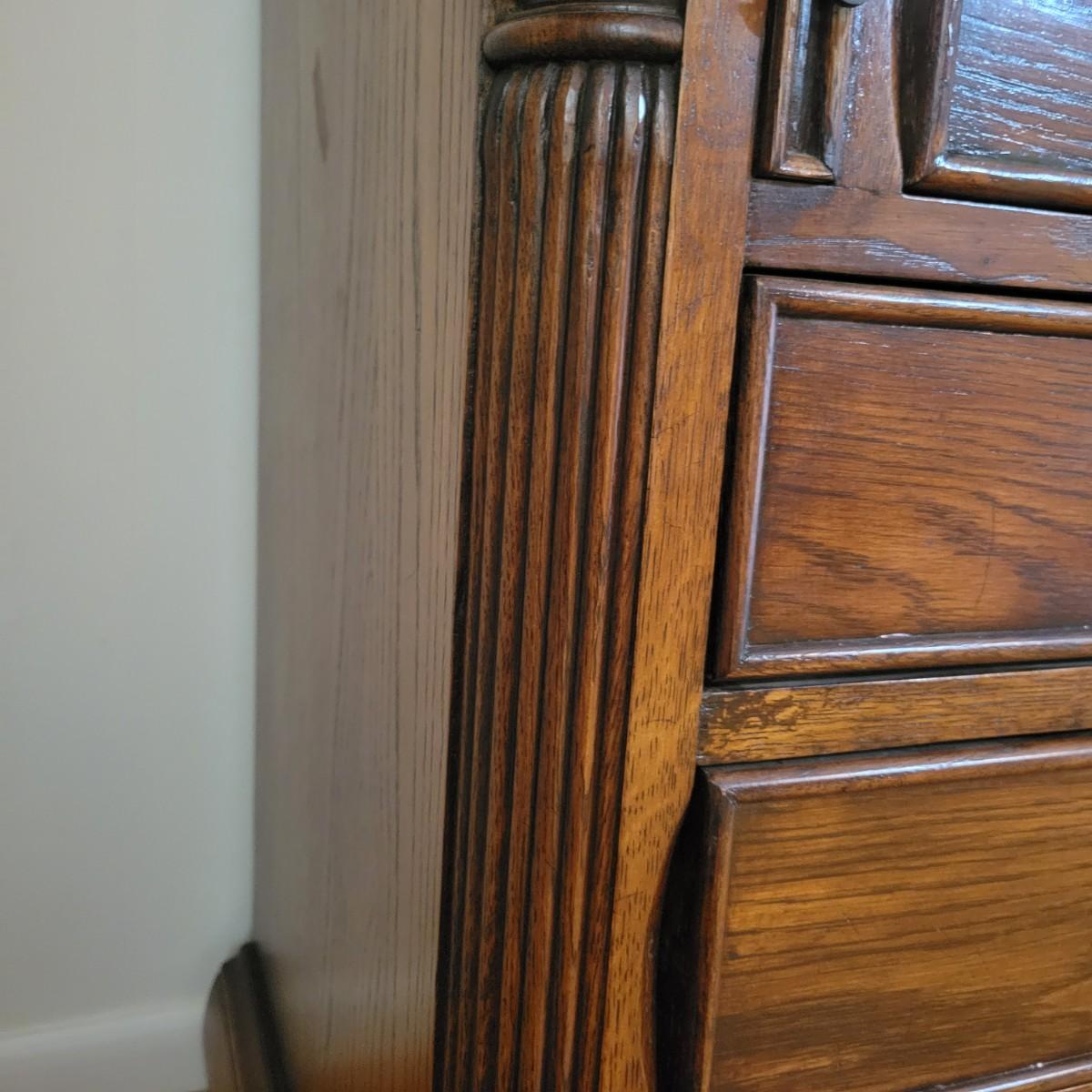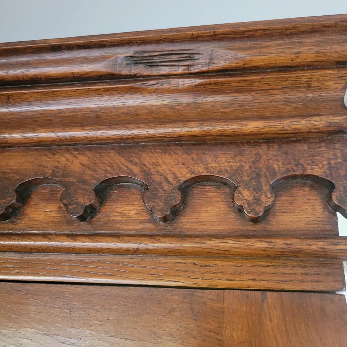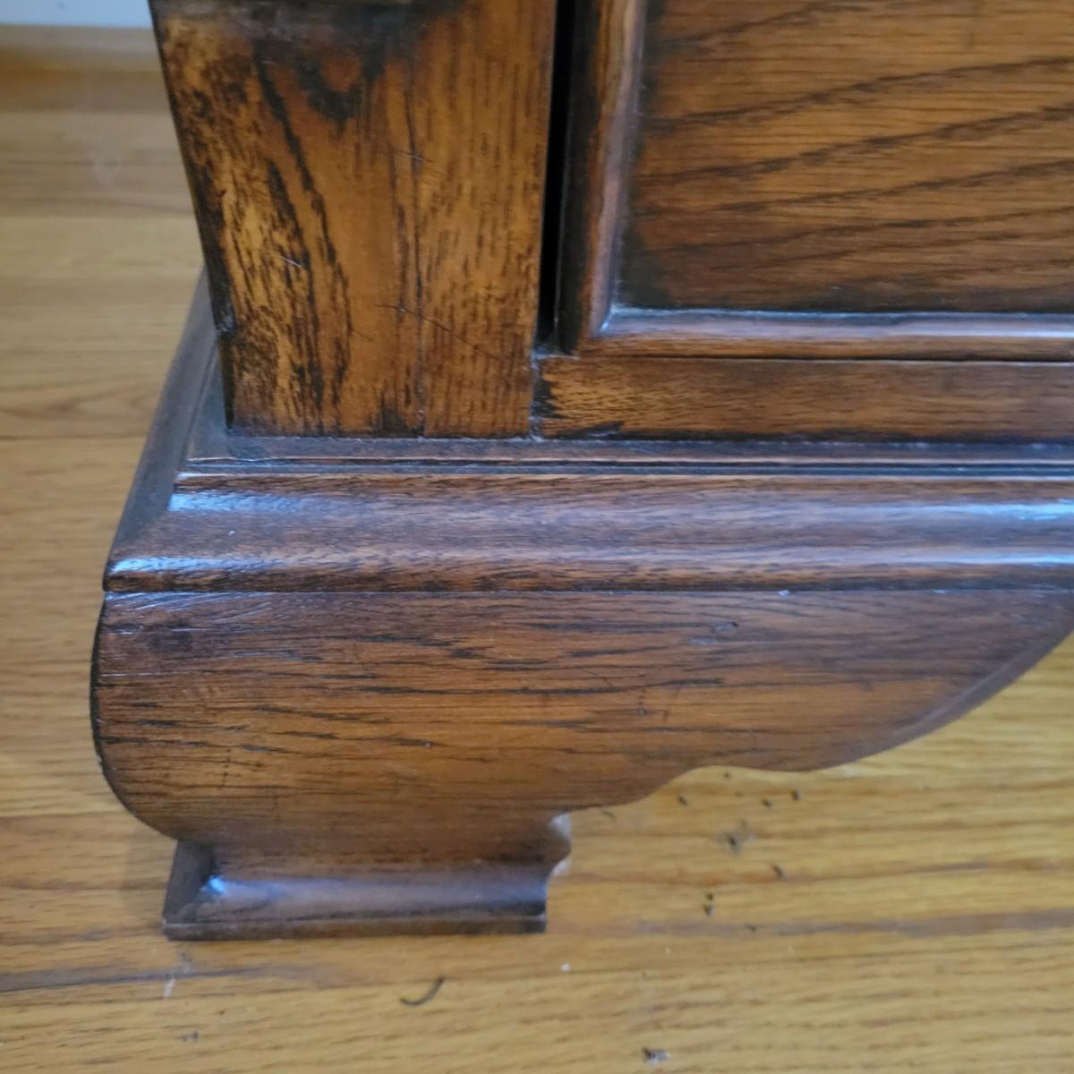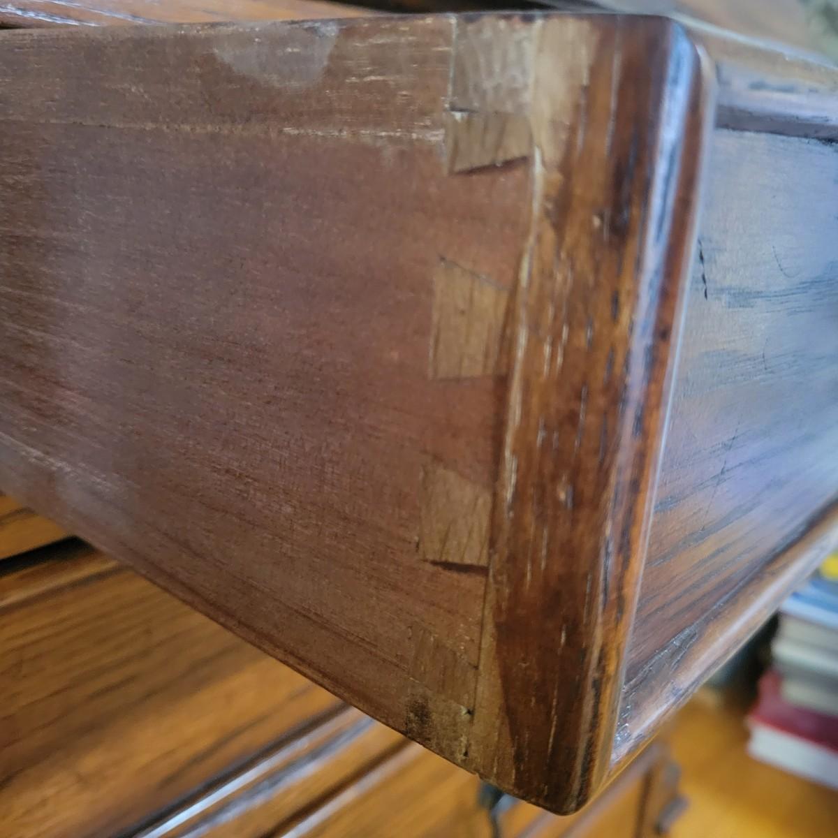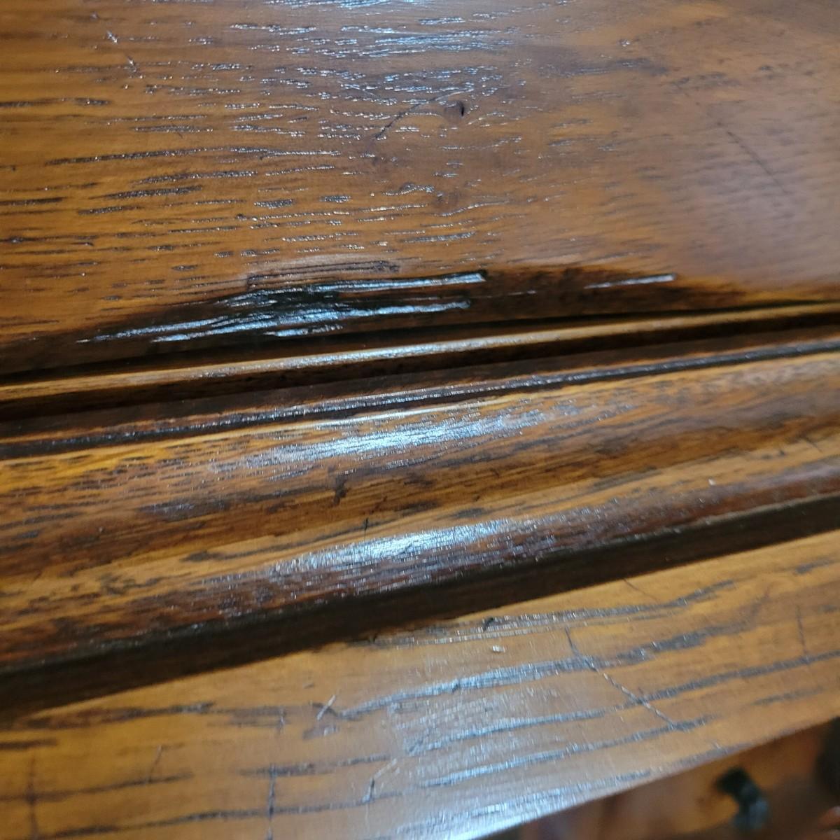 An antique solid wood secretary in good condition with a few minor blemishes. It appears that this piece was likely restored based on its condition and the condition of the wood blemishes. There are no scratches on this piece. This is a five drawer secretary with dovetailed drawers and two shelves in the hutch. The hutch features beveled glass on its doors and a two key locking/latching mechanism. Only the right side still works. The writing desk has a drop down writing surface with a functional locking mechanism. Inside, there are numerous drawers and hidden cubbies. All hardware is brass and there are some carved details on the piece. Measures approximately 41.5" x 22" x 87". The hutch and secretary will separate without tools. The winning bidder will need to bring assistance as this piece is substantial. Local Pickup Only