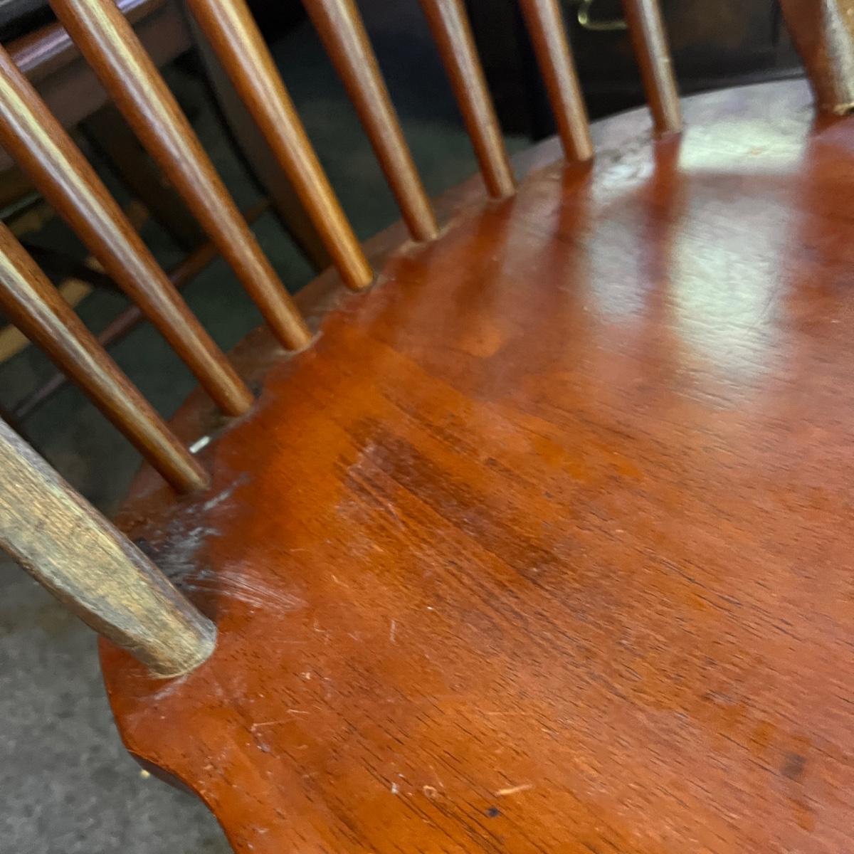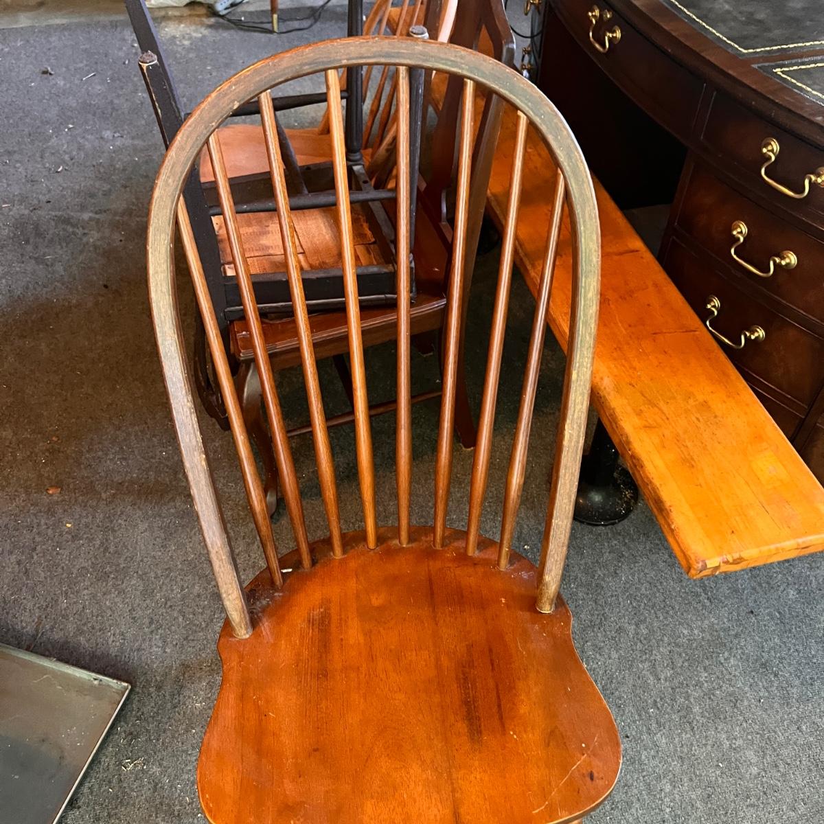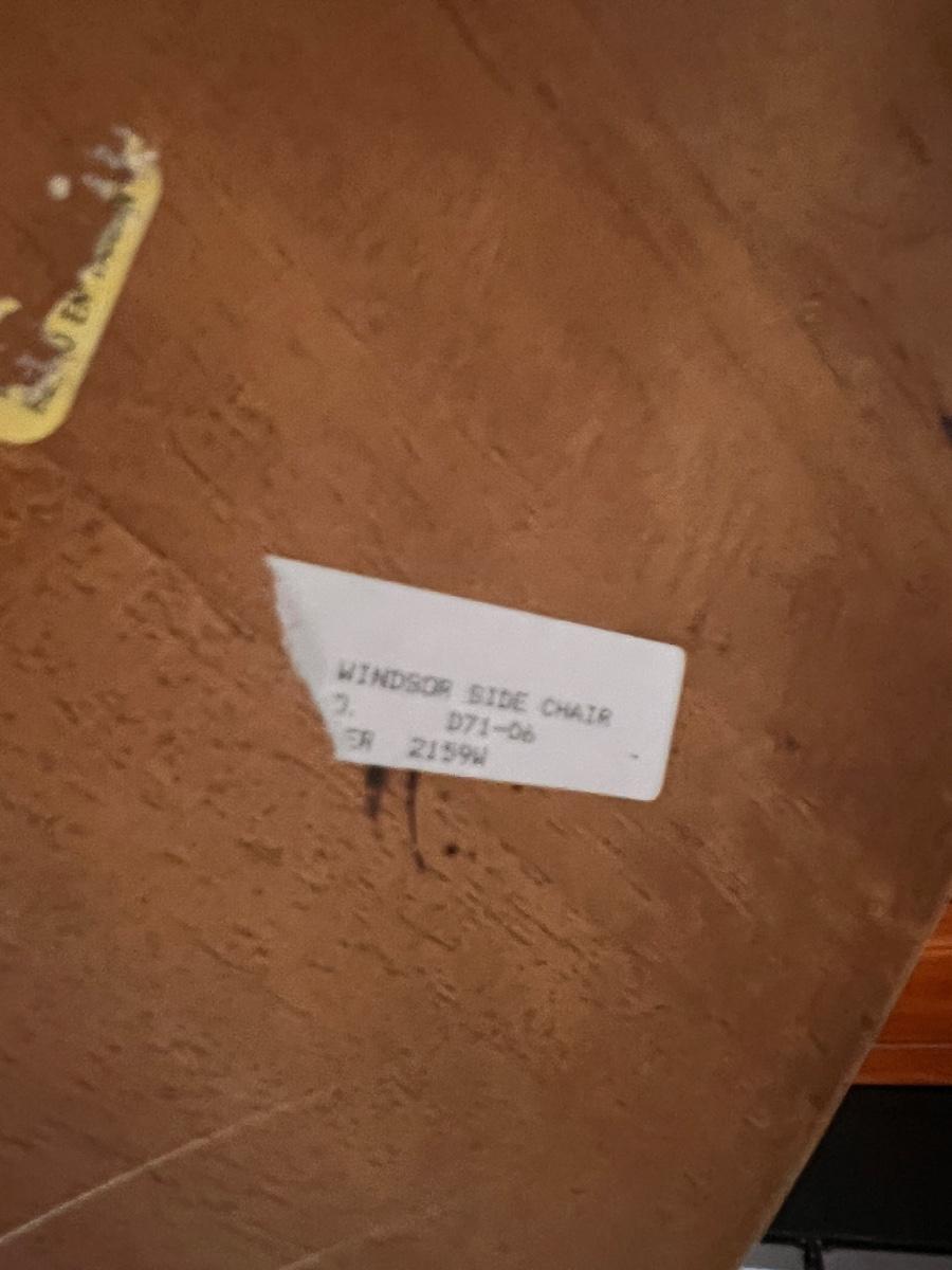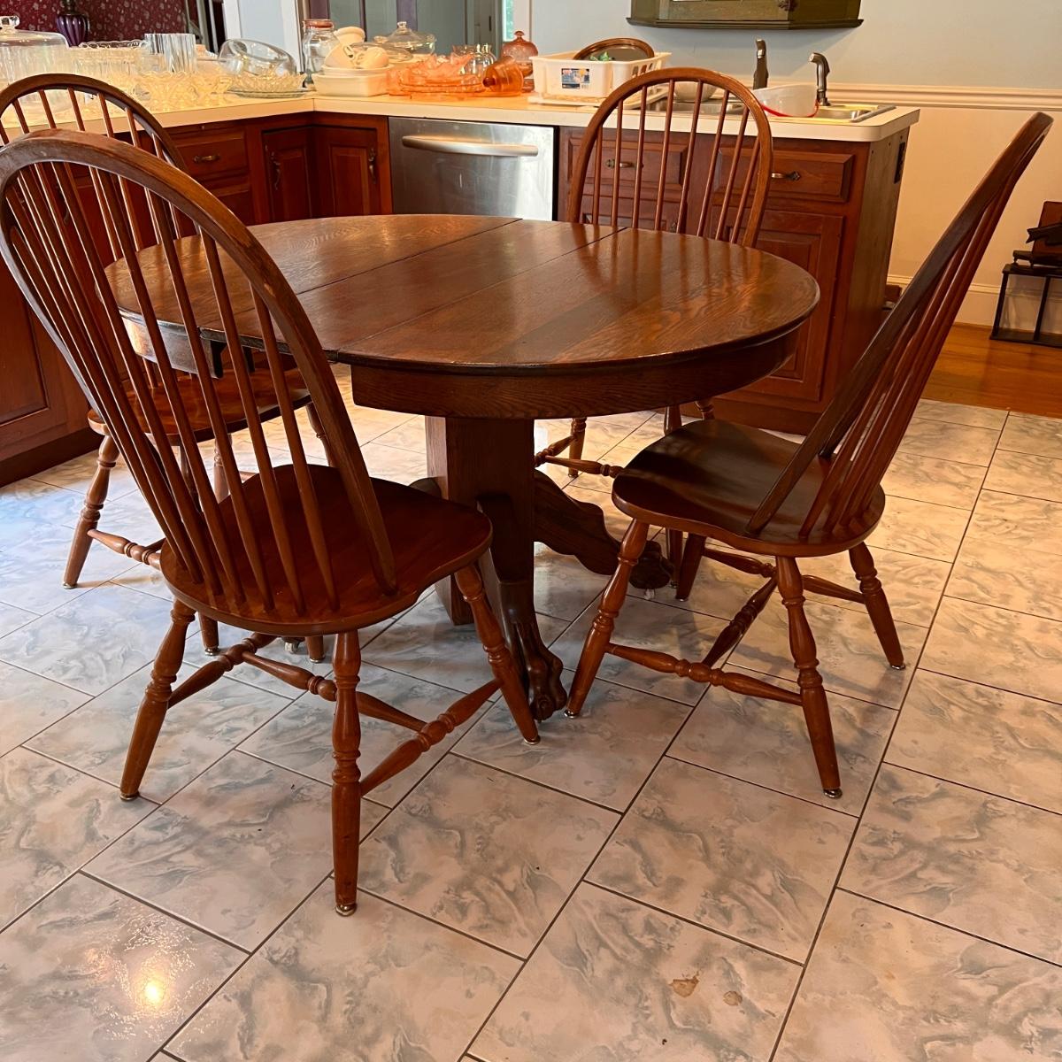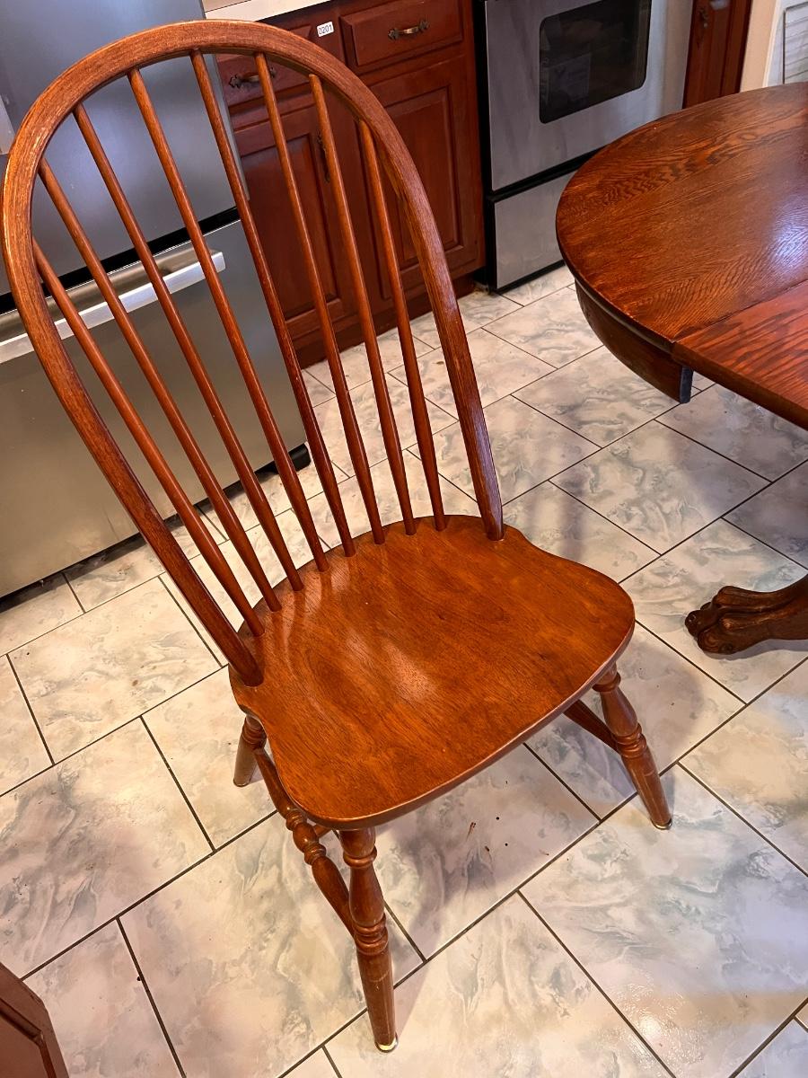 It comes with 5 oak Windsor chairs (4 in good used condition and 1 extra chair that has a spindle loose and shows more wear)