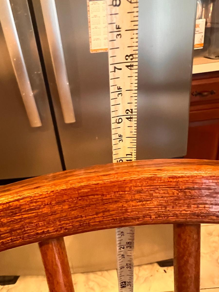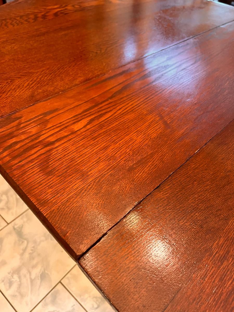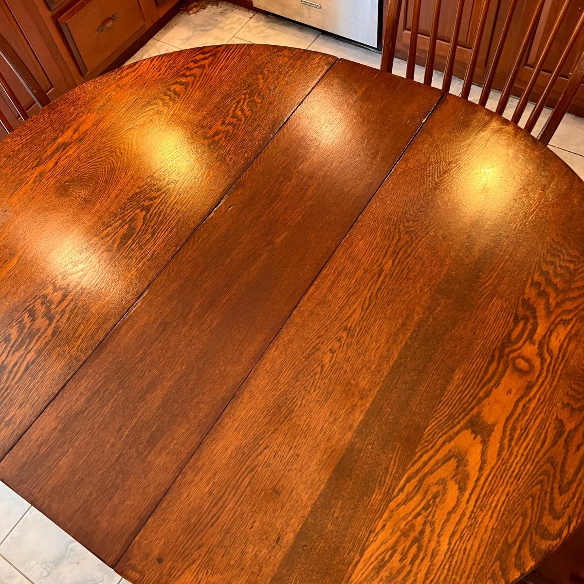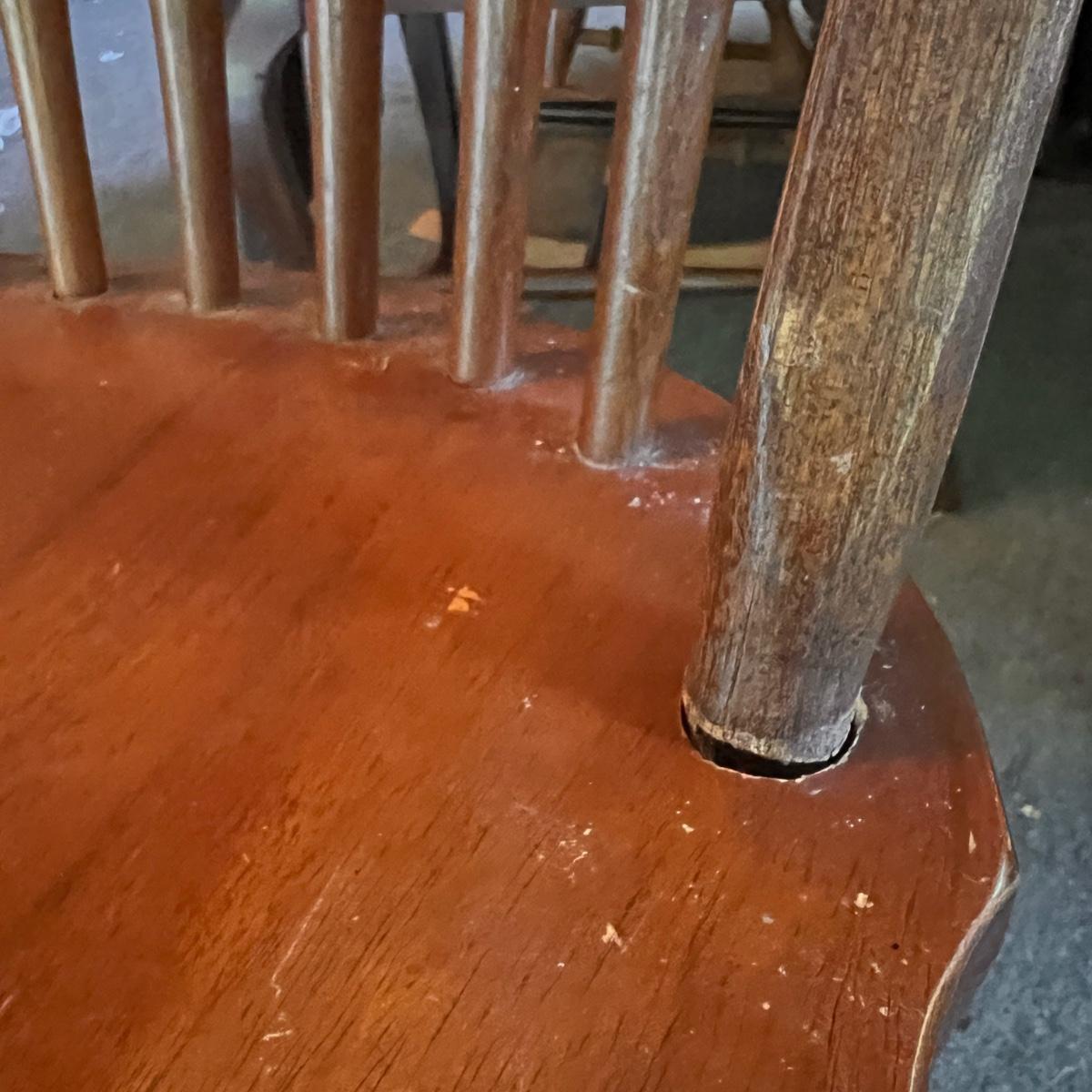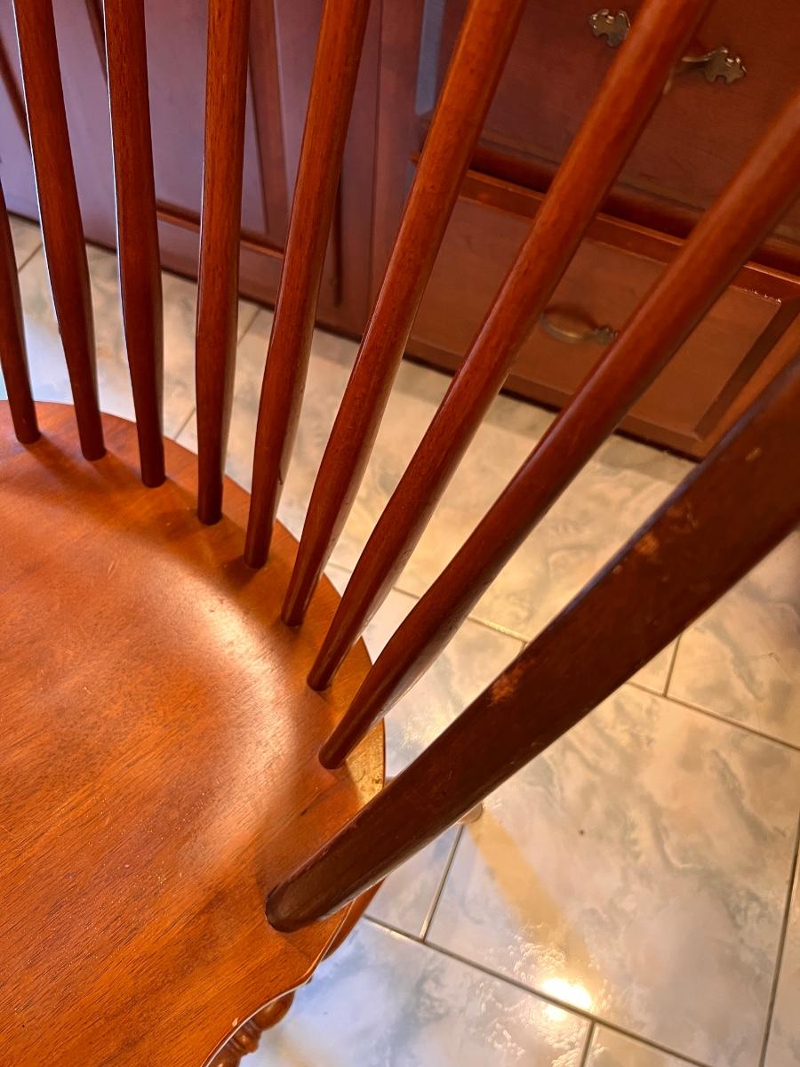 It comes with 5 oak Windsor chairs (4 in good used condition and 1 extra chair that has a spindle loose and shows more wear)