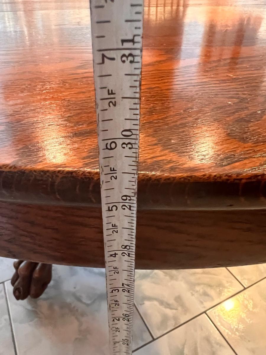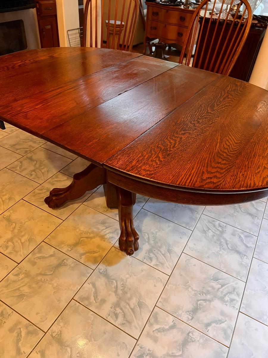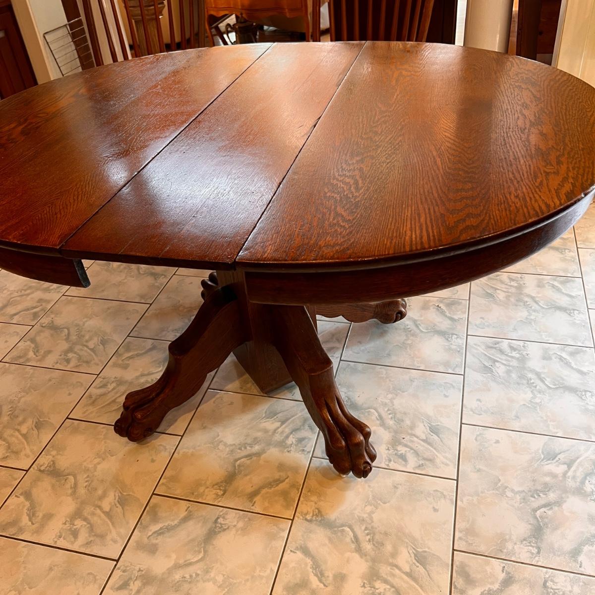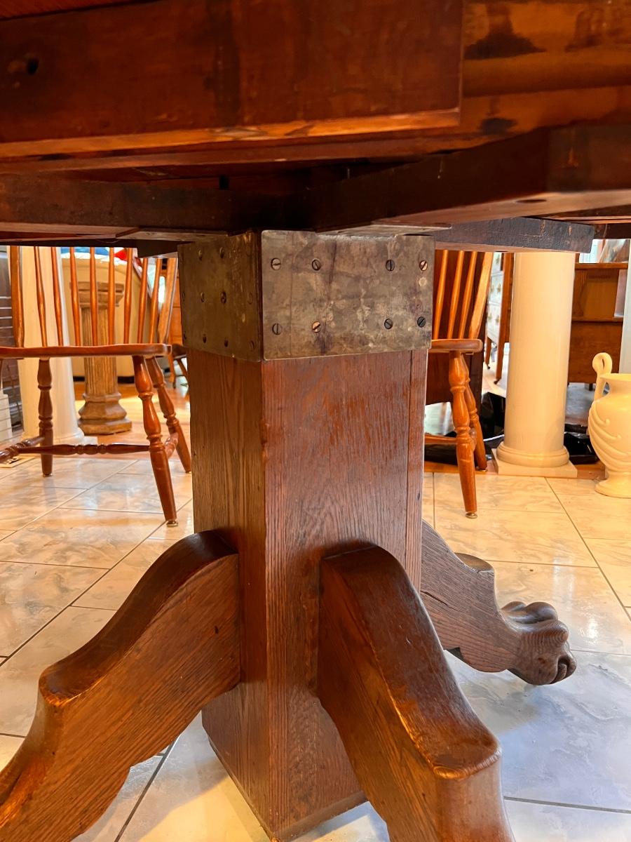 Antique oak table from the turn of the century. , would be the perfect addition for small or larger gatherings. In its closed position the table measures, 29.50 inches high, 42" diameter. With its additional leaf, 52" x 42" and with both leaves its 62" x 42". Constructed out of beautiful solid oak the table has a steamed bent solid oak skirt and straight-line pedestal supported by curved feet with casters. 1 of the feet has a hole in the wood as shown in pics.