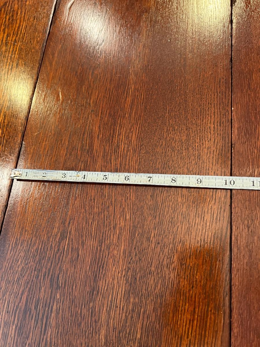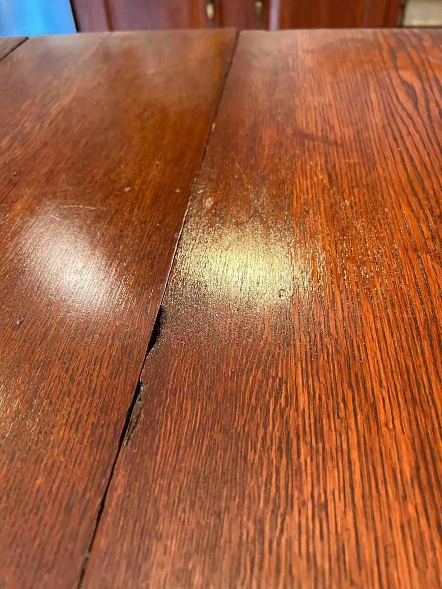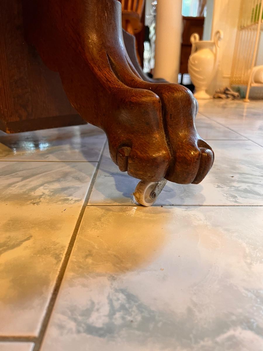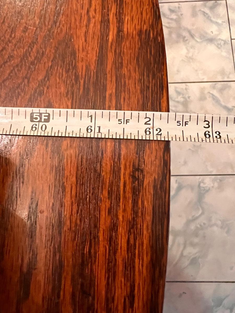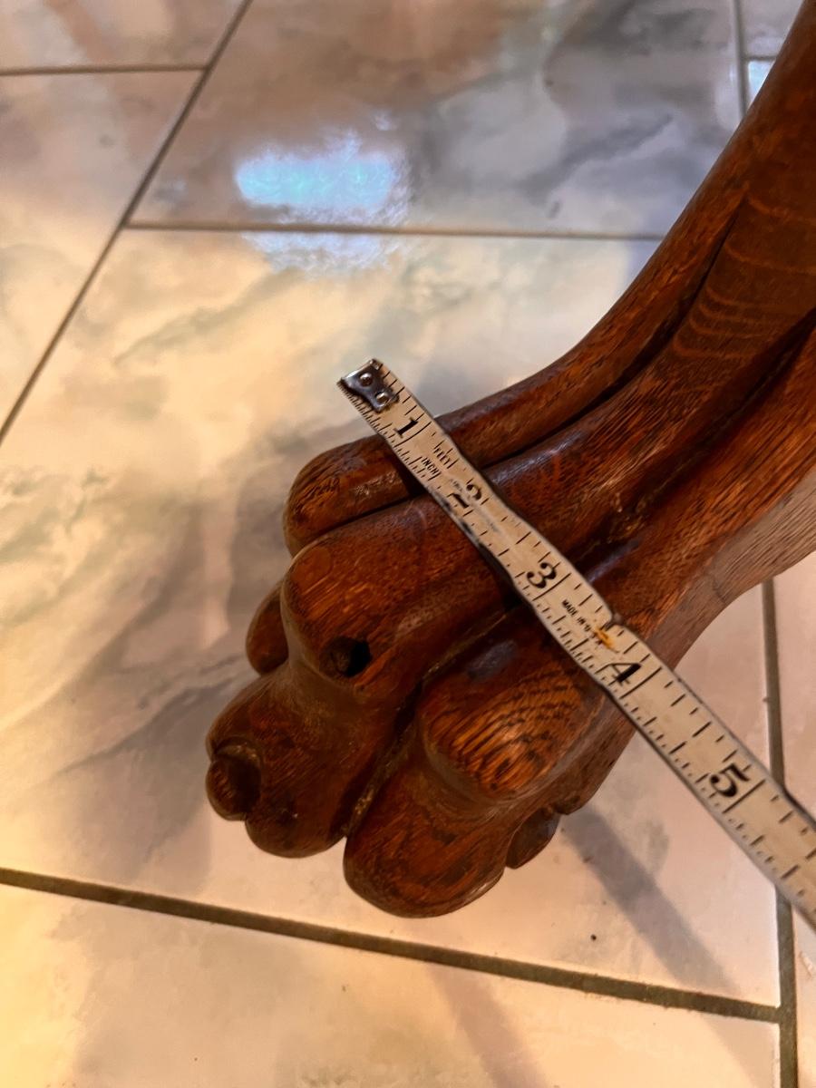 Antique oak table from the turn of the century. , would be the perfect addition for small or larger gatherings. In its closed position the table measures, 29.50 inches high, 42" diameter. With its additional leaf, 52" x 42" and with both leaves its 62" x 42". Constructed out of beautiful solid oak the table has a steamed bent solid oak skirt and straight-line pedestal supported by curved feet with casters. 1 of the feet has a hole in the wood as shown in pics.