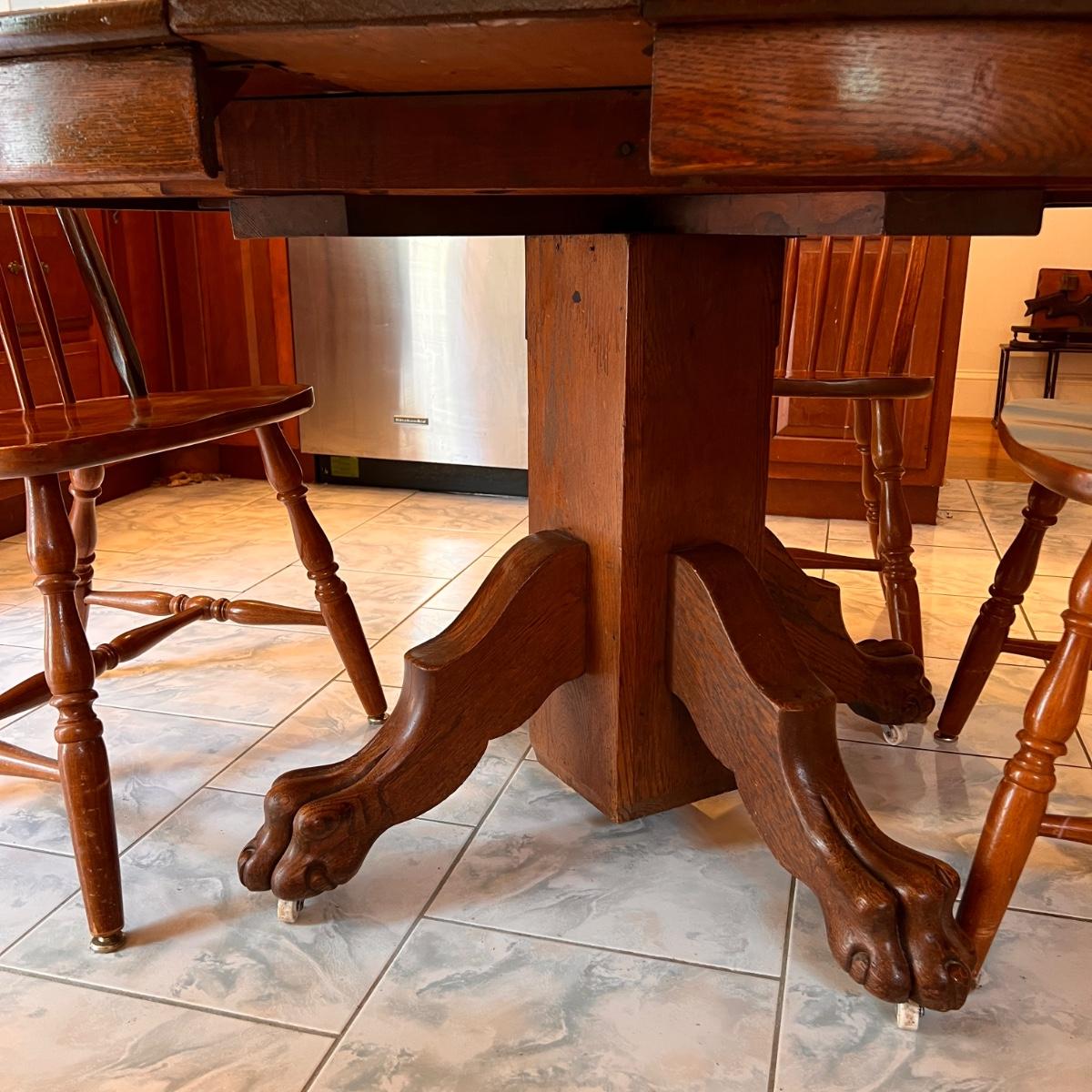 Antique Solid Oak Pedestal Table w/ 2 Leaves + 5 Windsor Chairs