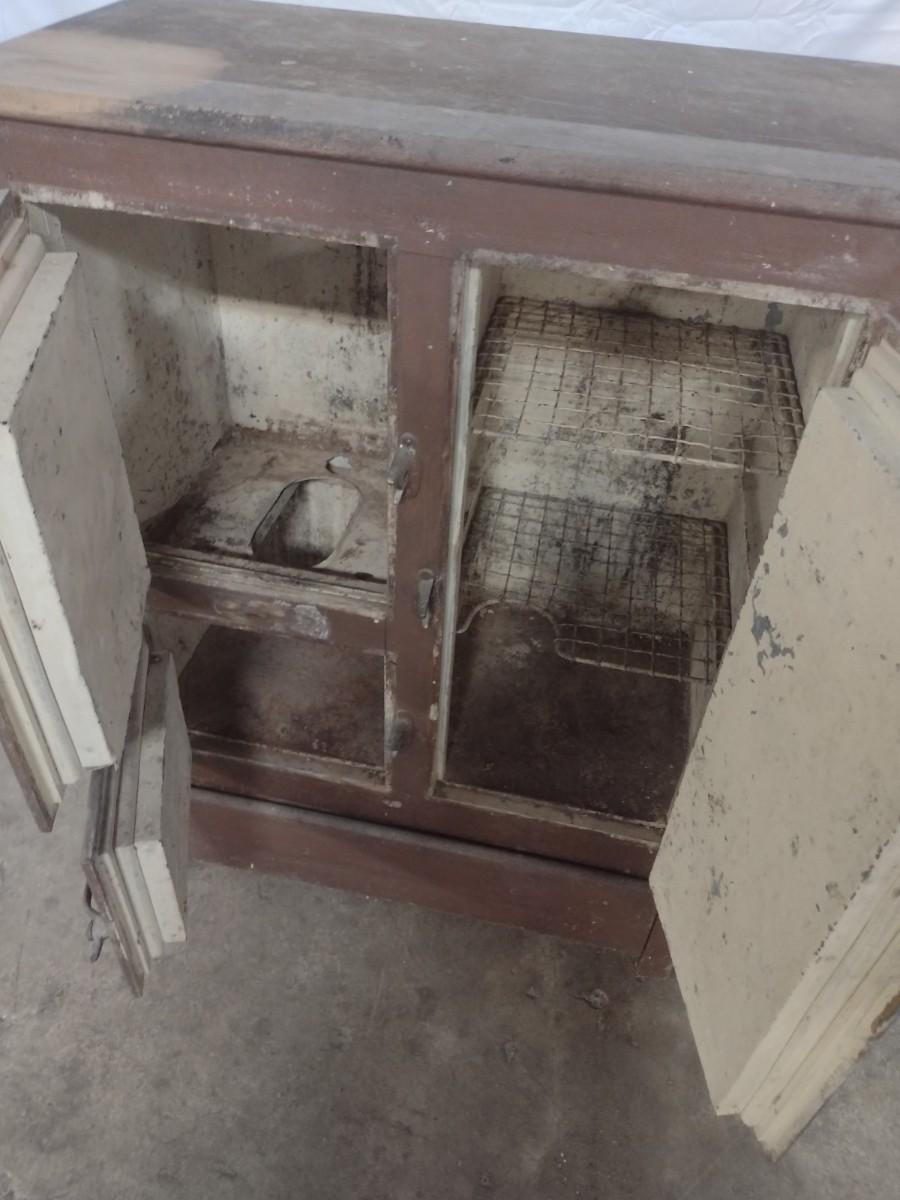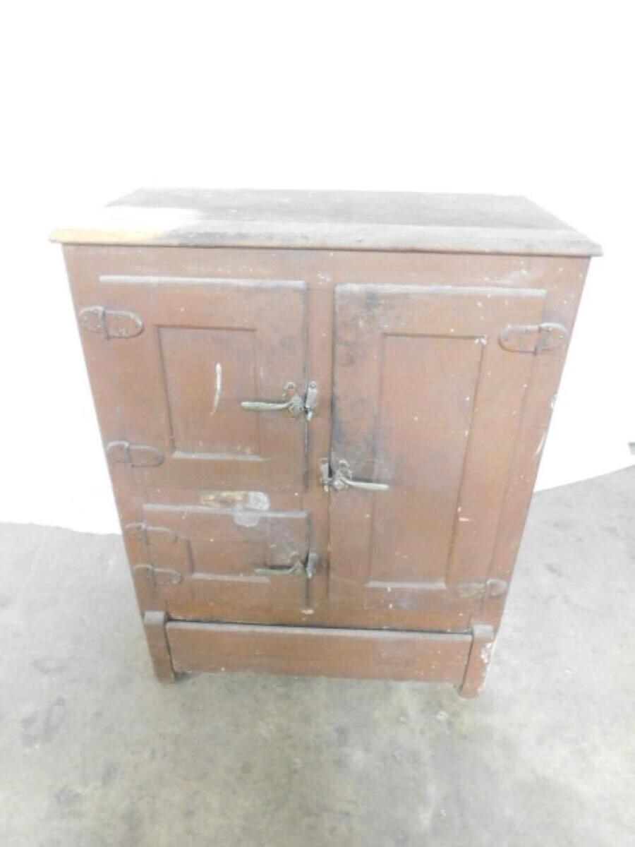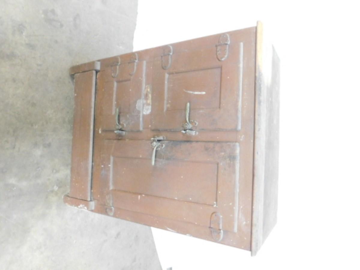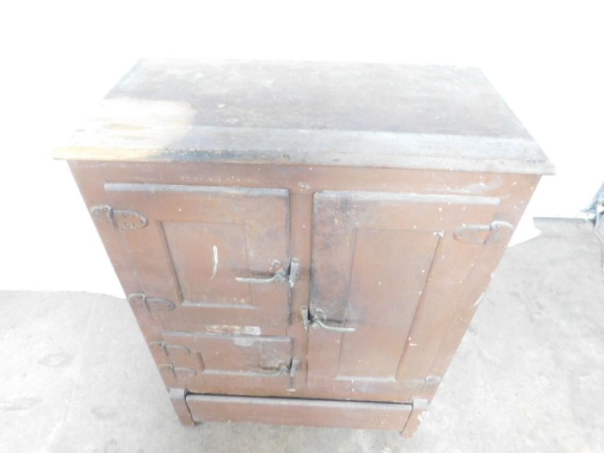 Antique Solid Wood Three Door Ice Box has been painted with some removed from the top surface as shown