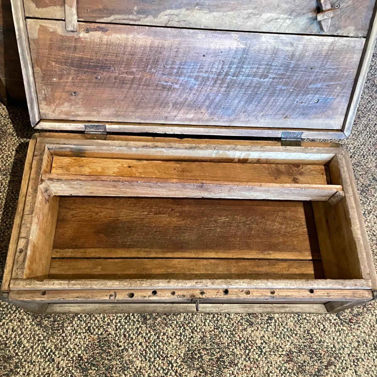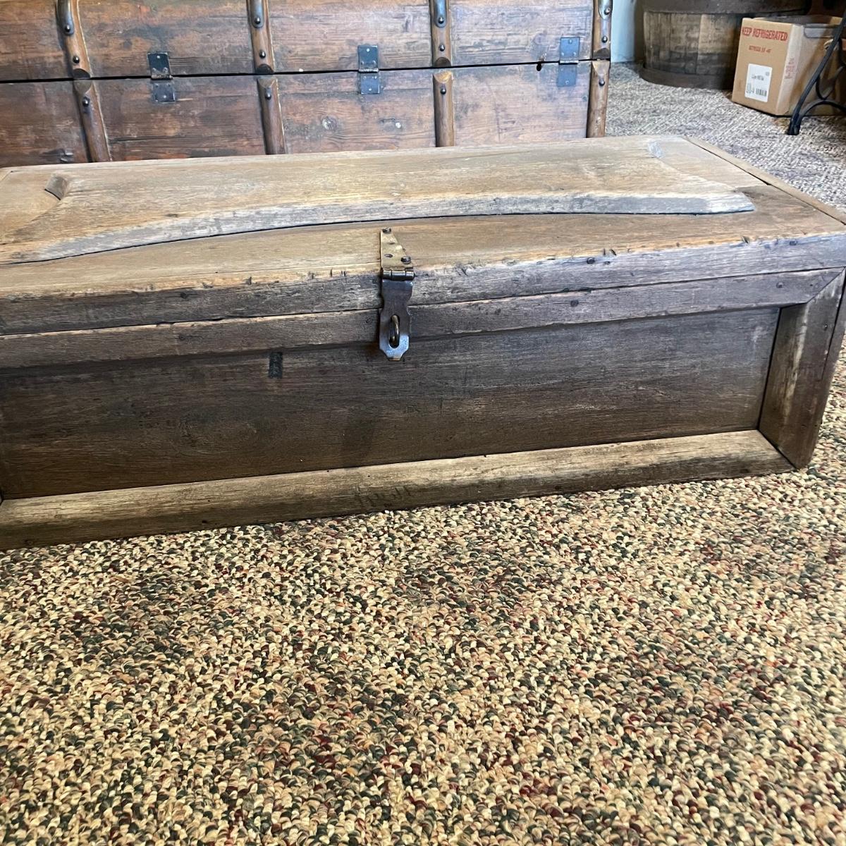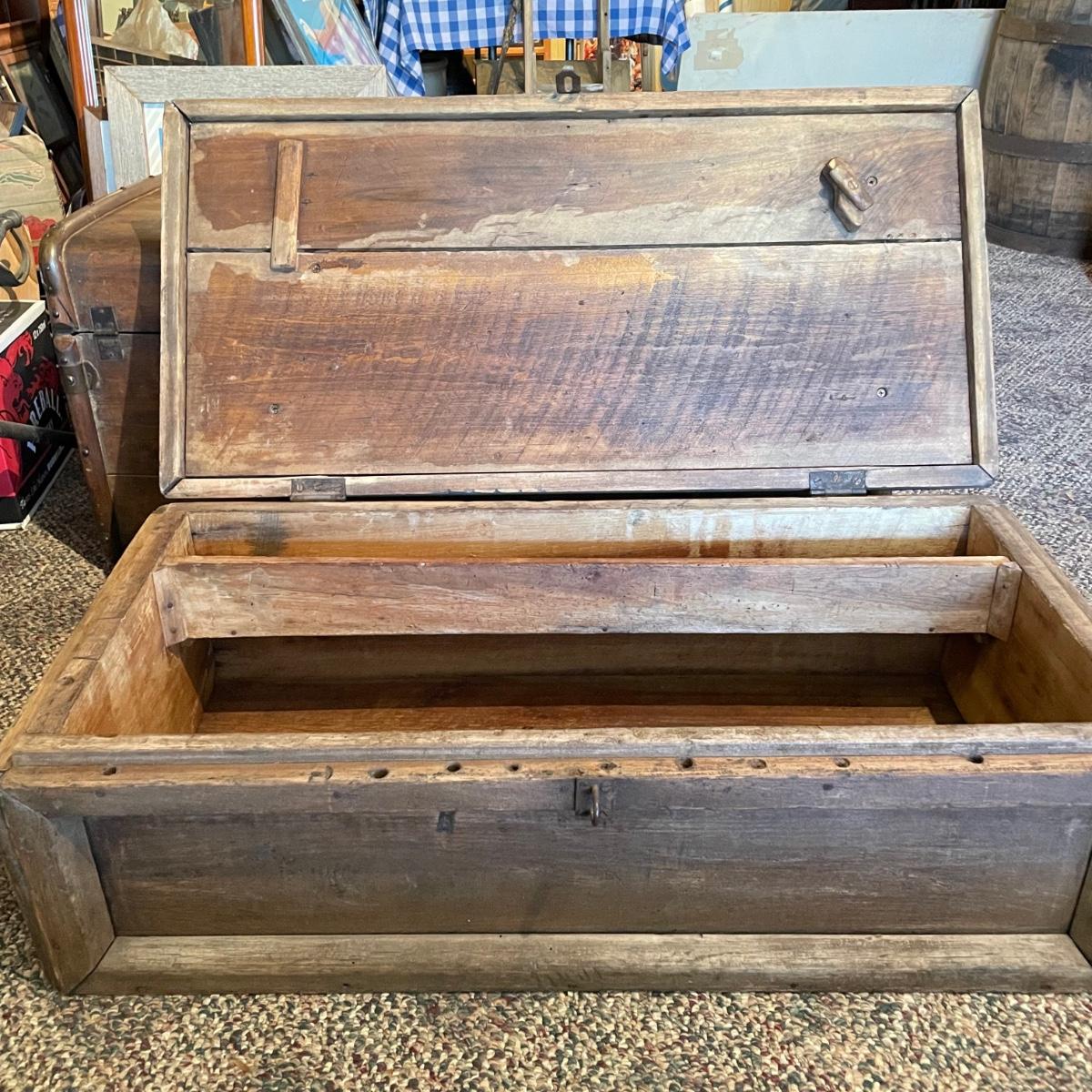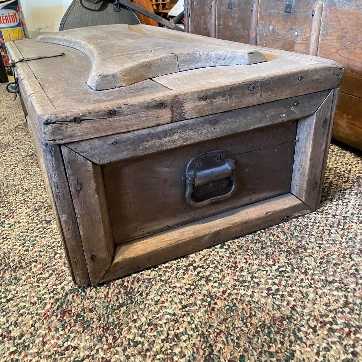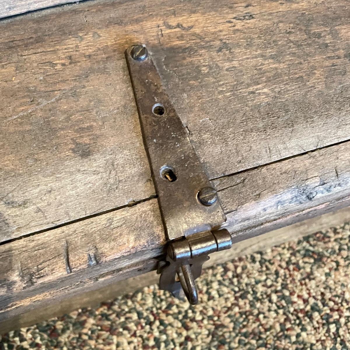Here is a heavy solid wood antique trunk with cast iron handles and other metal hardware. Inside the trunk, one small two-piece organizer shelf that is removable. Trunk measures 37.5” x 18.5” x 12”. There is a primitive hinge attached to the inside of the lid and an inch tall, 30” long wooden design attached to the lid. See images. Local pick up only.