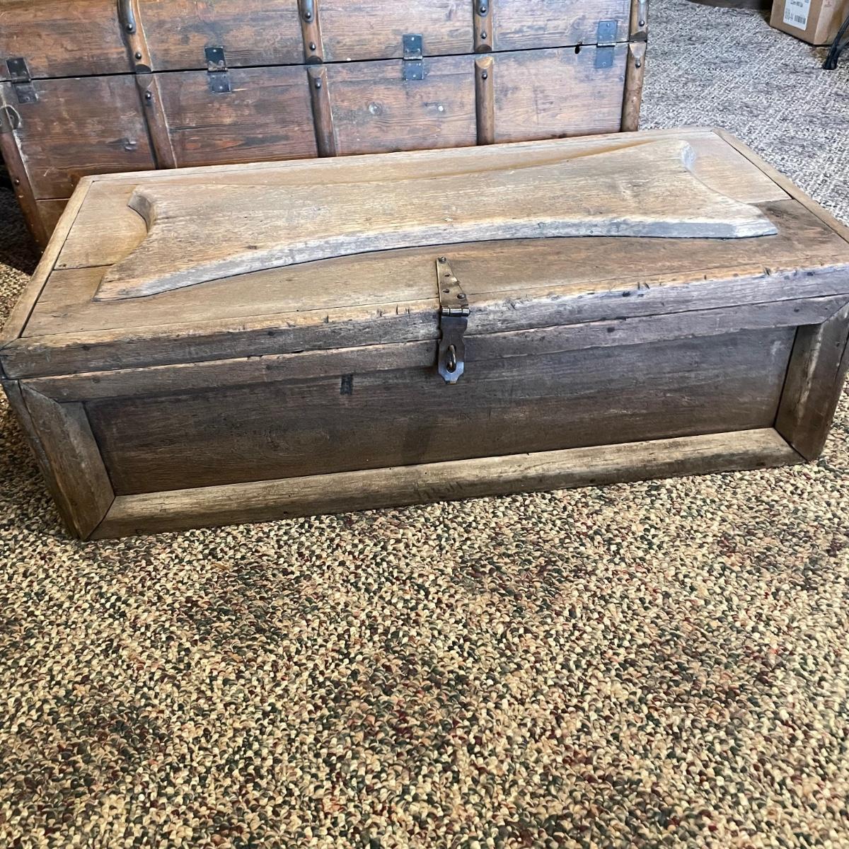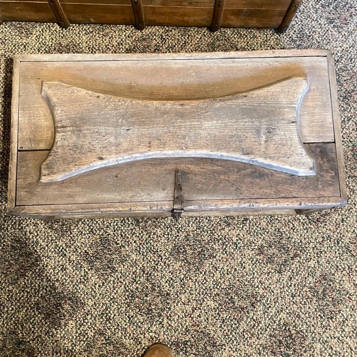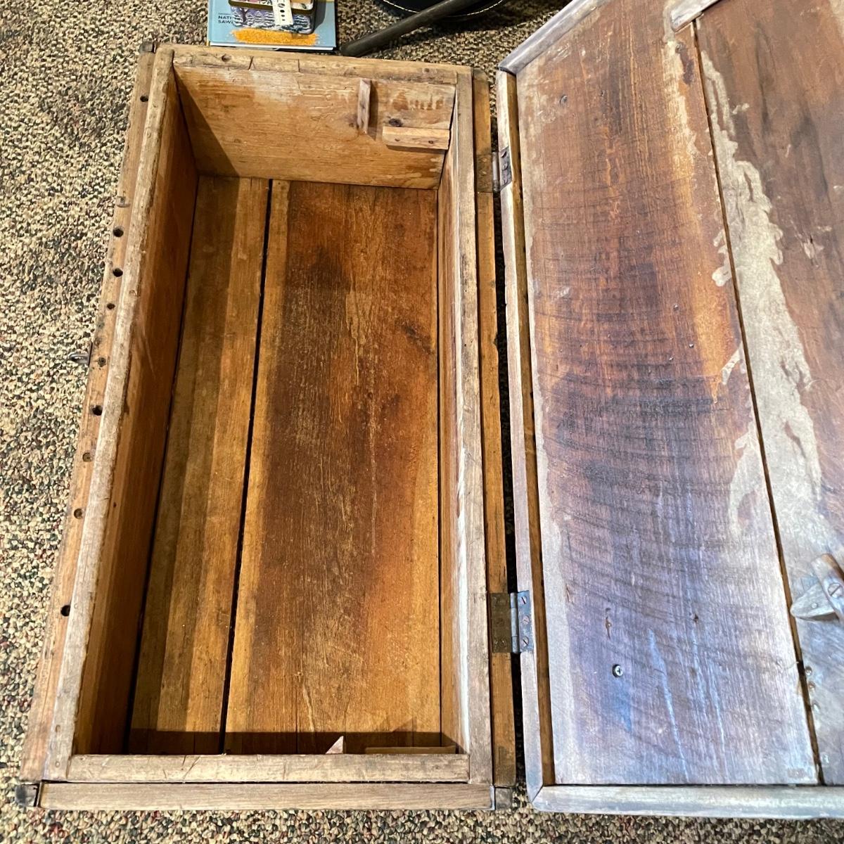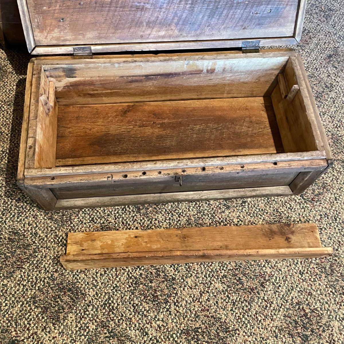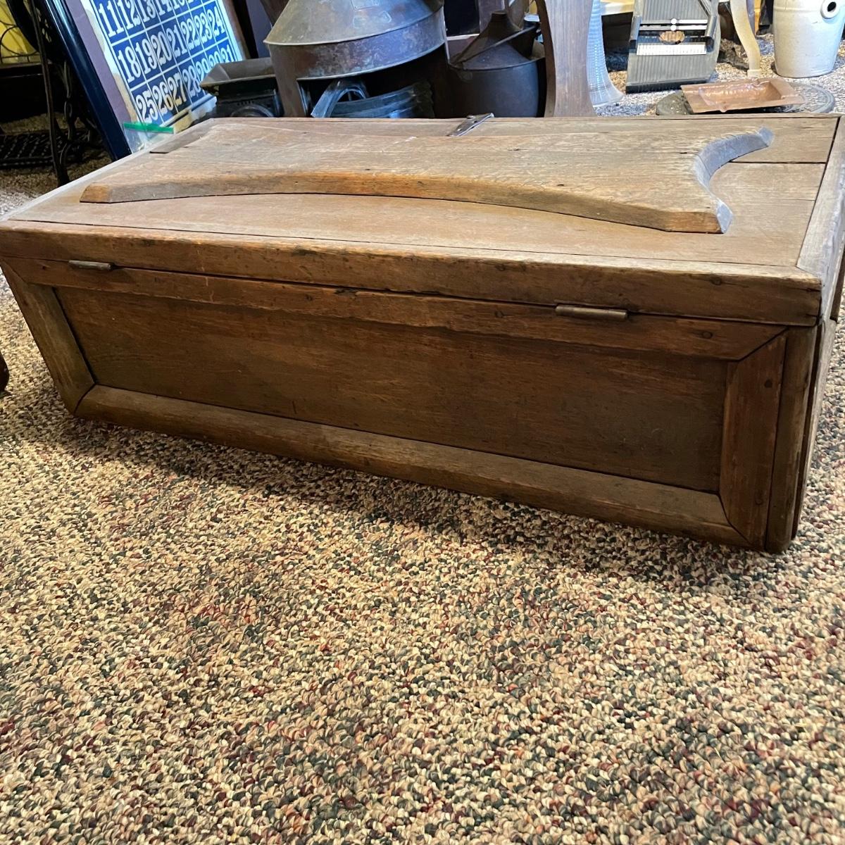 Here is a heavy solid wood antique trunk with cast iron handles and other metal hardware. Inside the trunk, one small two-piece organizer shelf that is removable. Trunk measures 37.5” x 18.5” x 12”. There is a primitive hinge attached to the inside of the lid and an inch tall, 30” long wooden design attached to the lid. See images. Local pick up only.
