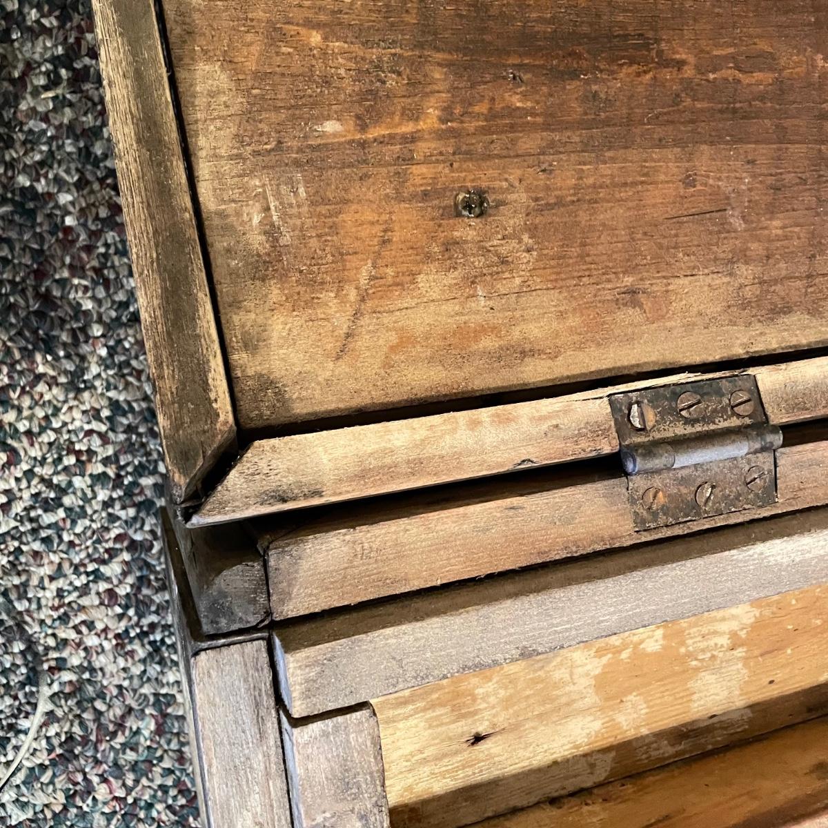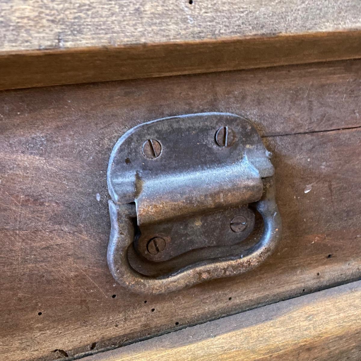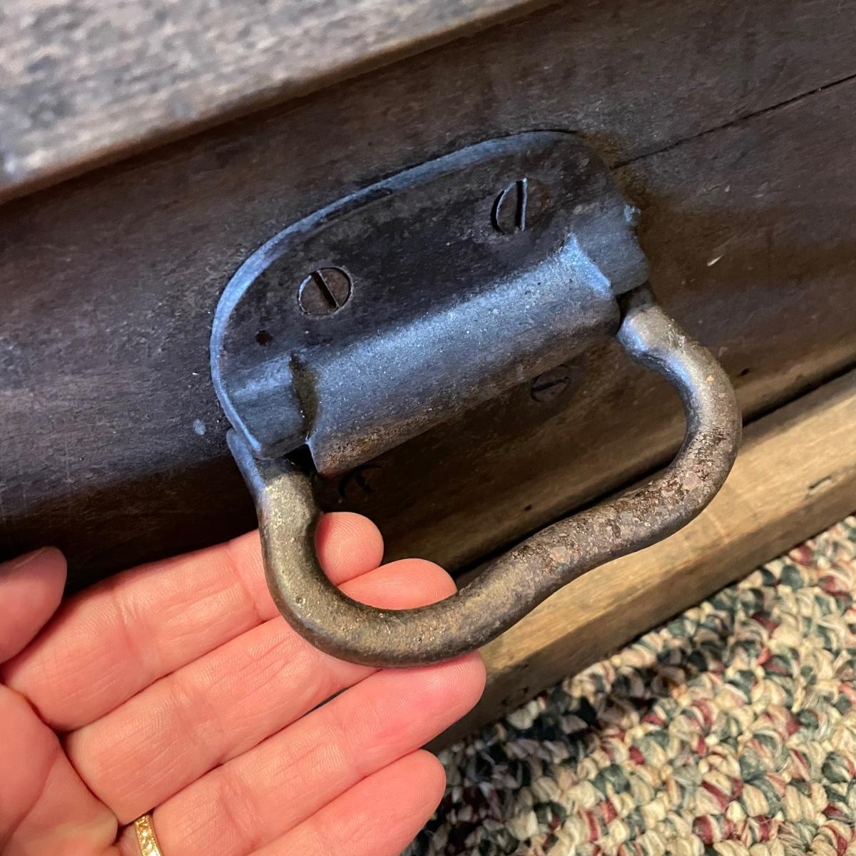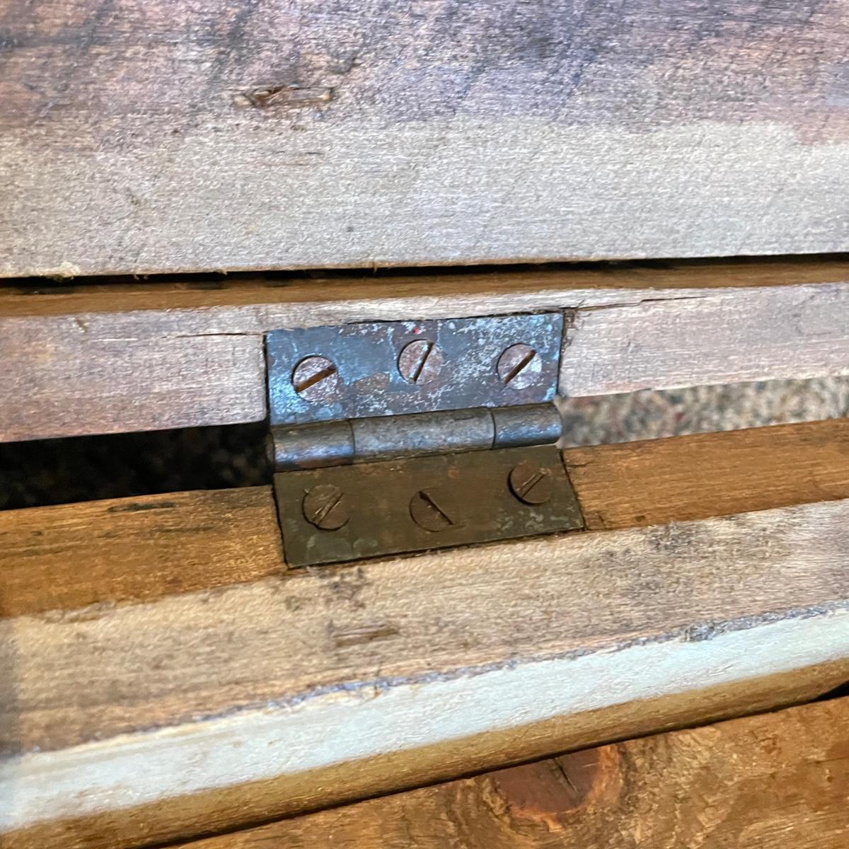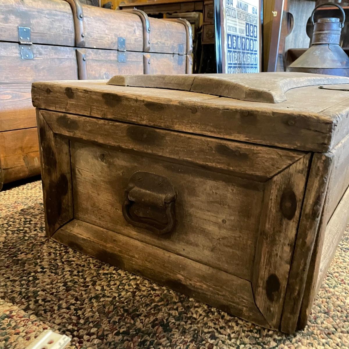 Here is a heavy solid wood antique trunk with cast iron handles and other metal hardware. Inside the trunk, one small two-piece organizer shelf that is removable. Trunk measures 37.5” x 18.5” x 12”. There is a primitive hinge attached to the inside of the lid and an inch tall, 30” long wooden design attached to the lid. See images. Local pick up only.