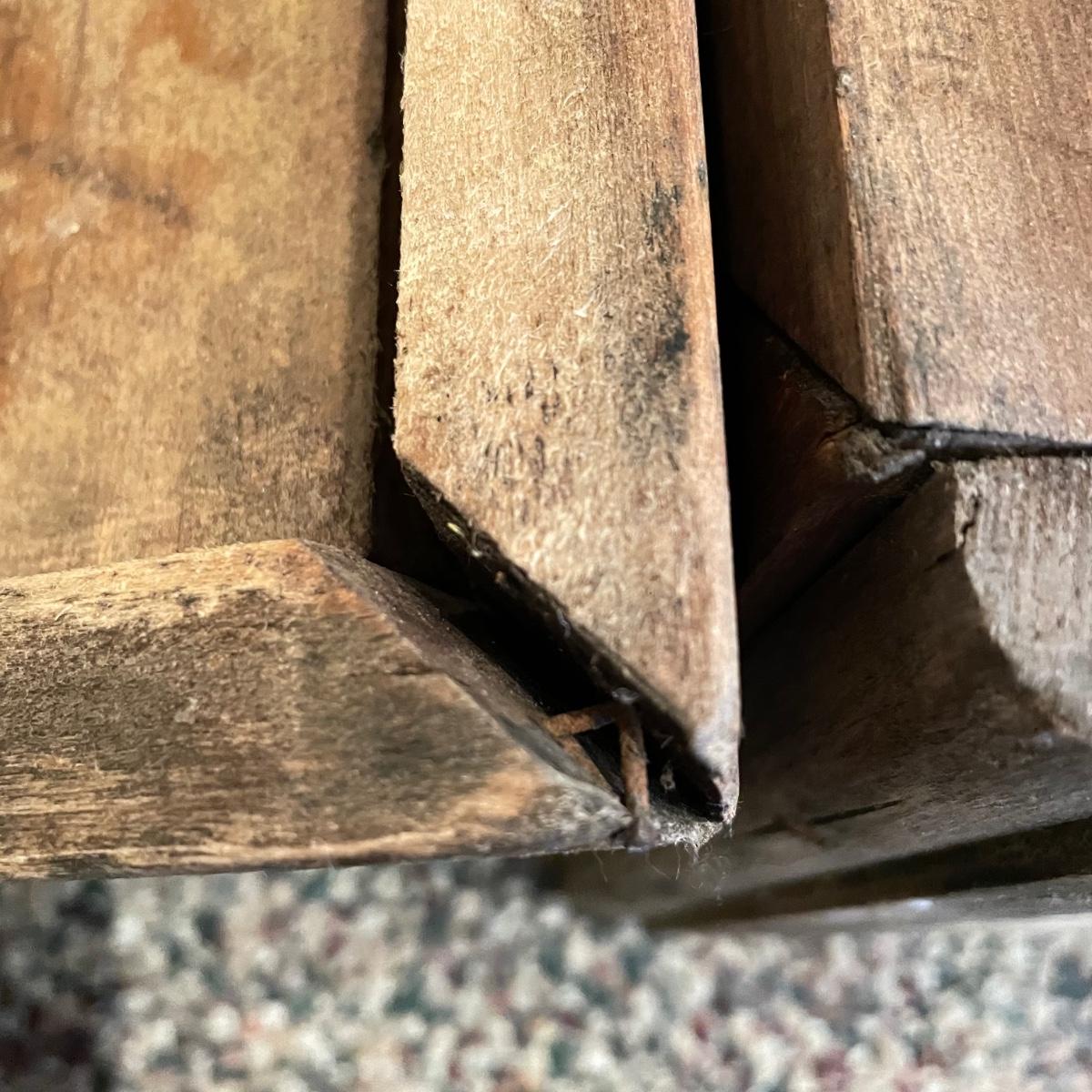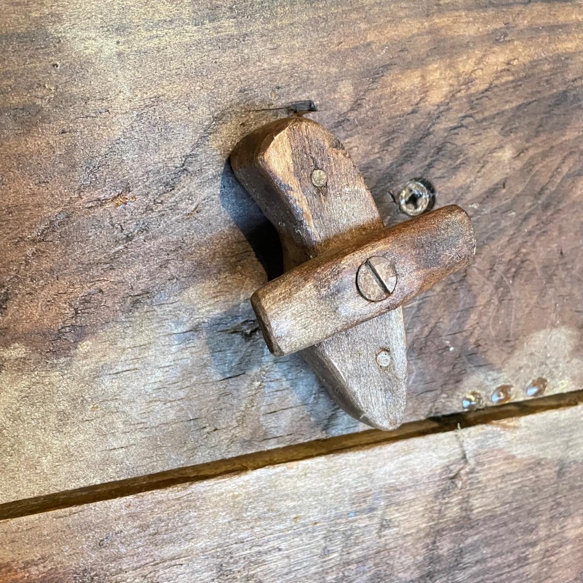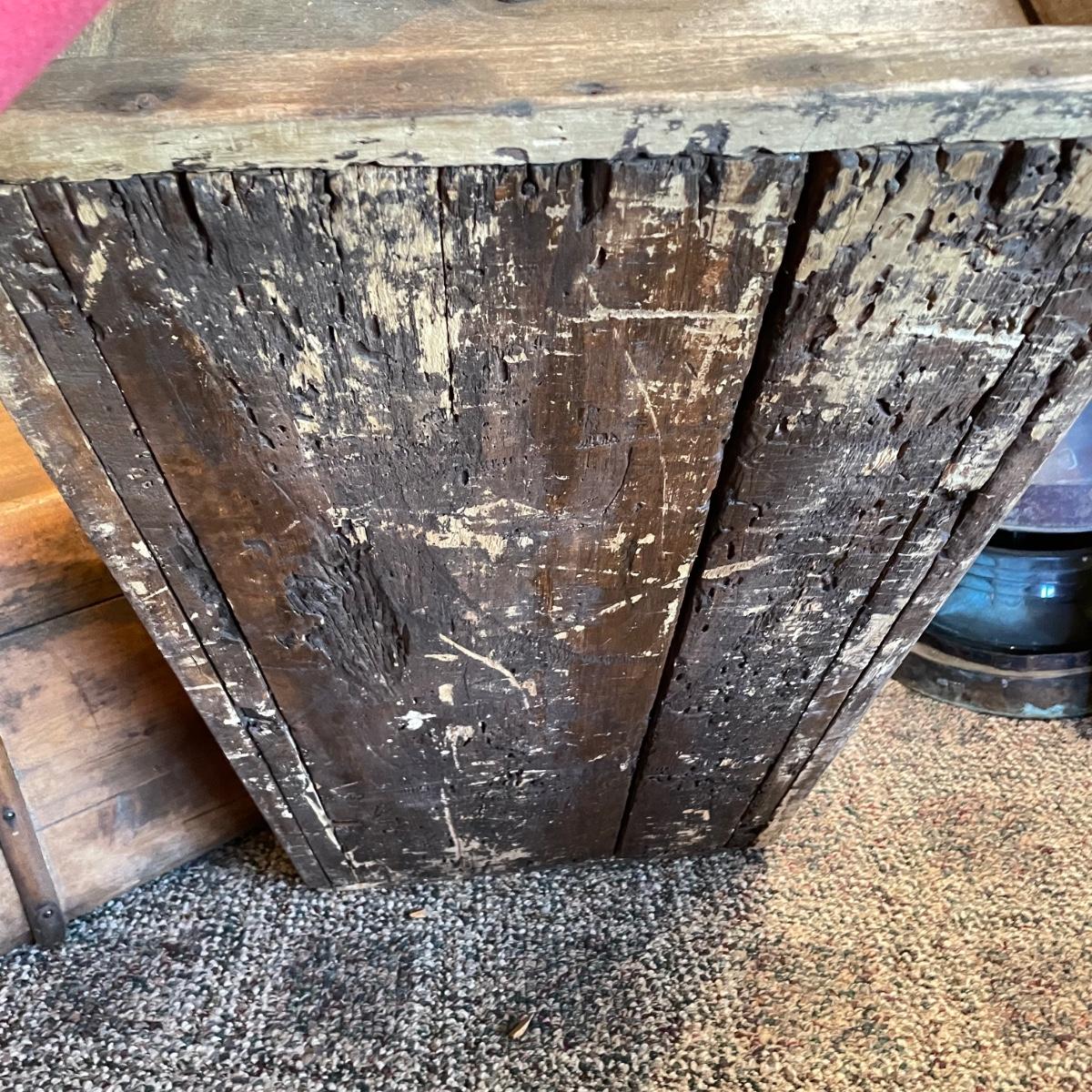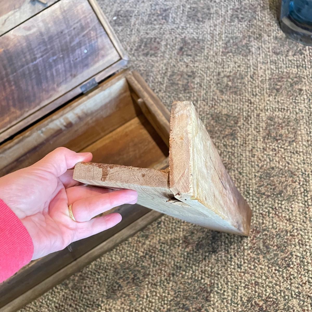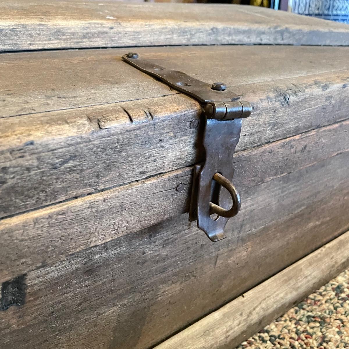 Here is a heavy solid wood antique trunk with cast iron handles and other metal hardware. Inside the trunk, one small two-piece organizer shelf that is removable. Trunk measures 37.5” x 18.5” x 12”. There is a primitive hinge attached to the inside of the lid and an inch tall, 30” long wooden design attached to the lid. See images. Local pick up only.
