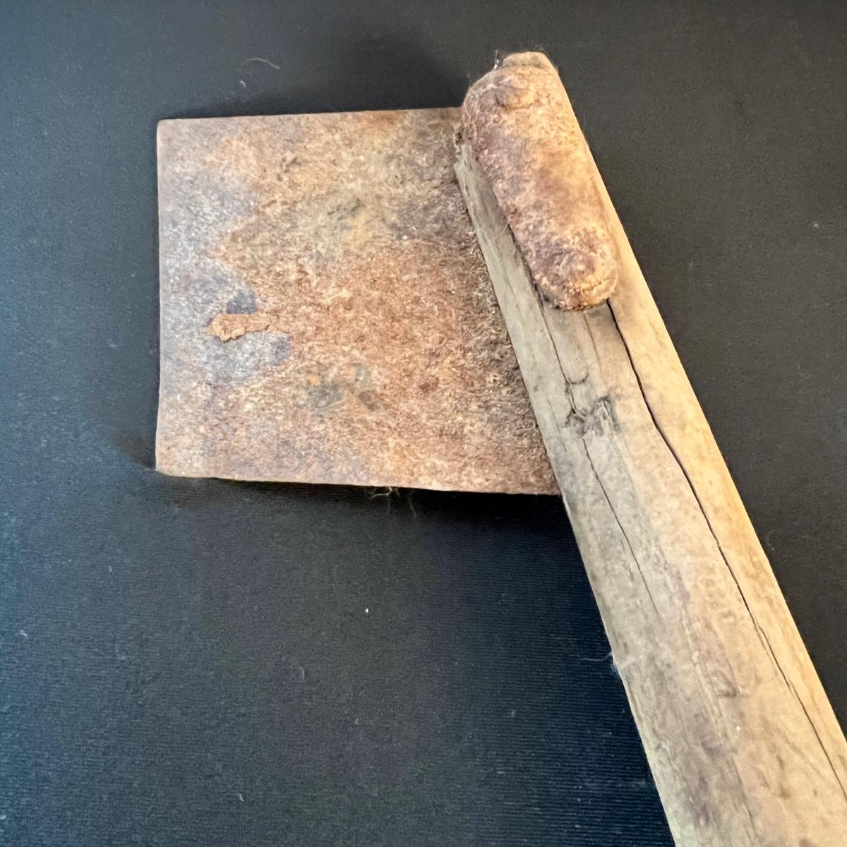 Southern Maryland Rustic Primitive Tobacco Hatchet/Knife. Also includes hand tool believed to be either a tobacco hand stripper or tool for hand rolling cigars (Facebook antique identification group consensus was cigar roller). This tool has cloth grip and a hinge.