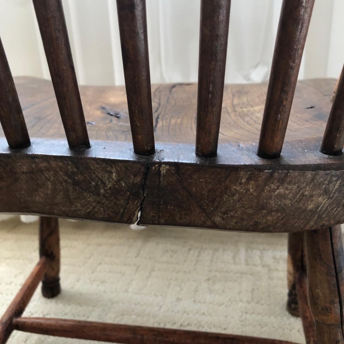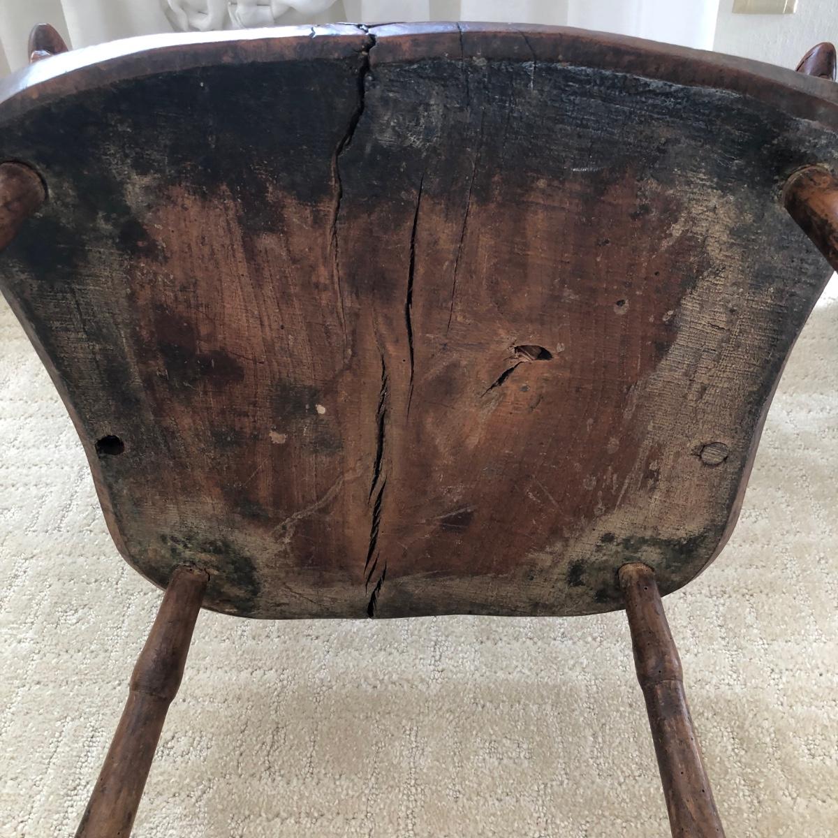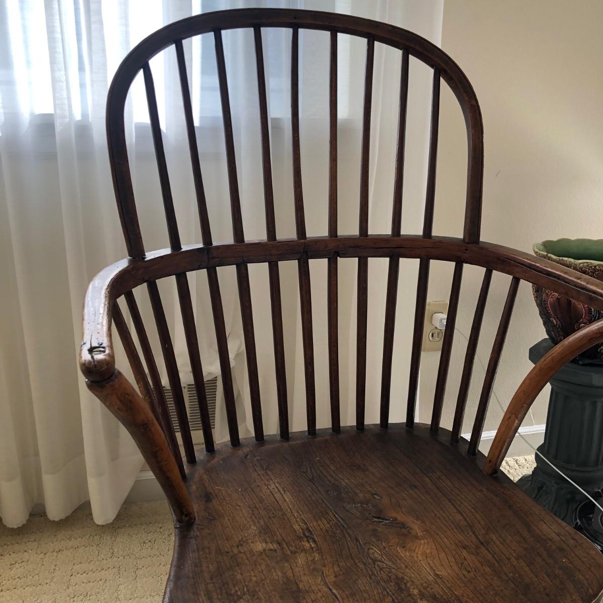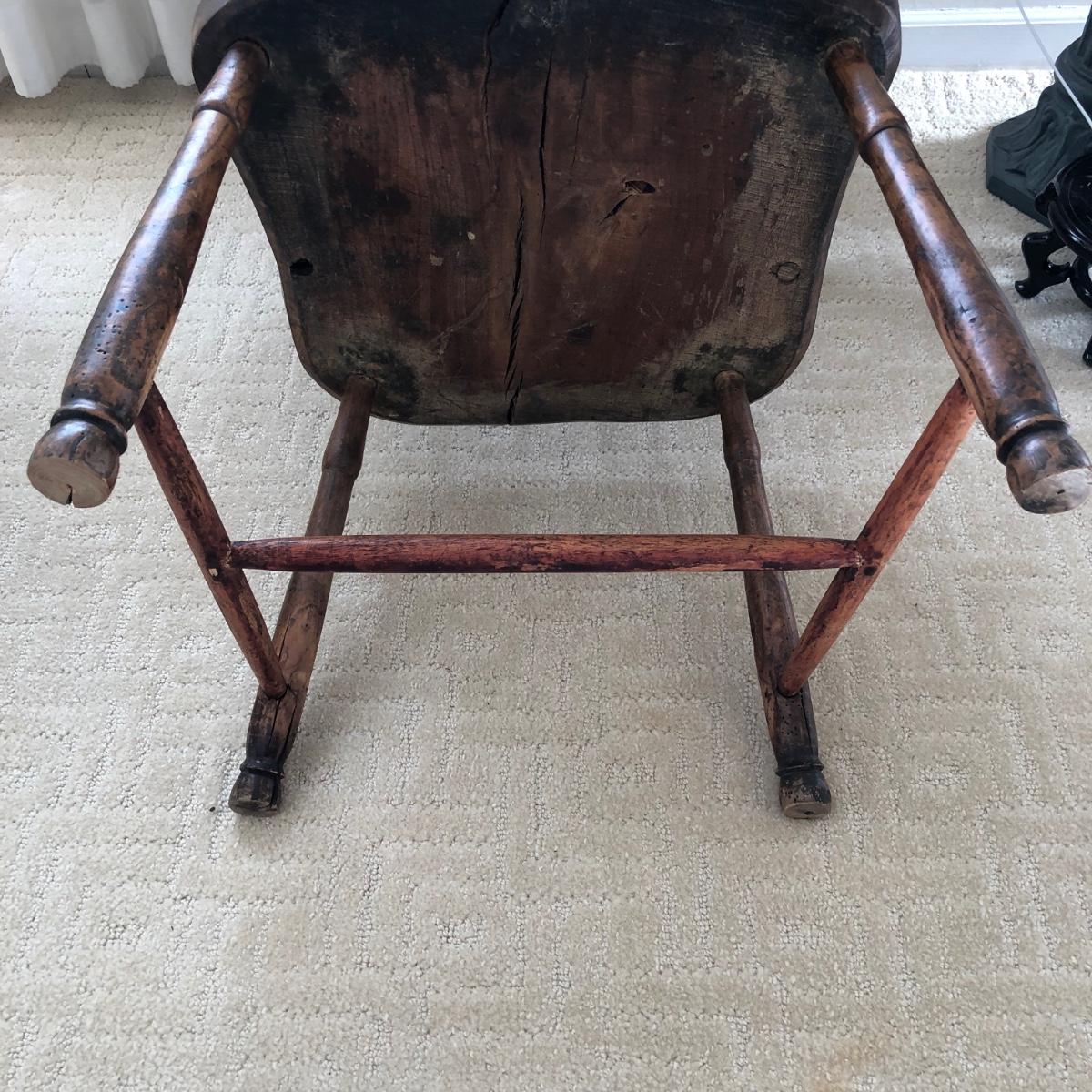 This antique chair is solid wood, sturdy and has no markings. It measures 18” x 16” x 36”. The seat height is 14” high. Note the screw on the left arm (see photo) and the beautiful wood grain pattern in the seat. There is a crack in the back of the seat and back leg. Local pick up only.