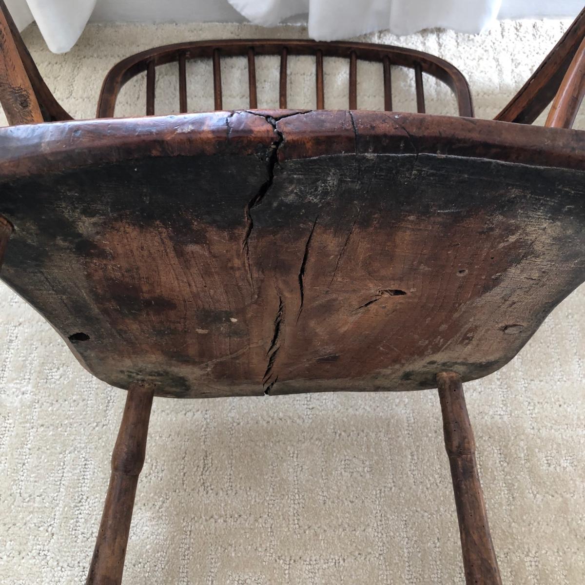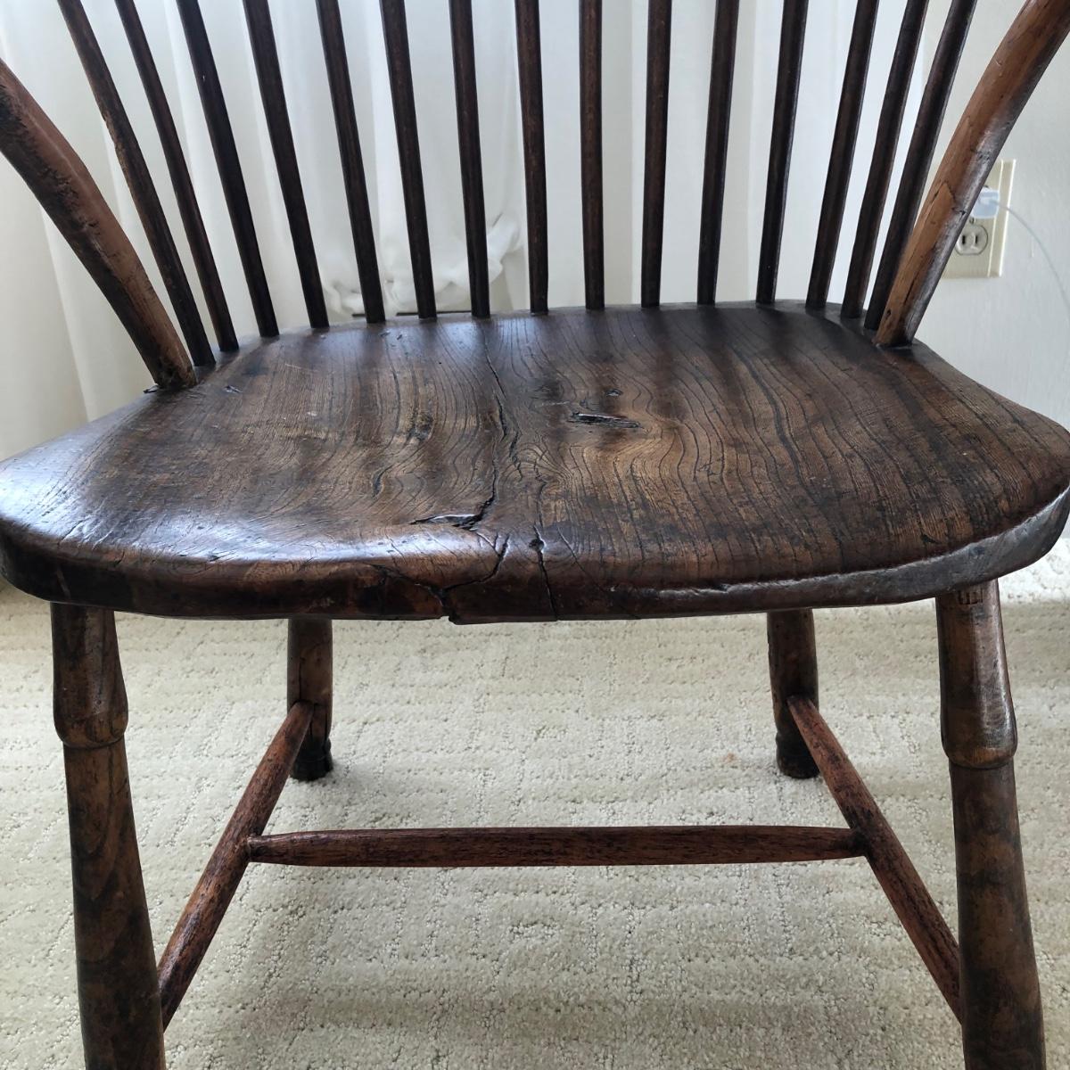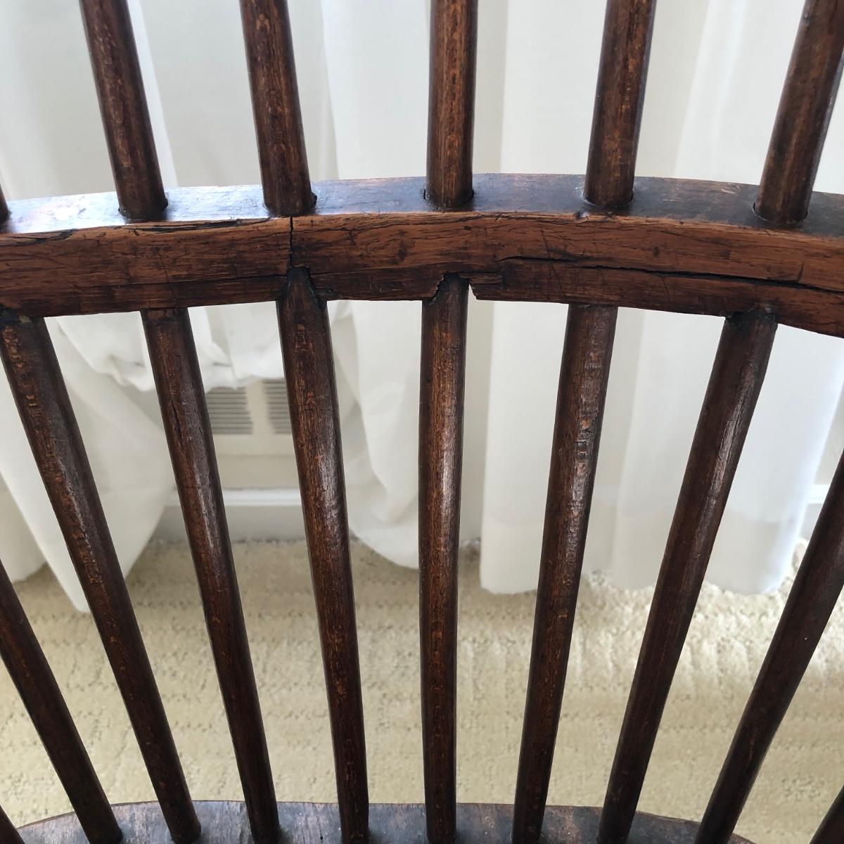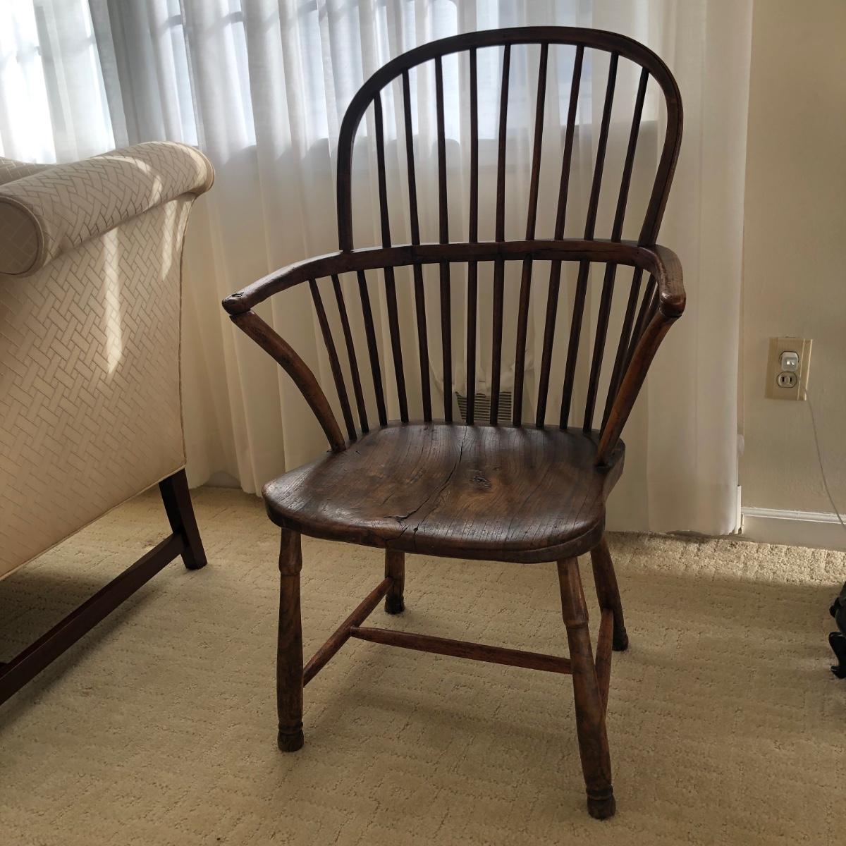 This antique chair is solid wood, sturdy and has no markings. It measures 18” x 16” x 36”. The seat height is 14” high. Note the screw on the left arm (see photo) and the beautiful wood grain pattern in the seat. There is a crack in the back of the seat and back leg. Local pick up only.