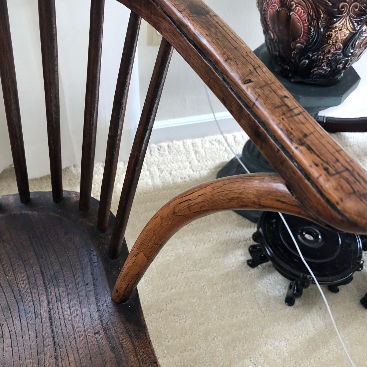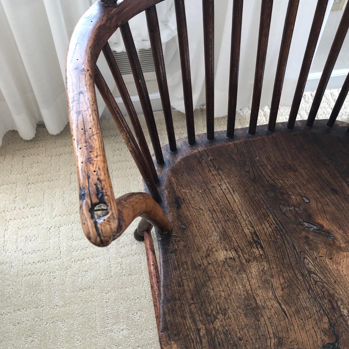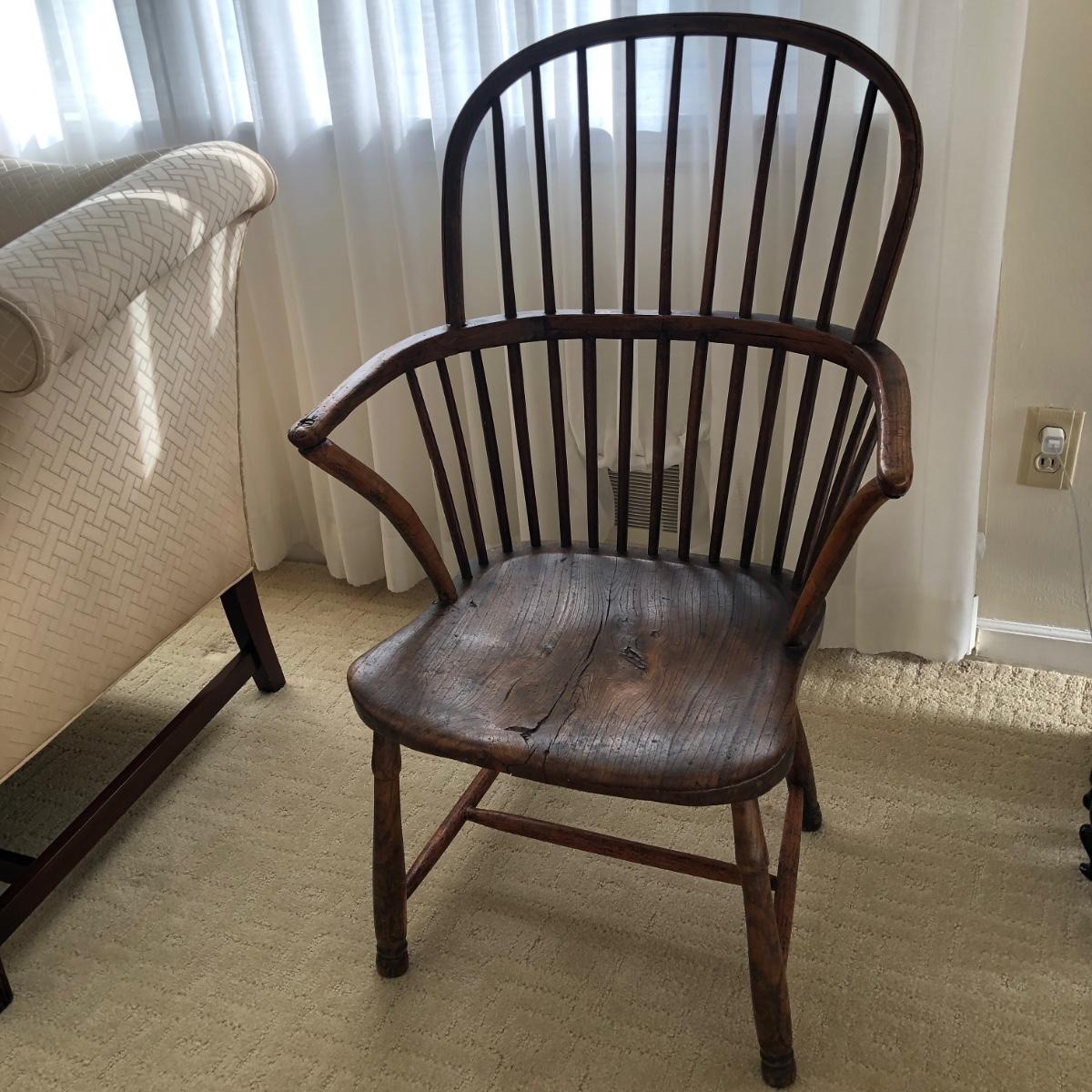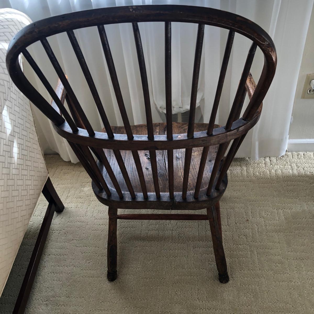This antique chair is solid wood, sturdy and has no markings. It measures 18” x 16” x 36”. The seat height is 14” high. Note the screw on the left arm (see photo) and the beautiful wood grain pattern in the seat. There is a crack in the back of the seat and back leg. Local pick up only.