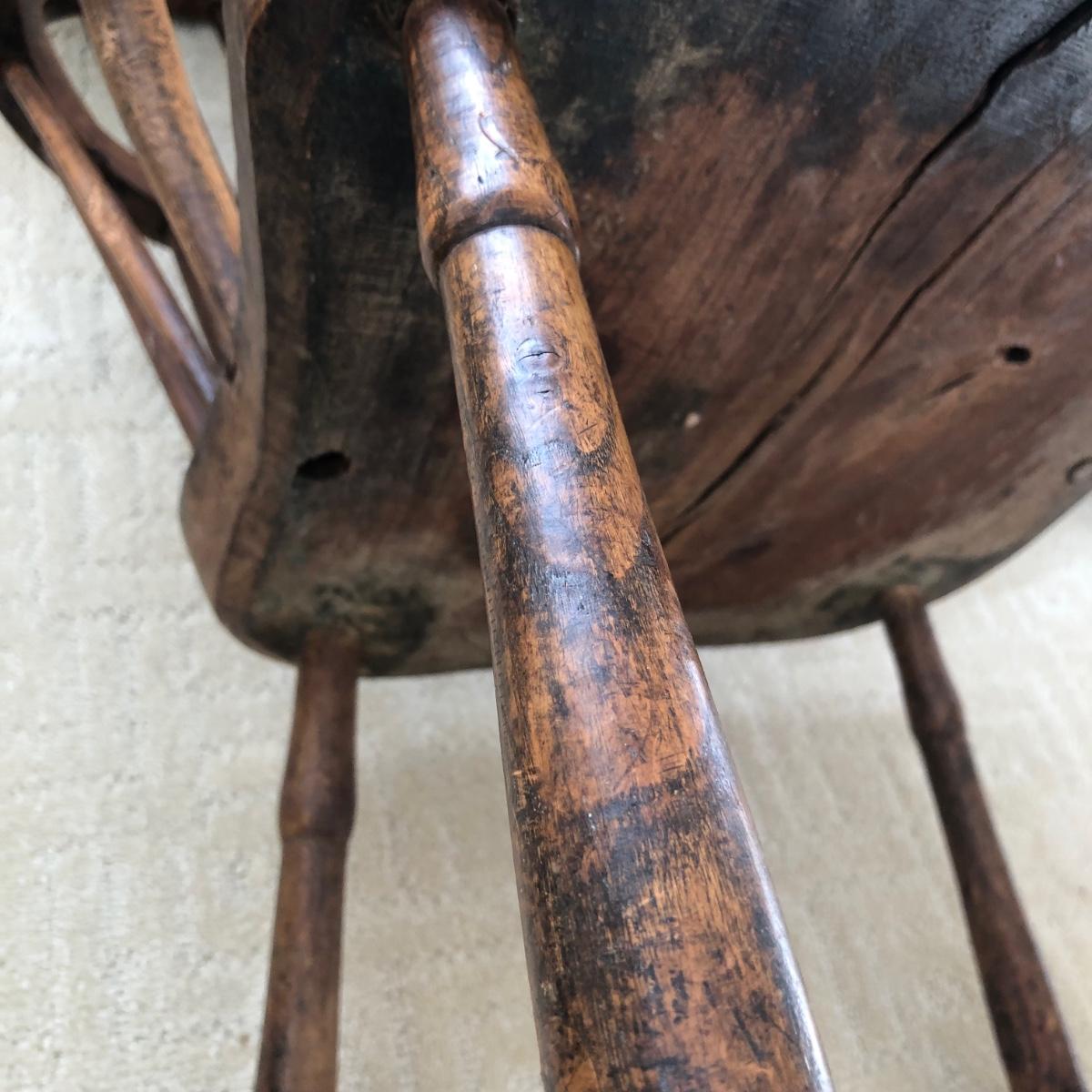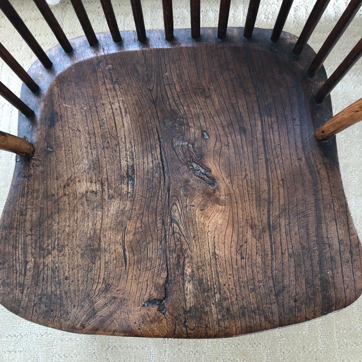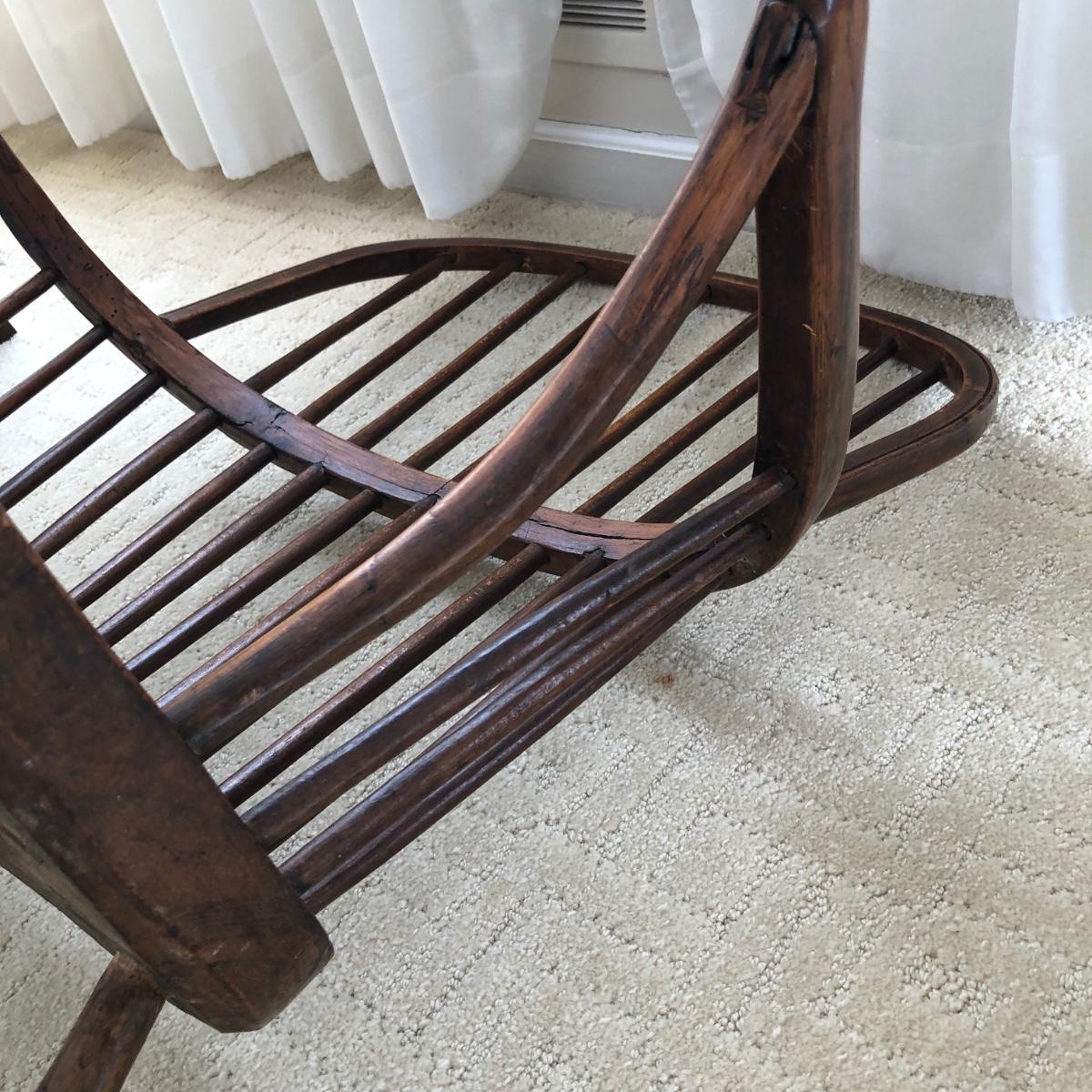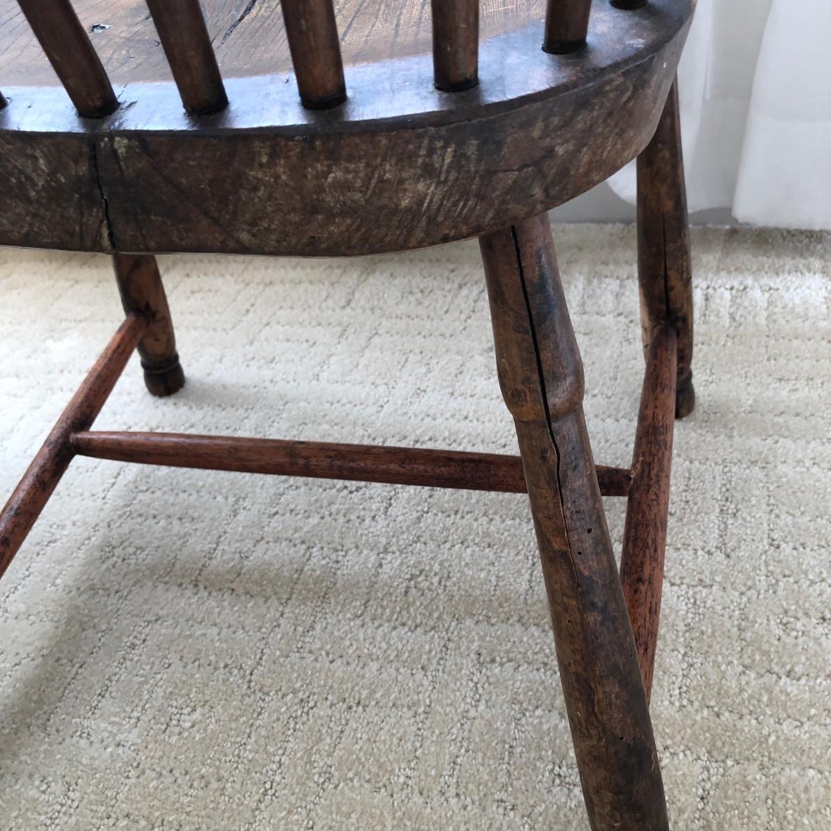 This antique chair is solid wood, sturdy and has no markings. It measures 18” x 16” x 36”. The seat height is 14” high. Note the screw on the left arm (see photo) and the beautiful wood grain pattern in the seat. There is a crack in the back of the seat and back leg. Local pick up only.