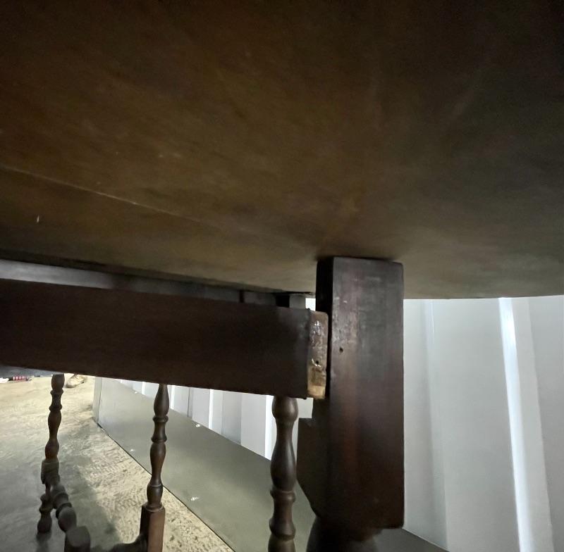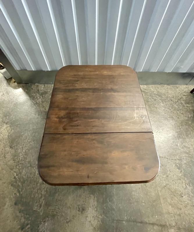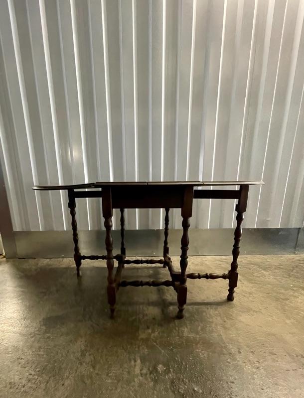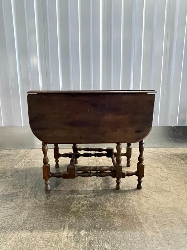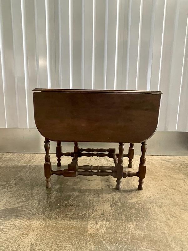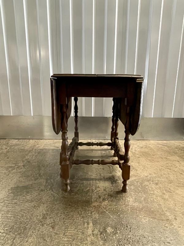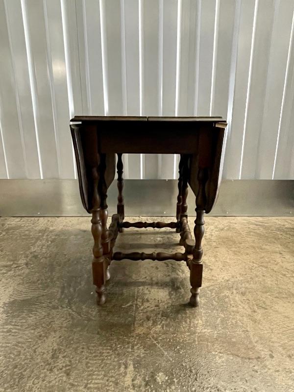 Wood drop-leaf table with spindle legs. See photos. Dimensions when closed: H 30.5” W 35” x D 21” . Opened L 47” x W 35”