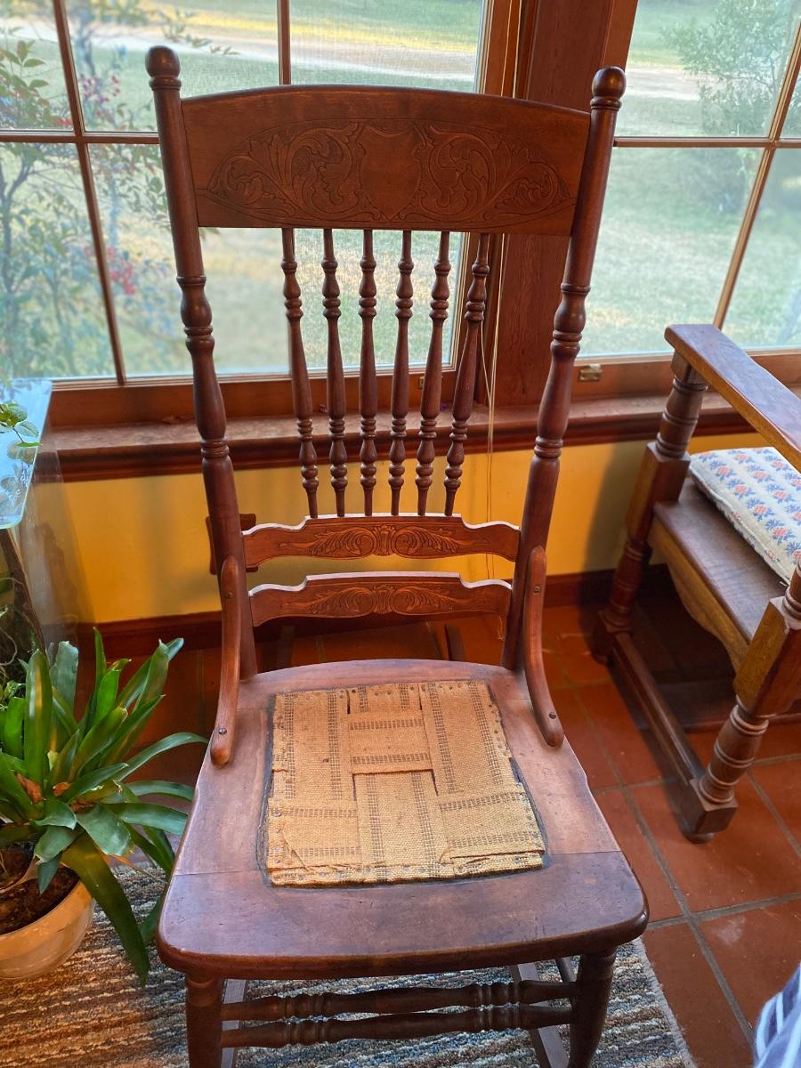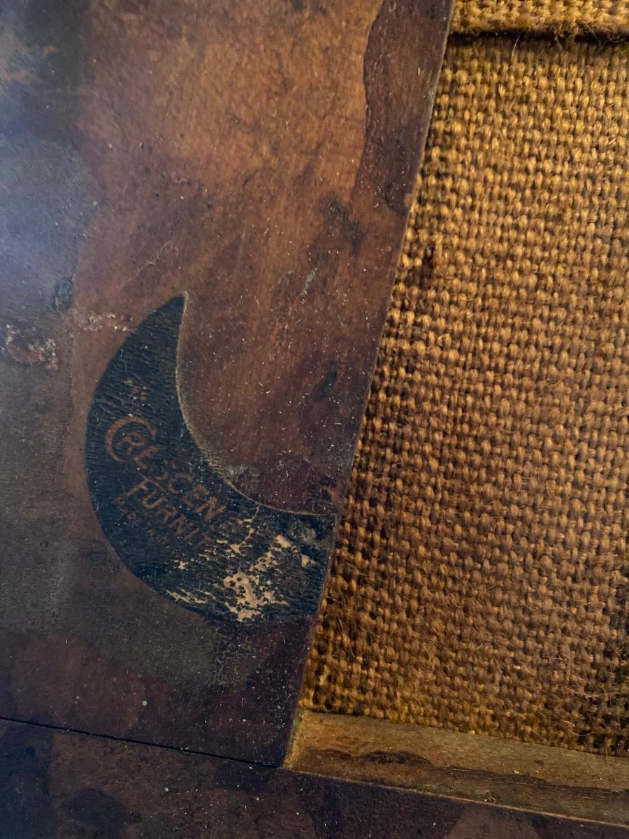 Antique spindle-back rocking chair with web seat. Marked Crescent City Furniture Co.