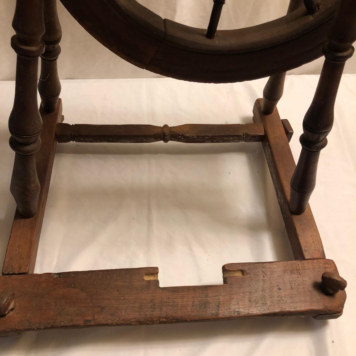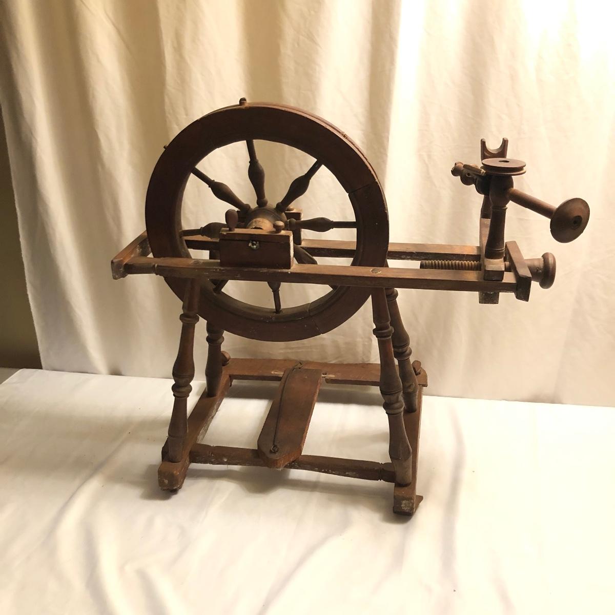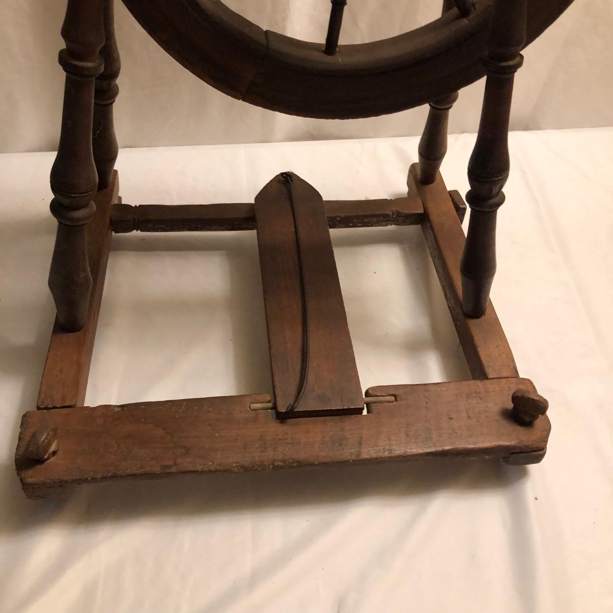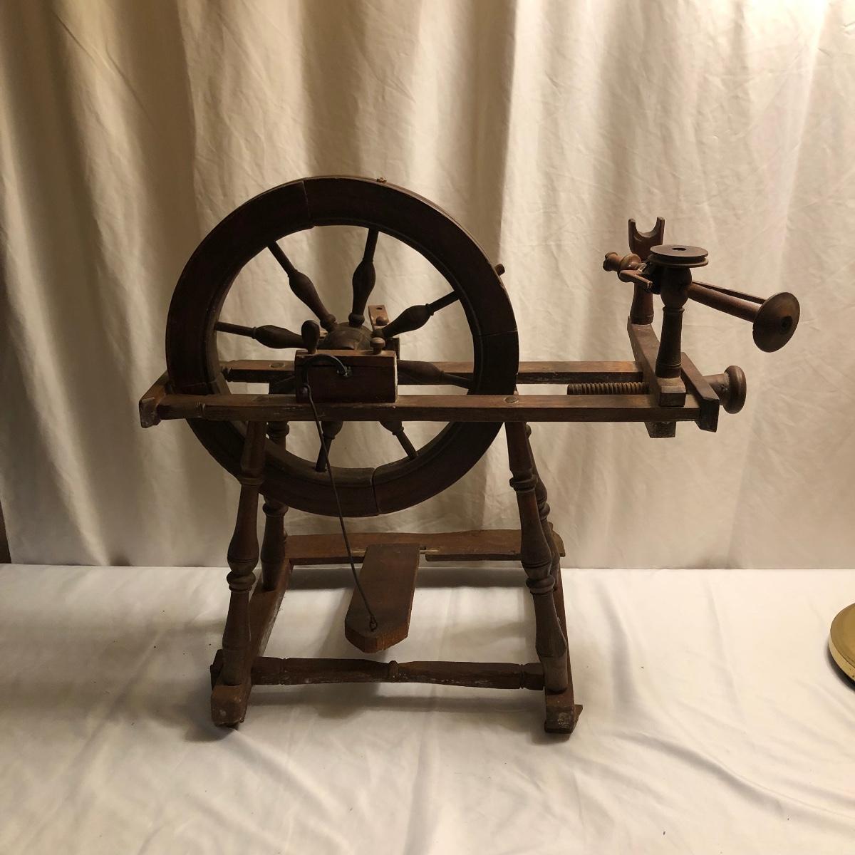 Lot includes antique wooden spinning wheel. Piece shows wear and tear but appears complete. Piece measures 16” x 27” x 25”