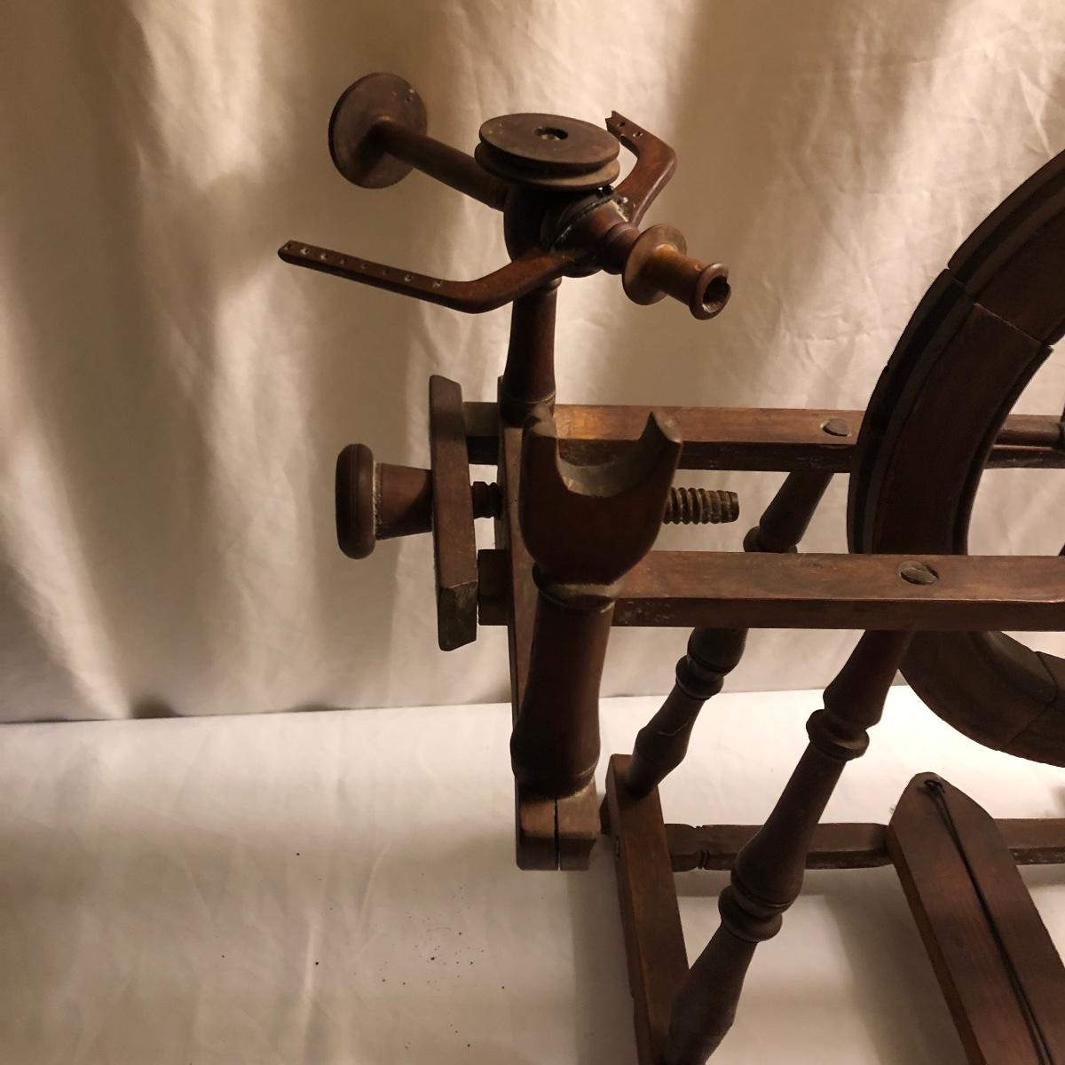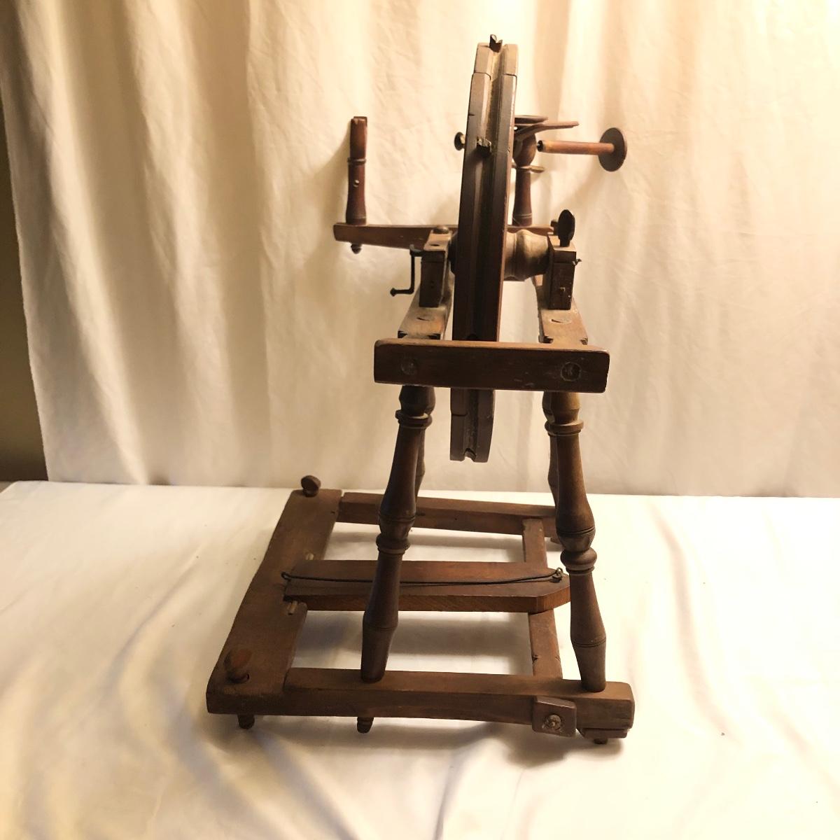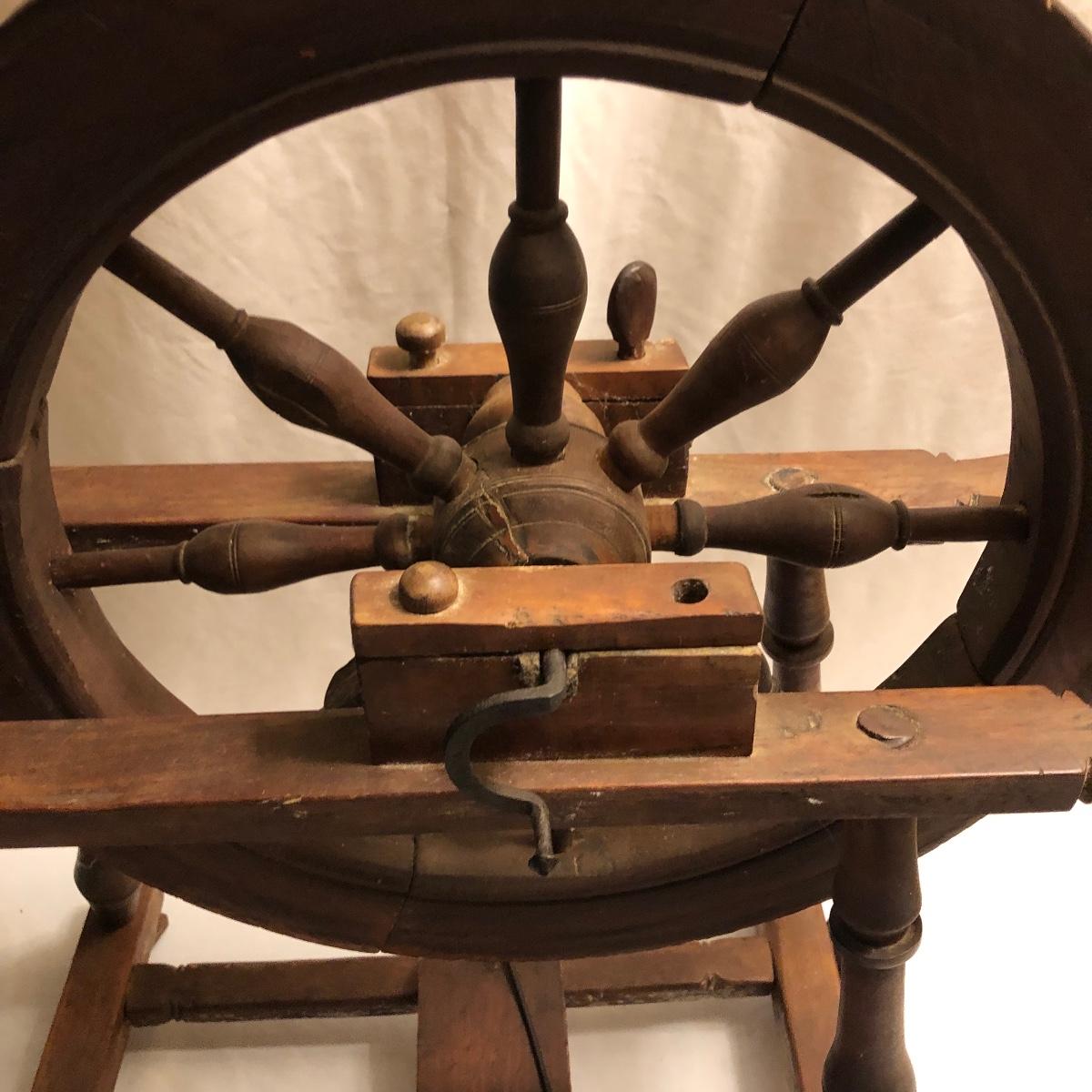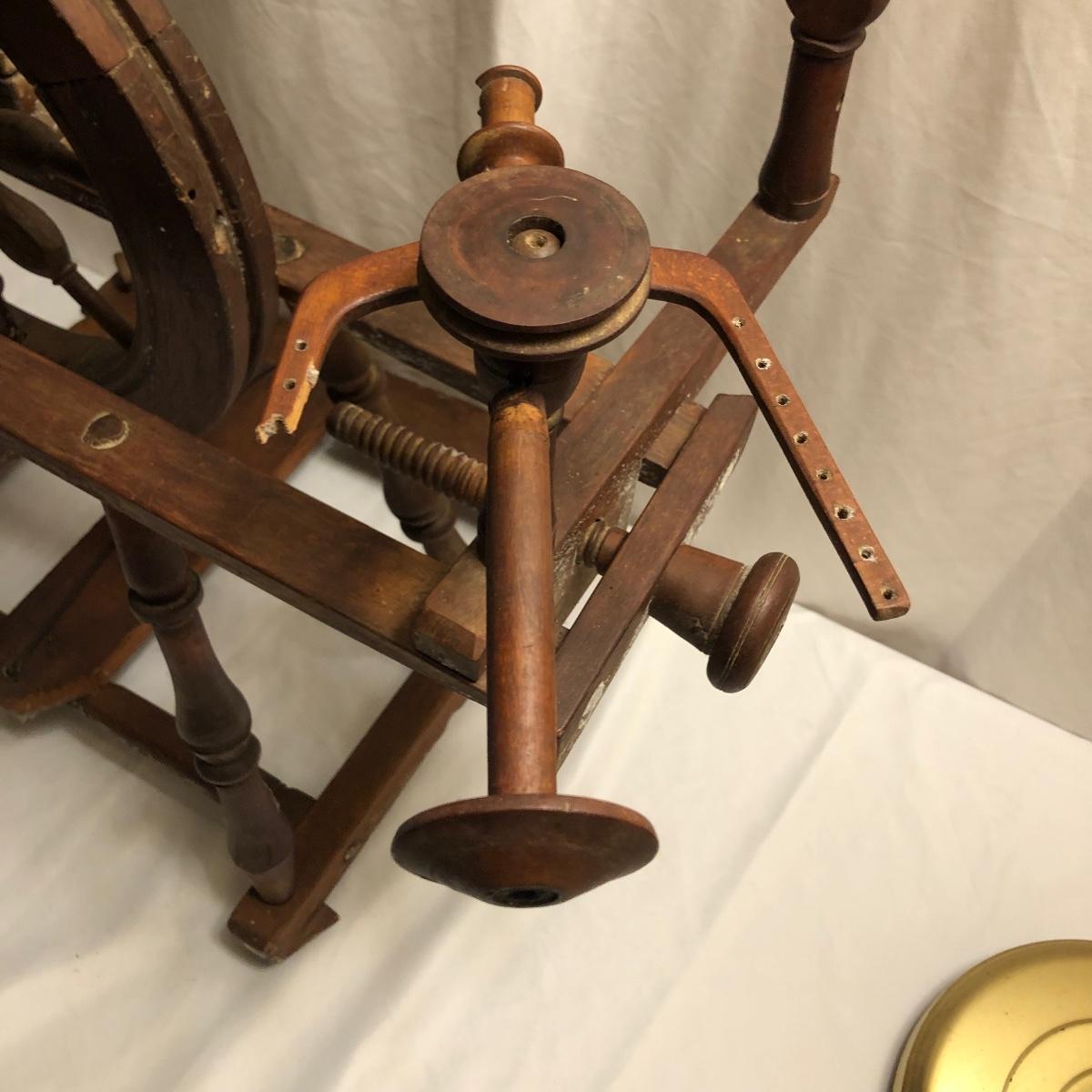 Lot includes antique wooden spinning wheel. Piece shows wear and tear but appears complete. Piece measures 16” x 27” x 25”