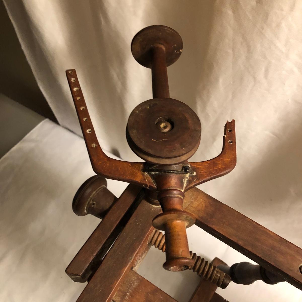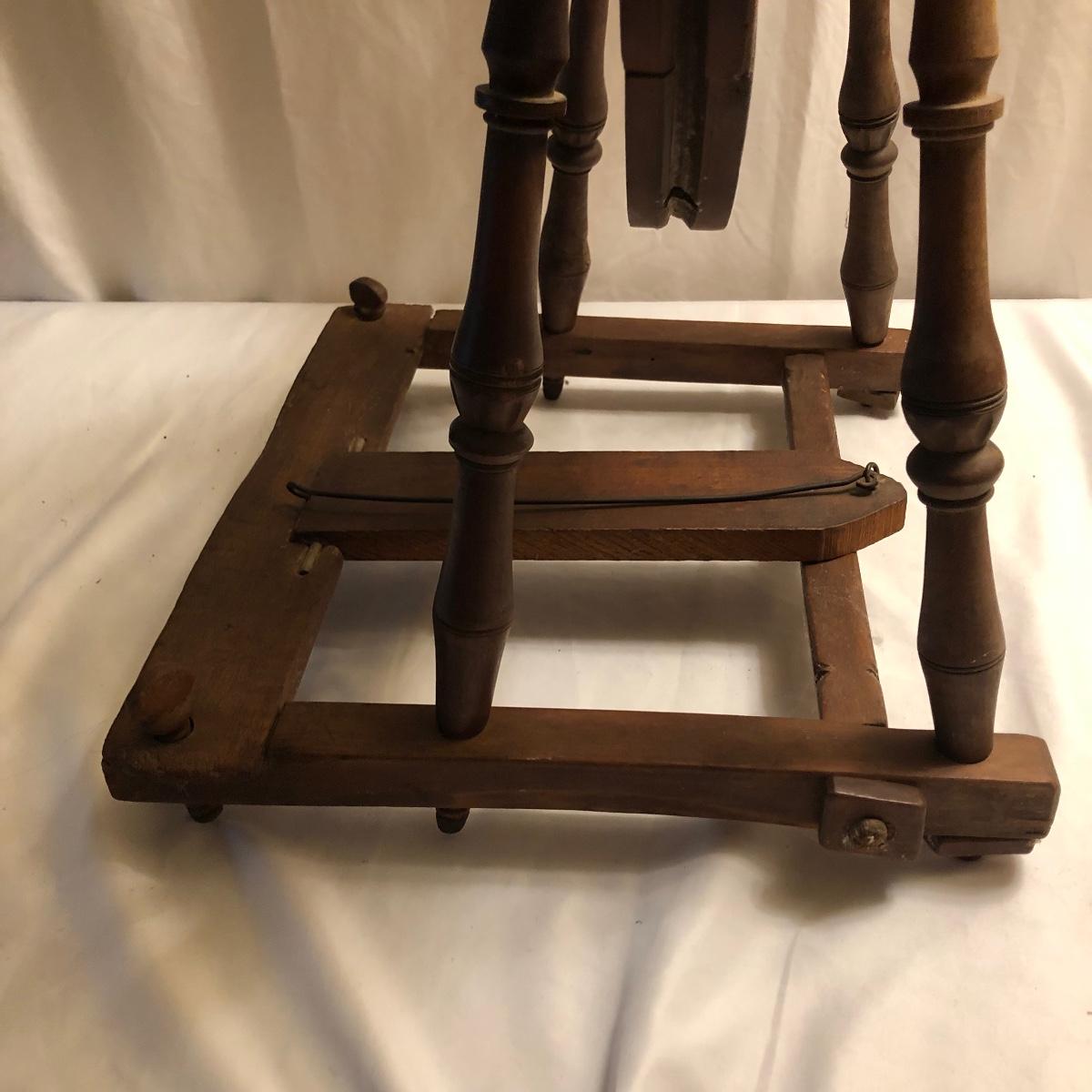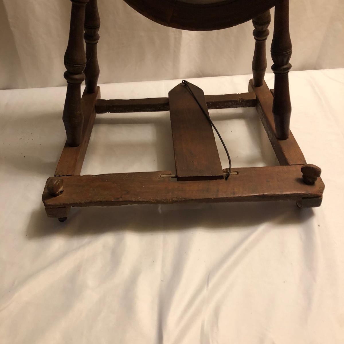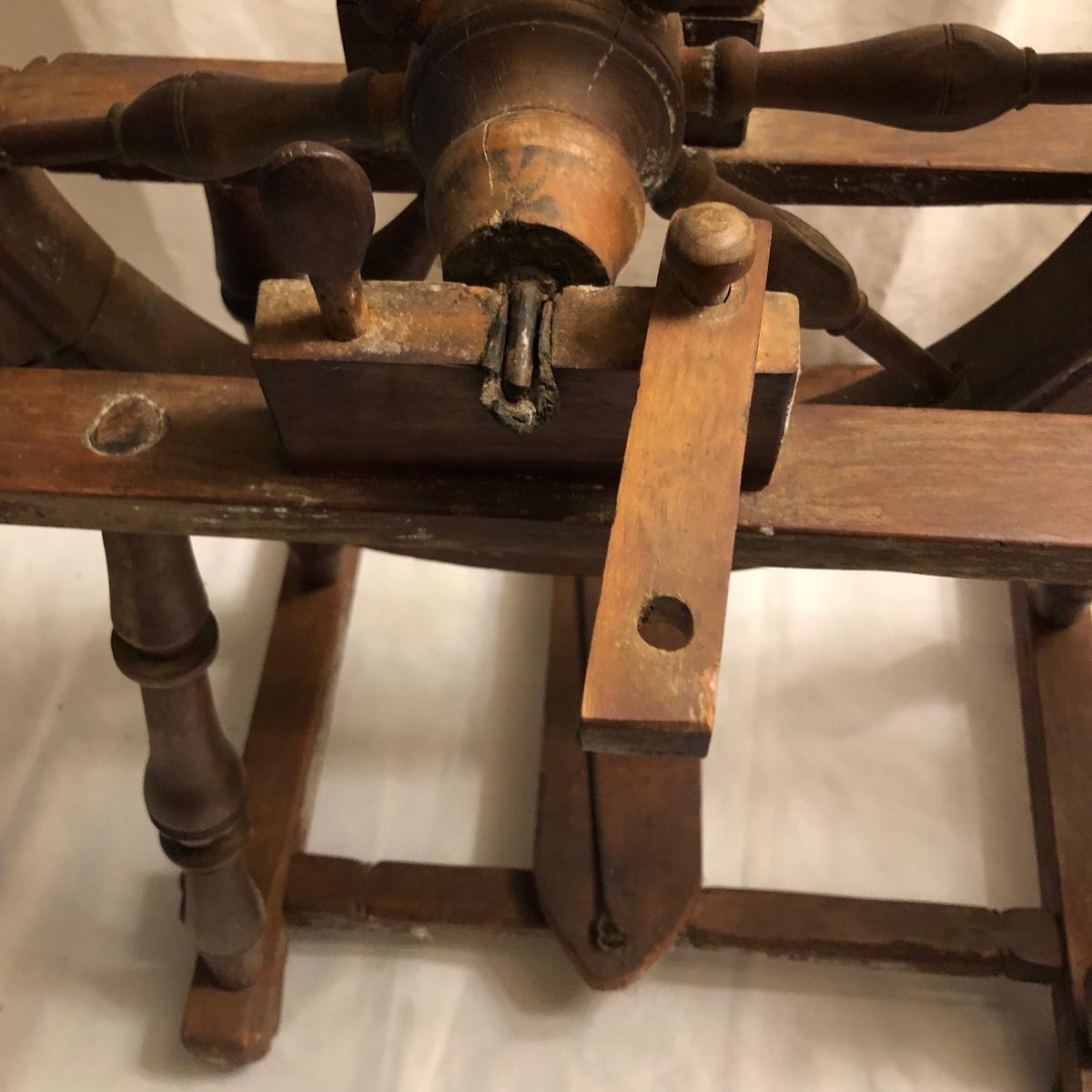Lot includes antique wooden spinning wheel. Piece shows wear and tear but appears complete. Piece measures 16” x 27” x 25”