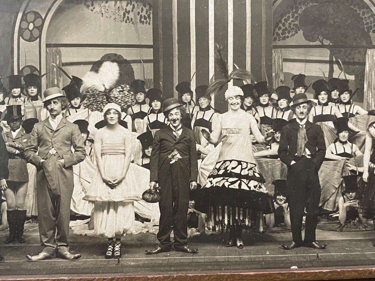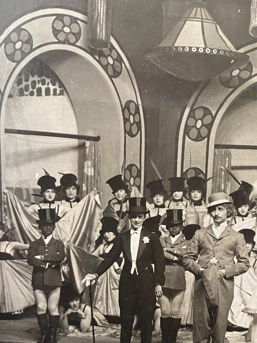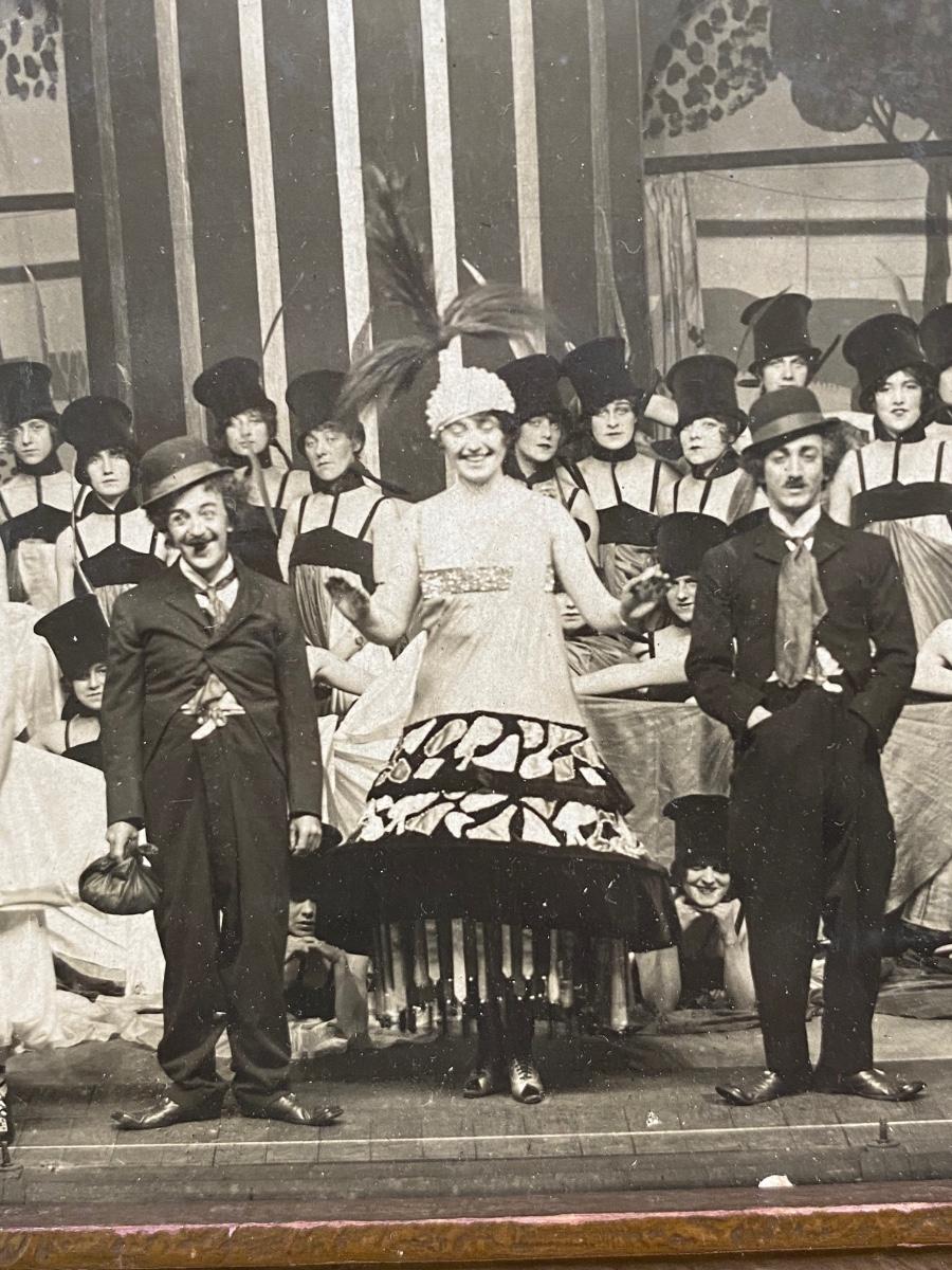 Antique vaudeville stage show cast photograph. The men in front sort of look like the Marx Brothers, but I cannot confirm it. There is some damage to the photo near the top. Location unknown.