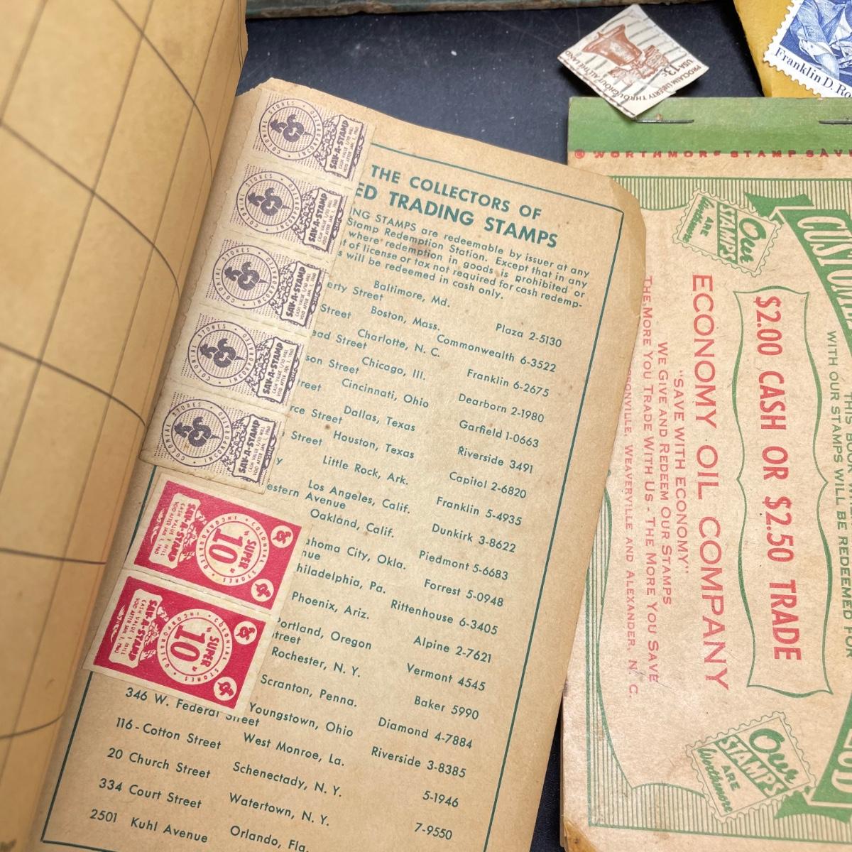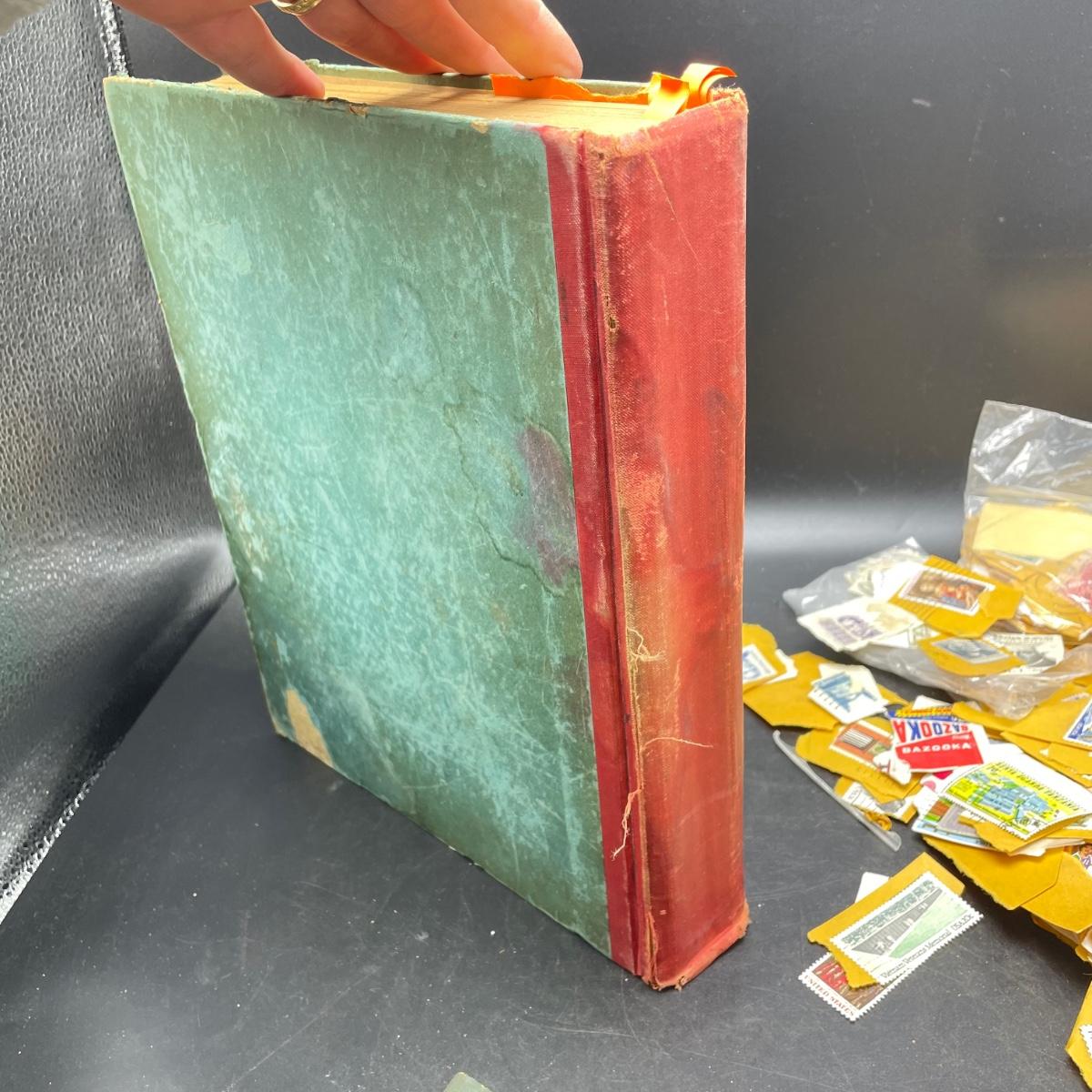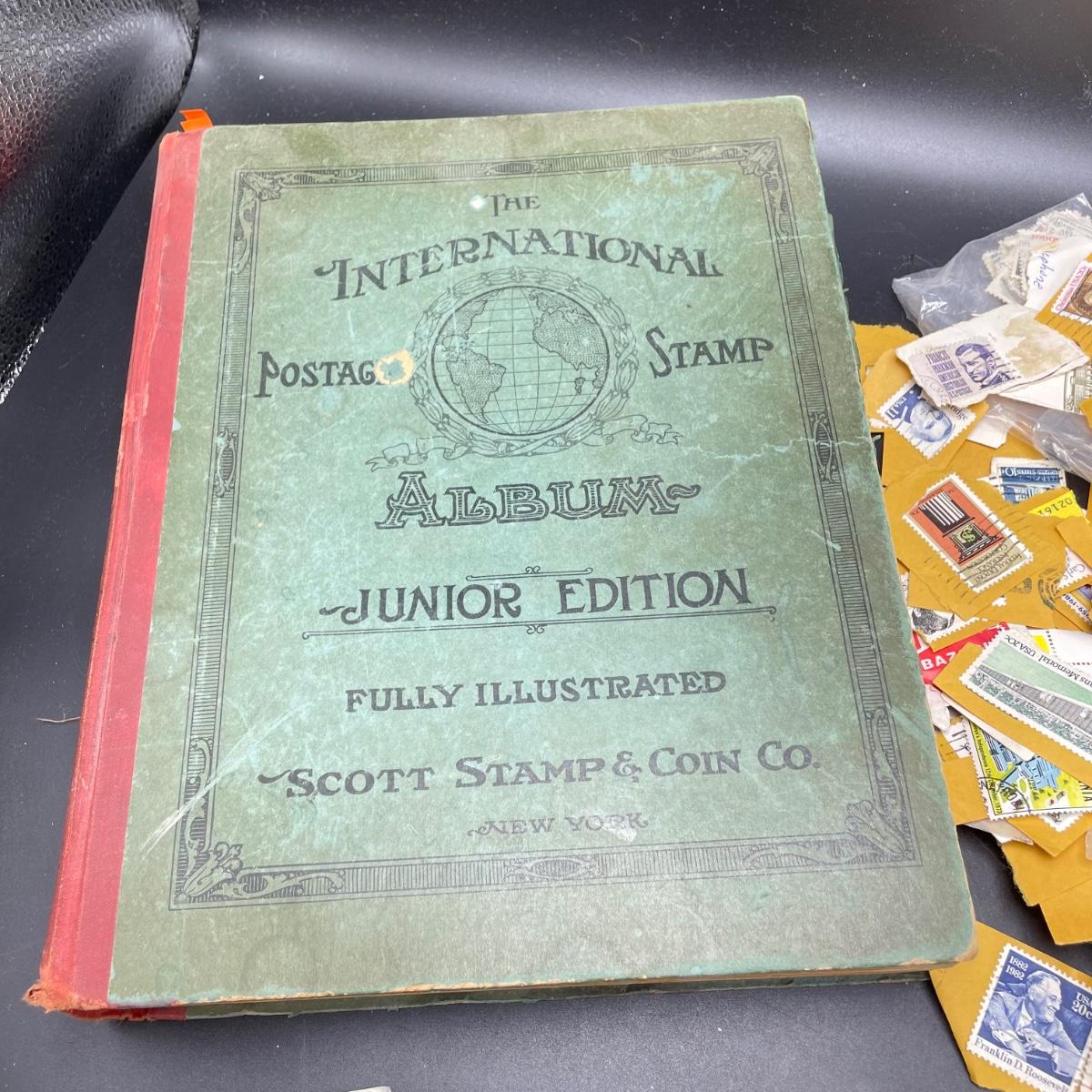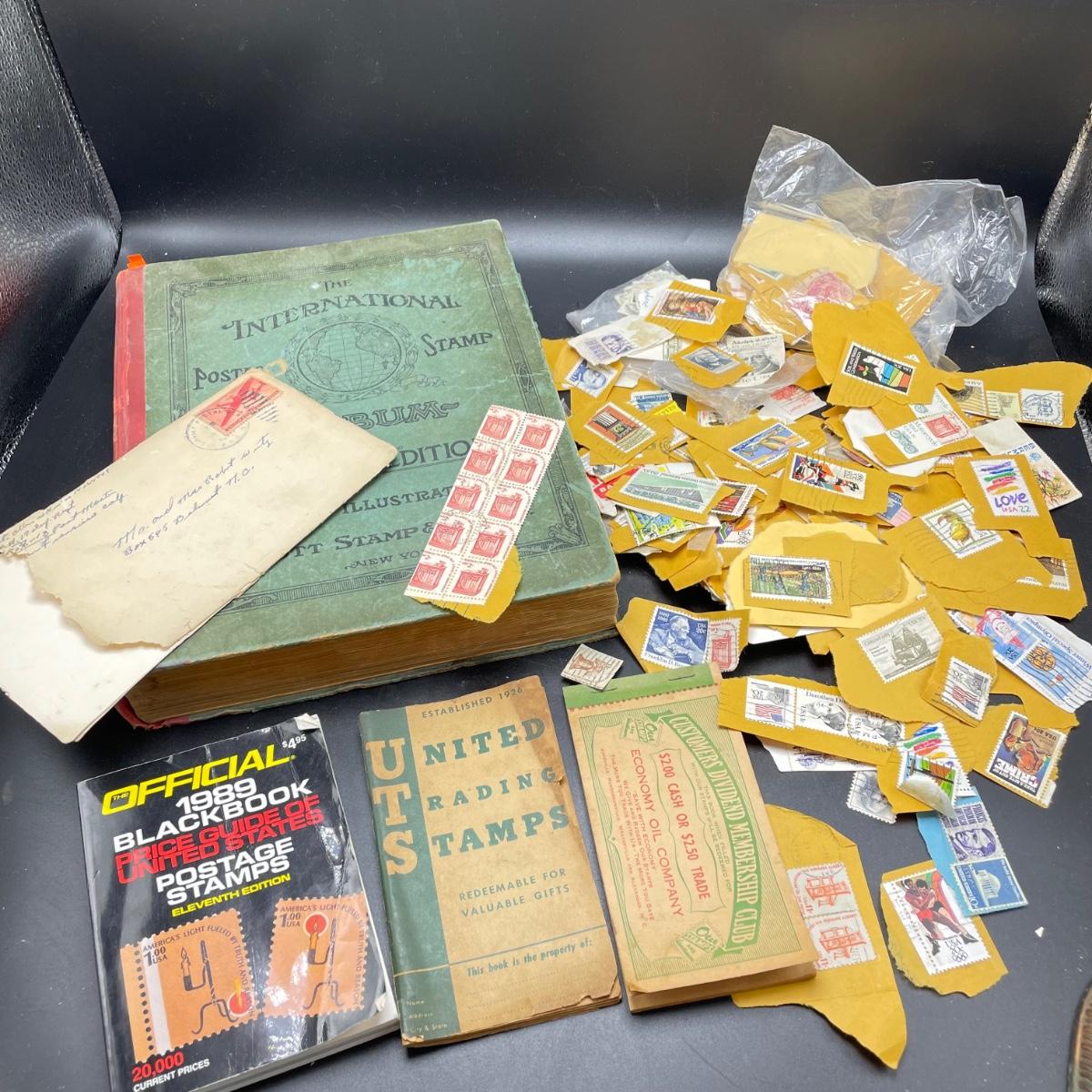 A mostly empty vintage The International Postage Stamp Album Junior Edition, with origin markings on pages with stamps. Other albums are from United Trading Stamps and Economy Oil Company. Lot also includes a ten block of cancelled 2¢ Freedom to Speak Out and many more mostly single cancelled stamps. Foreign and Domestic stamps are included in the lot. See images. Local pick up only.