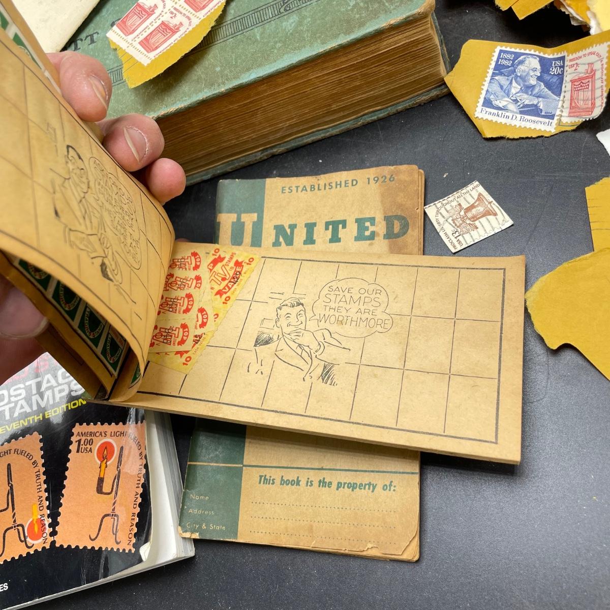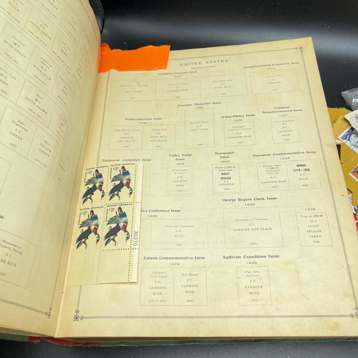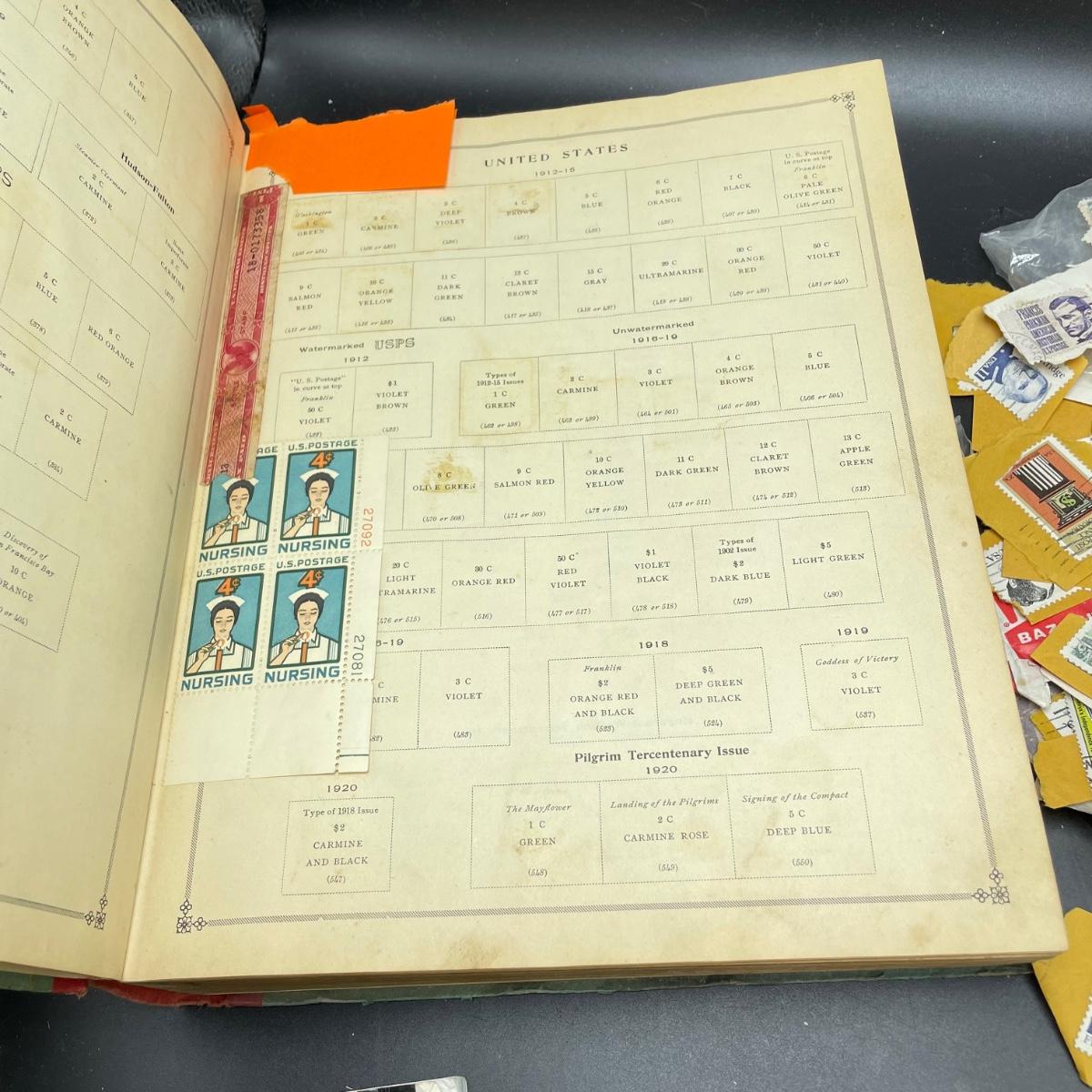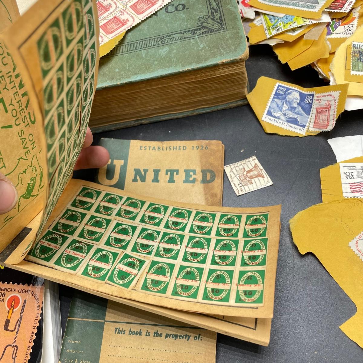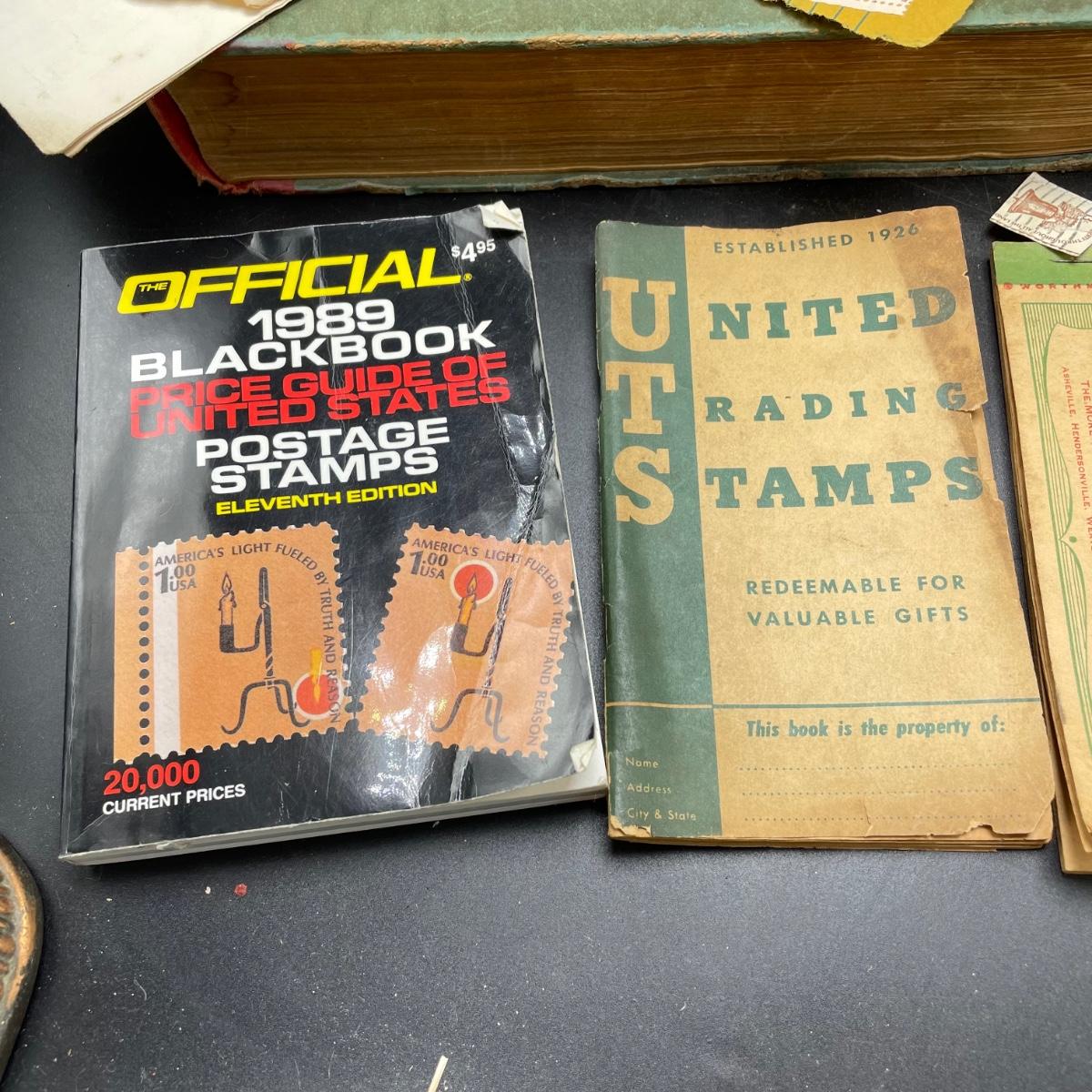 A mostly empty vintage The International Postage Stamp Album Junior Edition, with origin markings on pages with stamps. Other albums are from United Trading Stamps and Economy Oil Company. Lot also includes a ten block of cancelled 2¢ Freedom to Speak Out and many more mostly single cancelled stamps. Foreign and Domestic stamps are included in the lot. See images. Local pick up only.