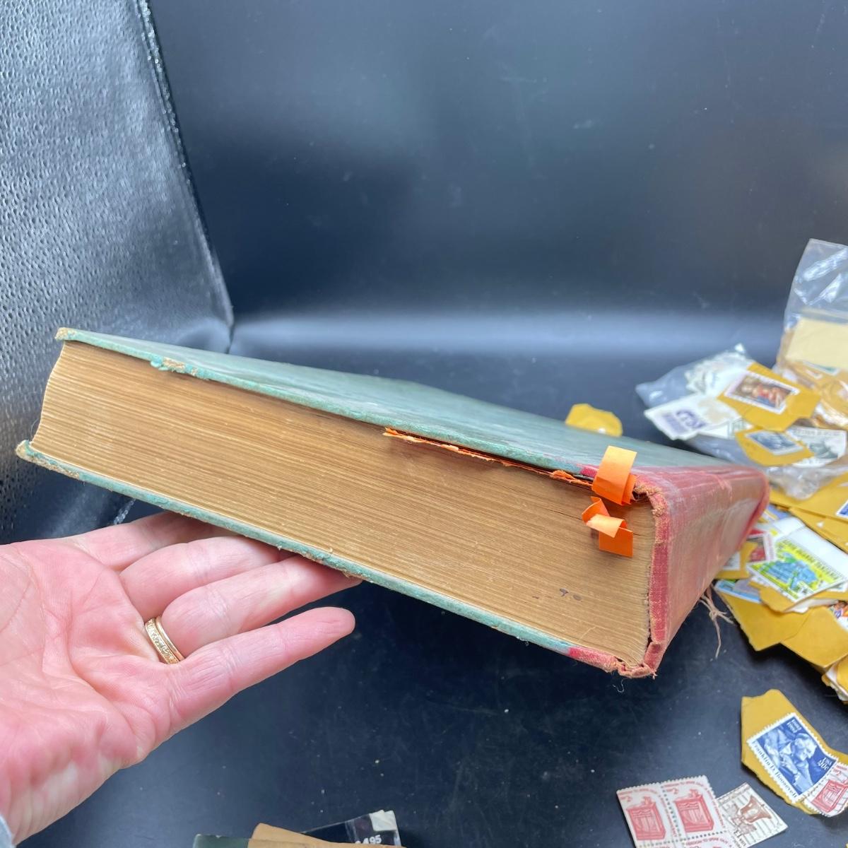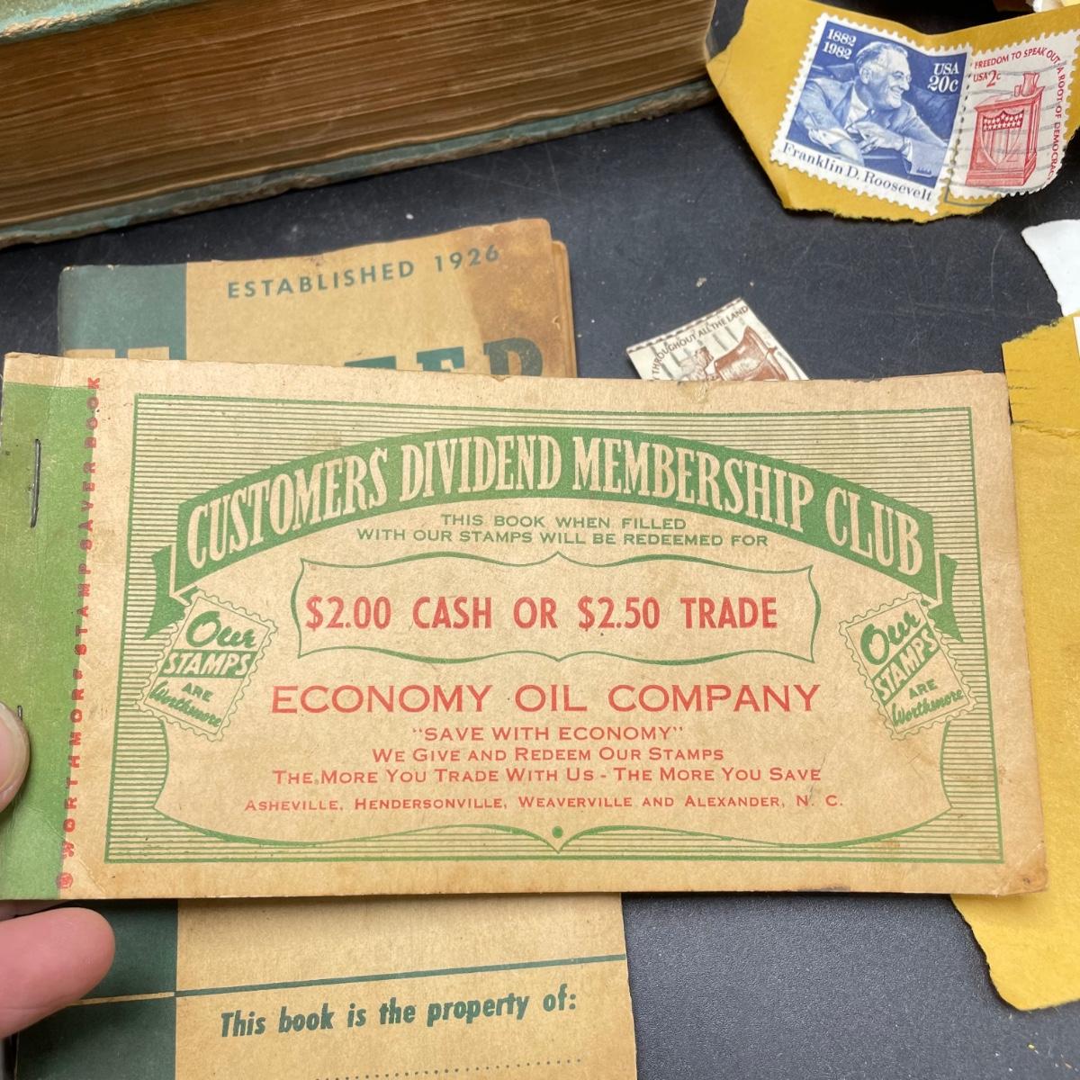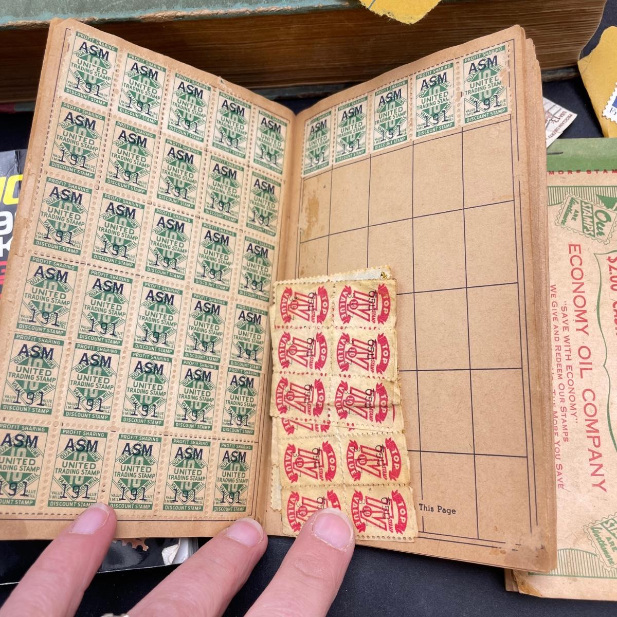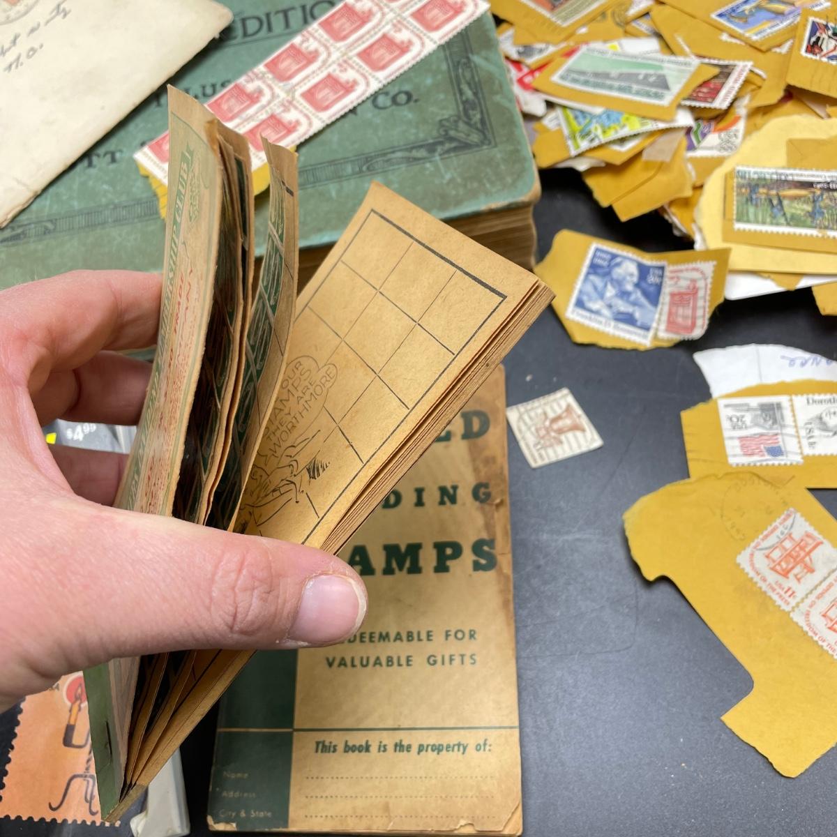A mostly empty vintage The International Postage Stamp Album Junior Edition, with origin markings on pages with stamps. Other albums are from United Trading Stamps and Economy Oil Company. Lot also includes a ten block of cancelled 2¢ Freedom to Speak Out and many more mostly single cancelled stamps. Foreign and Domestic stamps are included in the lot. See images. Local pick up only.