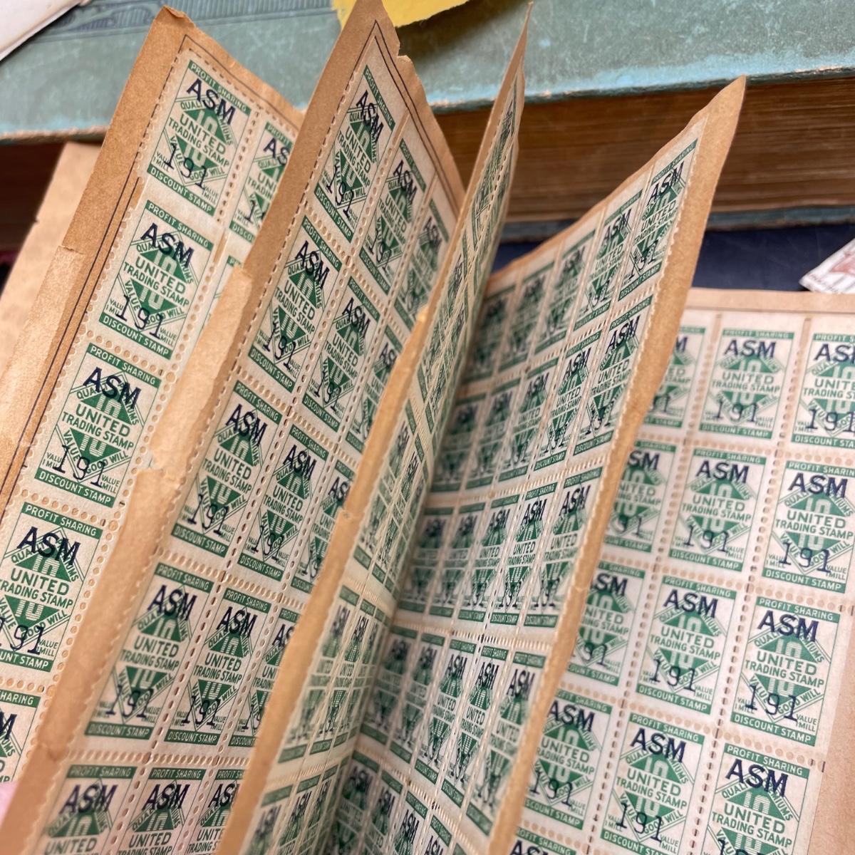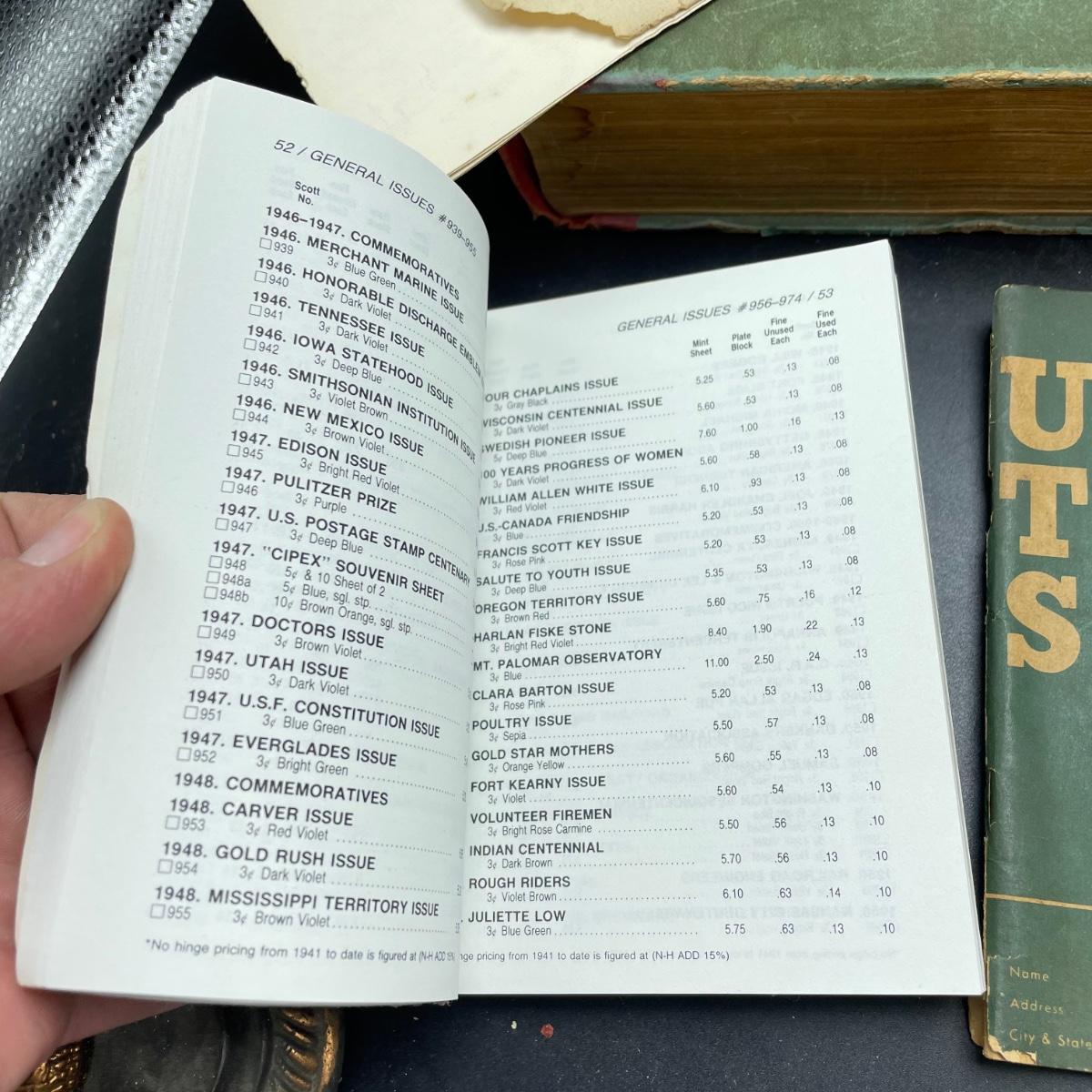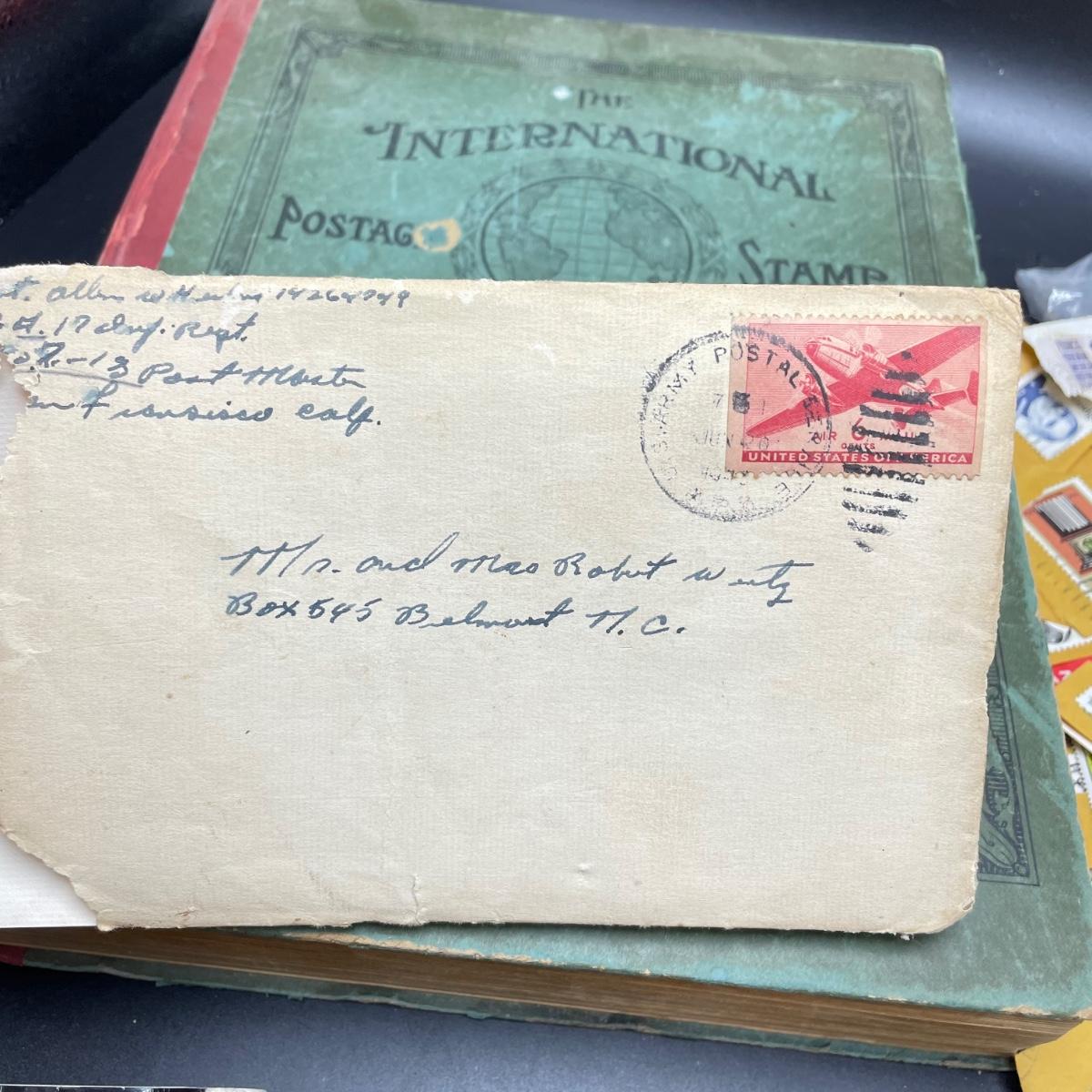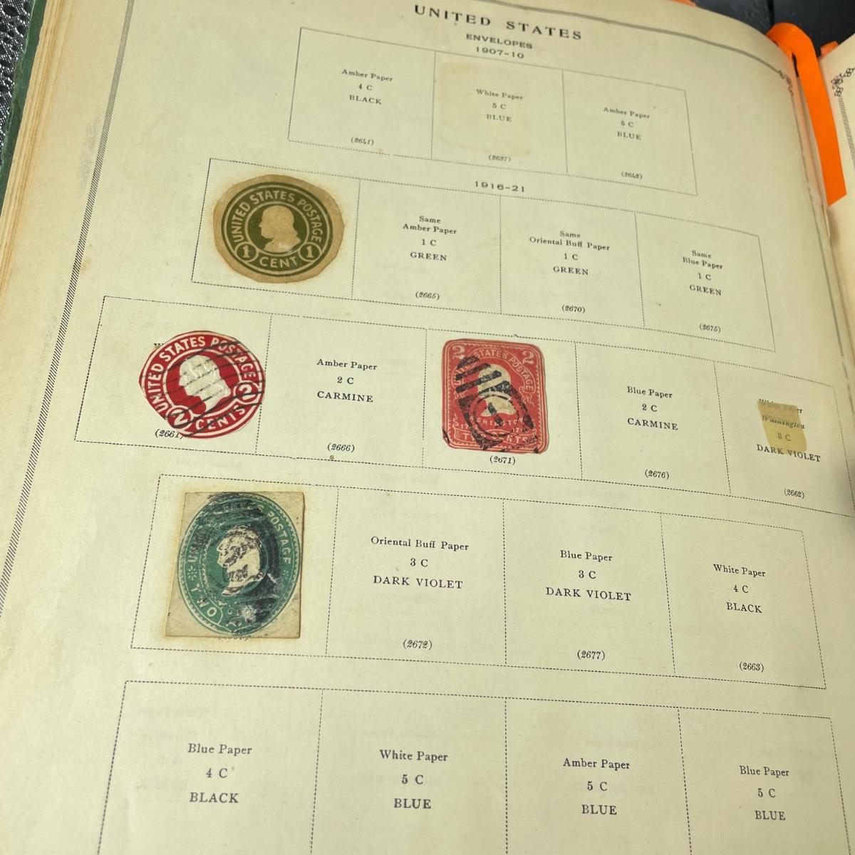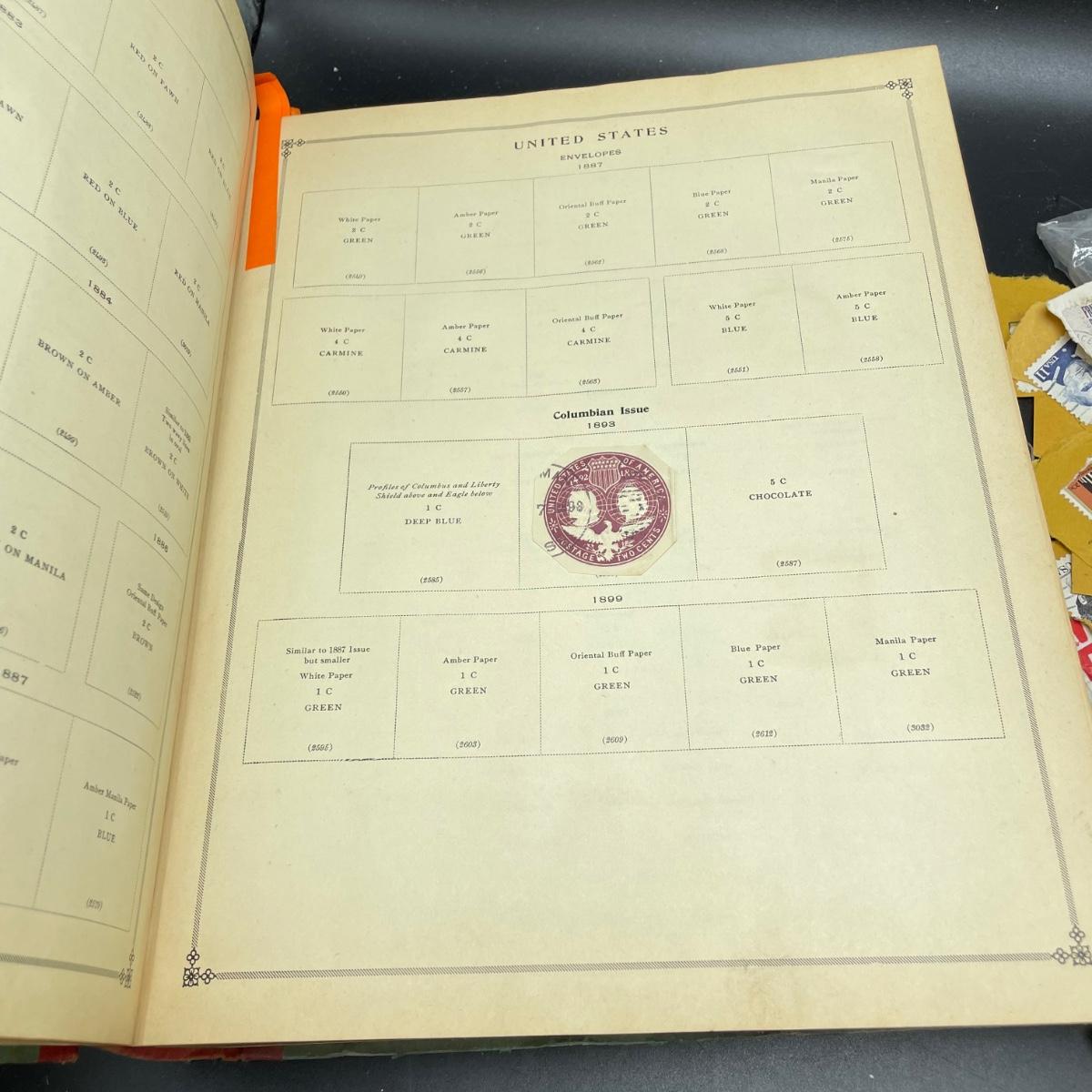 A mostly empty vintage The International Postage Stamp Album Junior Edition, with origin markings on pages with stamps. Other albums are from United Trading Stamps and Economy Oil Company. Lot also includes a ten block of cancelled 2¢ Freedom to Speak Out and many more mostly single cancelled stamps. Foreign and Domestic stamps are included in the lot. See images. Local pick up only.