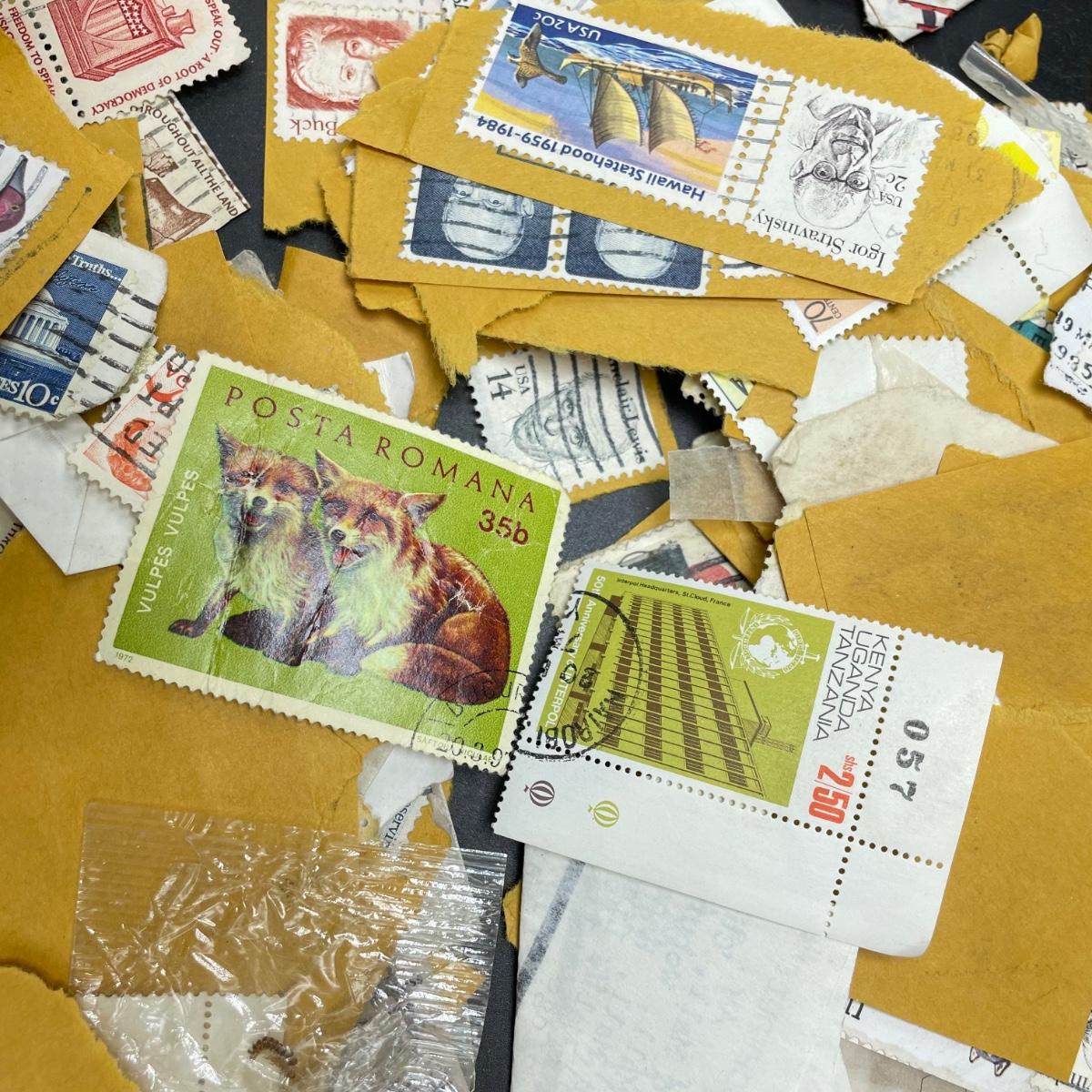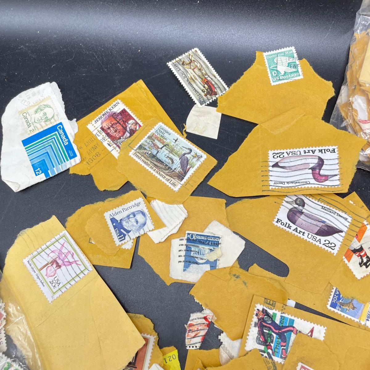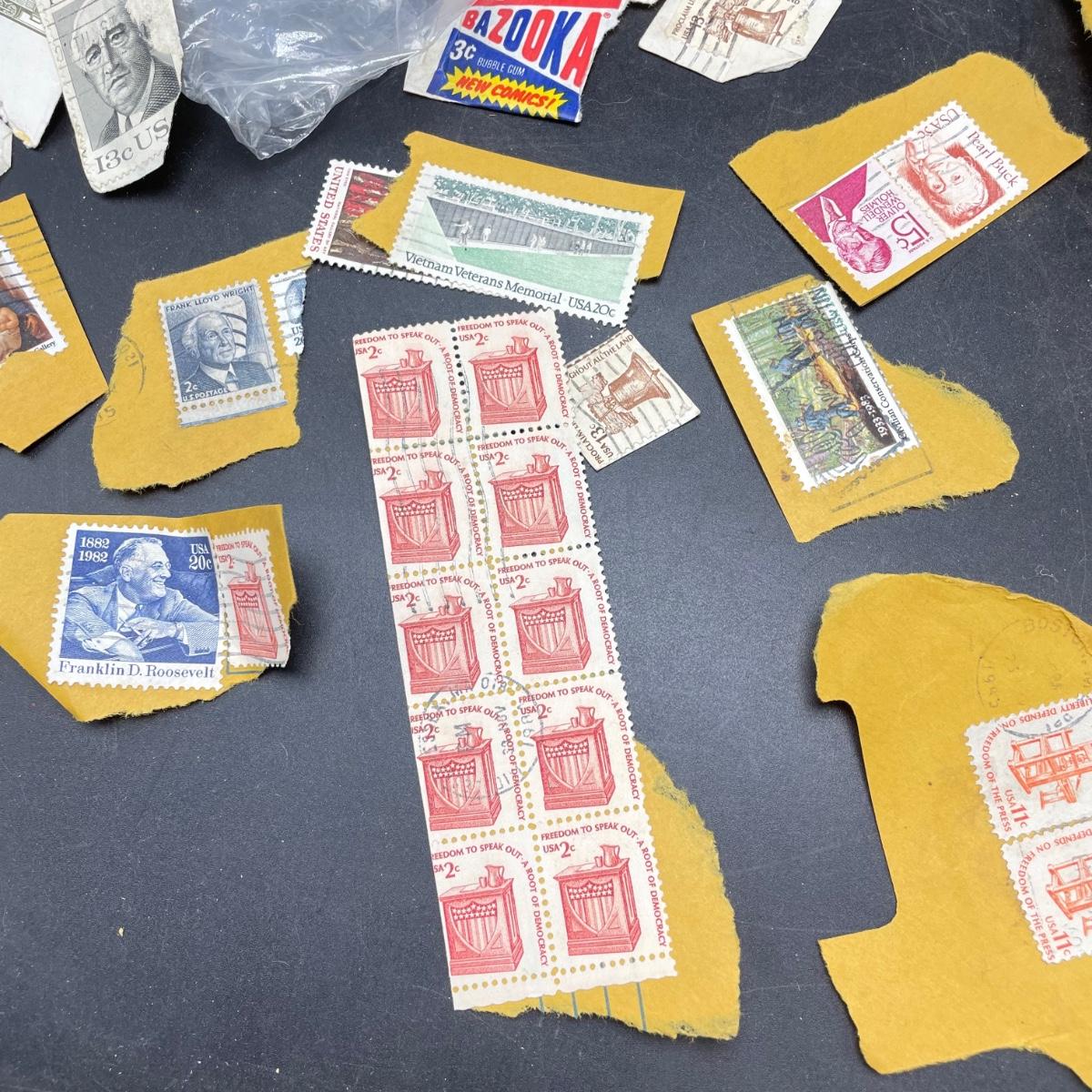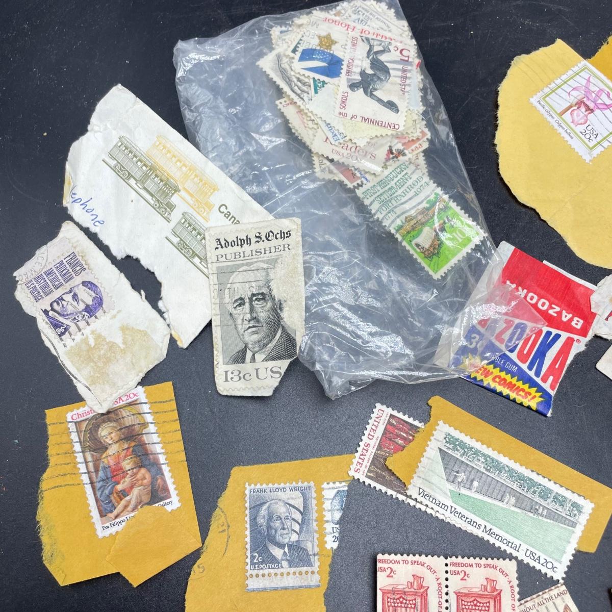 A mostly empty vintage The International Postage Stamp Album Junior Edition, with origin markings on pages with stamps. Other albums are from United Trading Stamps and Economy Oil Company. Lot also includes a ten block of cancelled 2¢ Freedom to Speak Out and many more mostly single cancelled stamps. Foreign and Domestic stamps are included in the lot. See images. Local pick up only.