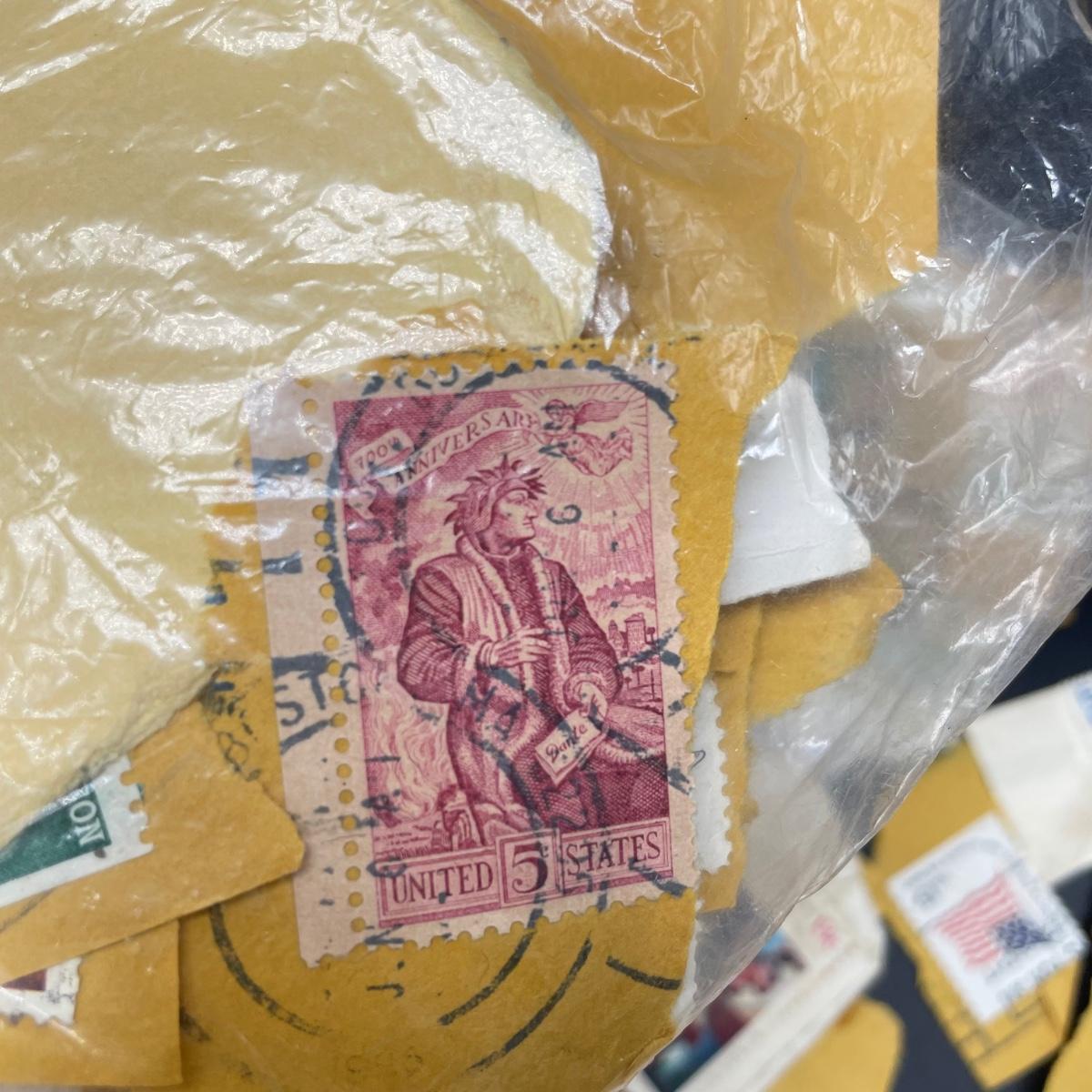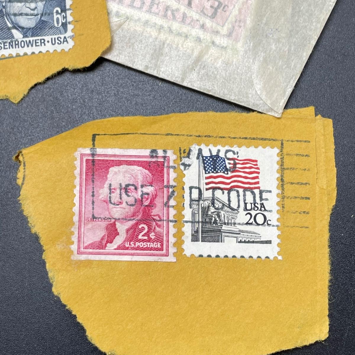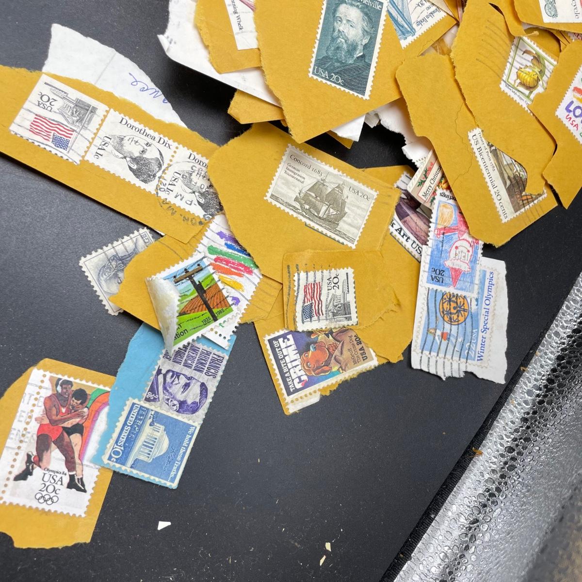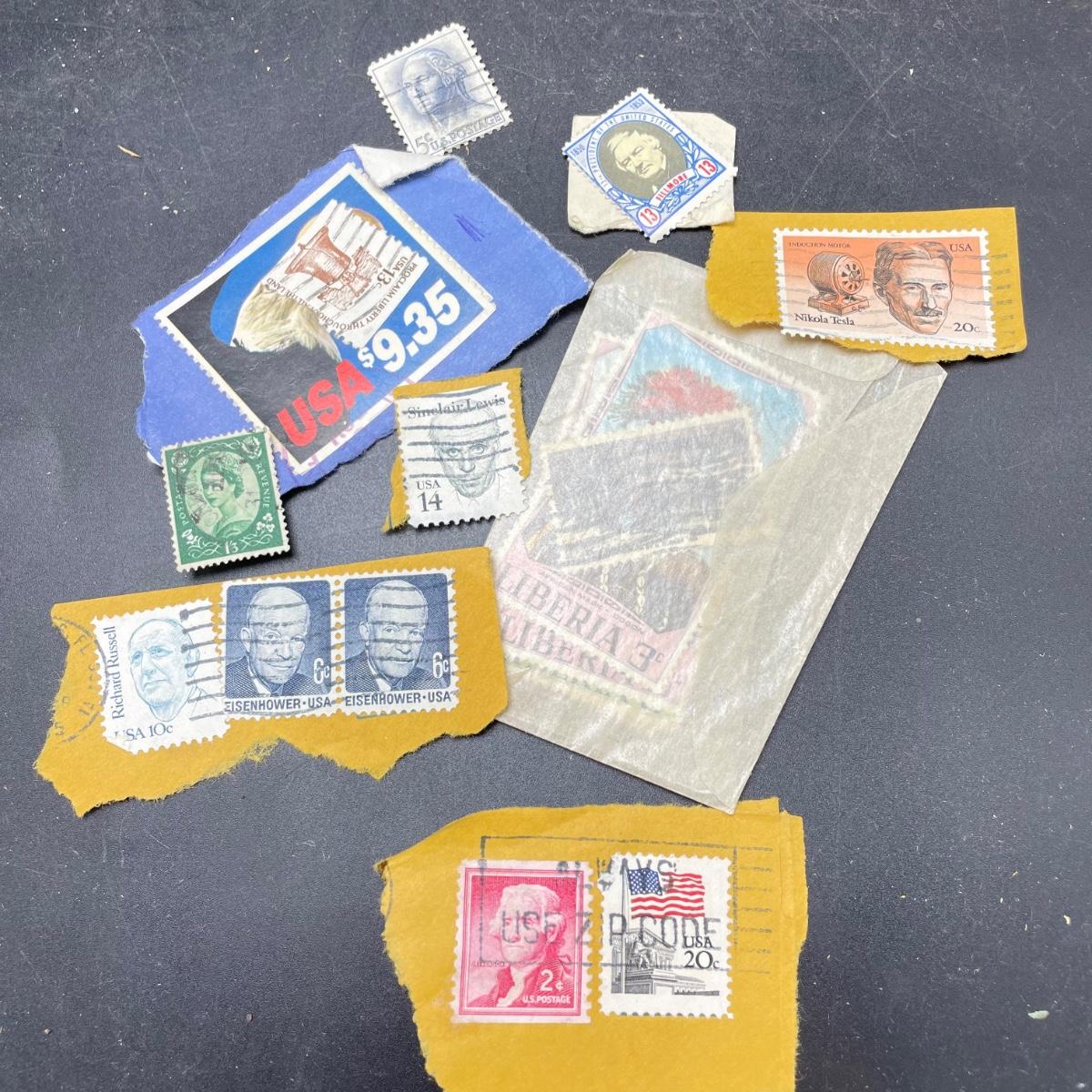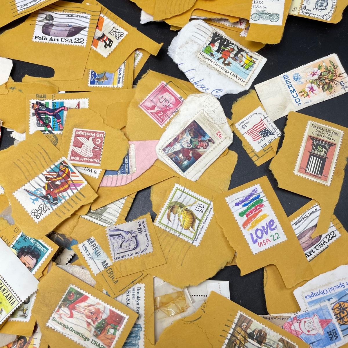 A mostly empty vintage The International Postage Stamp Album Junior Edition, with origin markings on pages with stamps. Other albums are from United Trading Stamps and Economy Oil Company. Lot also includes a ten block of cancelled 2¢ Freedom to Speak Out and many more mostly single cancelled stamps. Foreign and Domestic stamps are included in the lot. See images. Local pick up only.