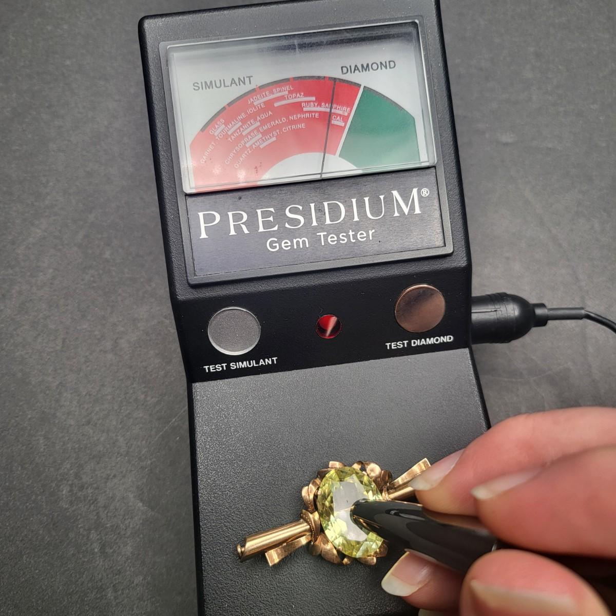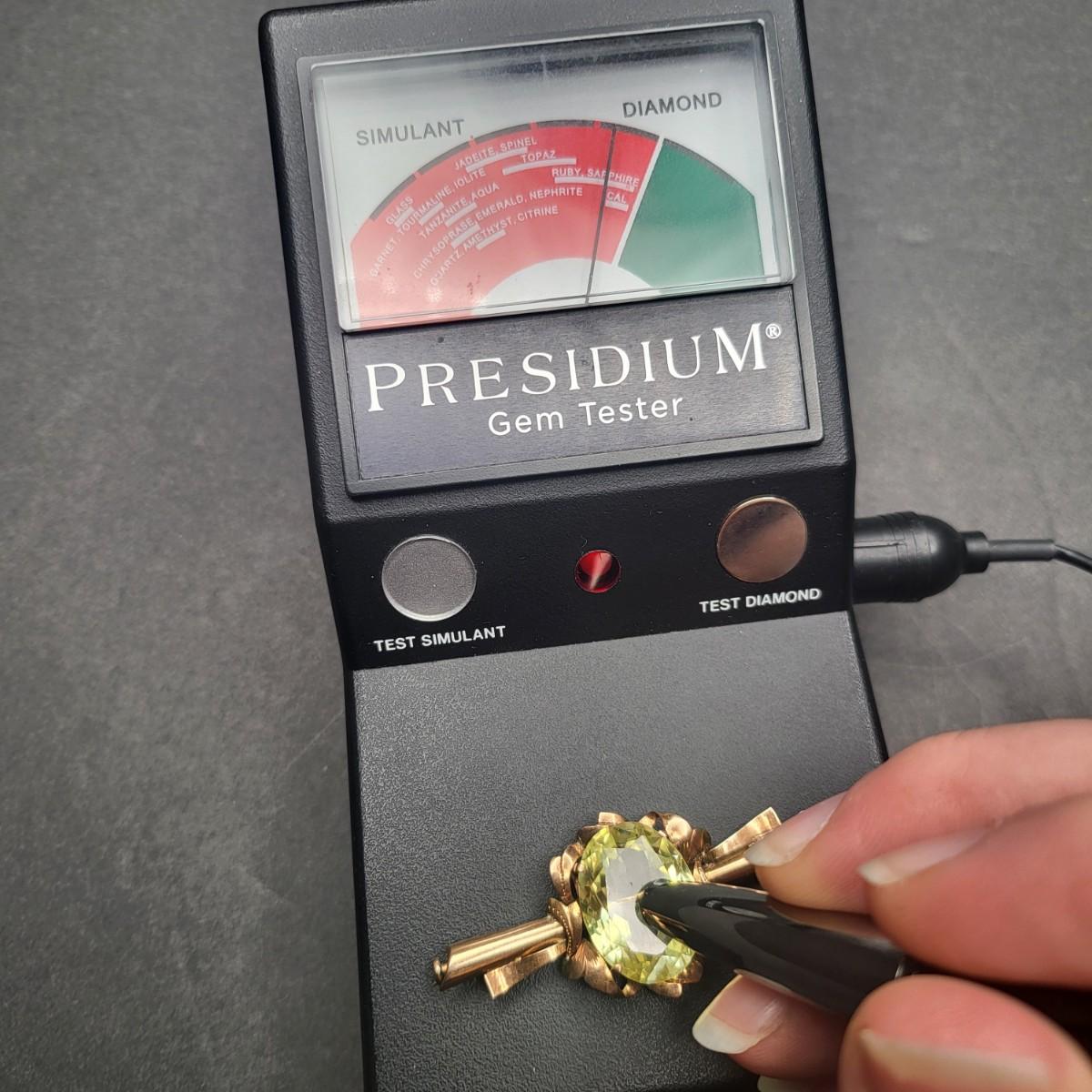 Gorgeous antique 14k (585) brooch with large oval yellow stone, testing as Sapphire. Clasp pulls in/out.