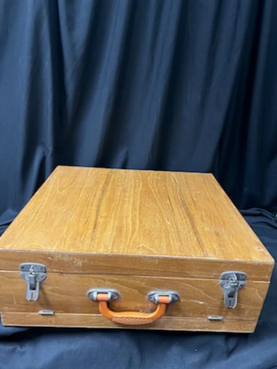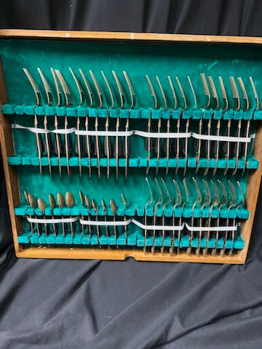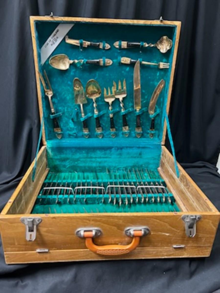 139 pieces of this bronze flatware with Rosewood handles, circa 1940s. The case shows signs of wear. There are a few broken pieces that could easily be repaired.