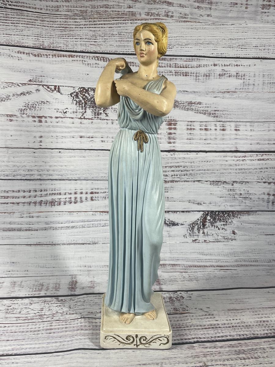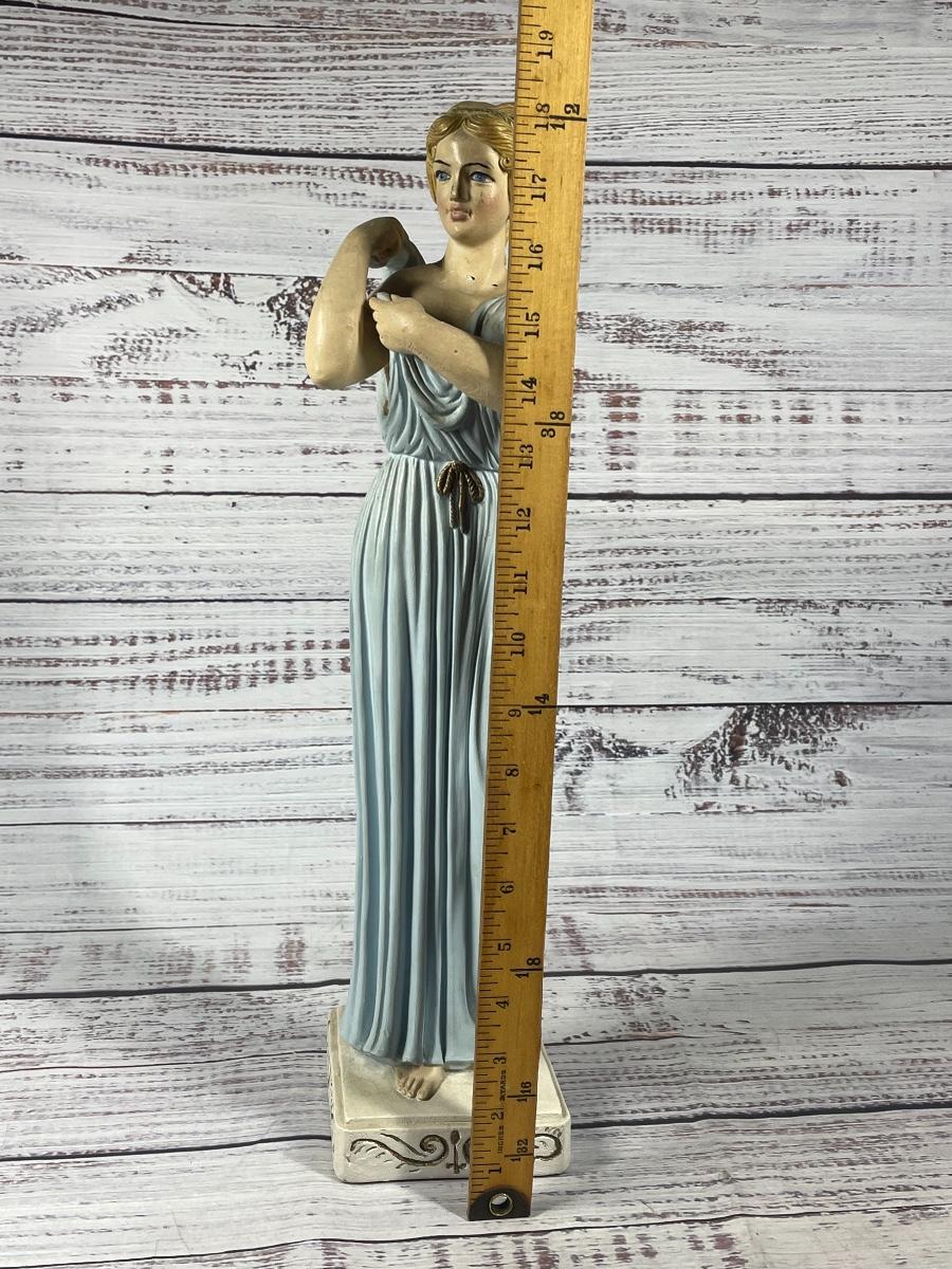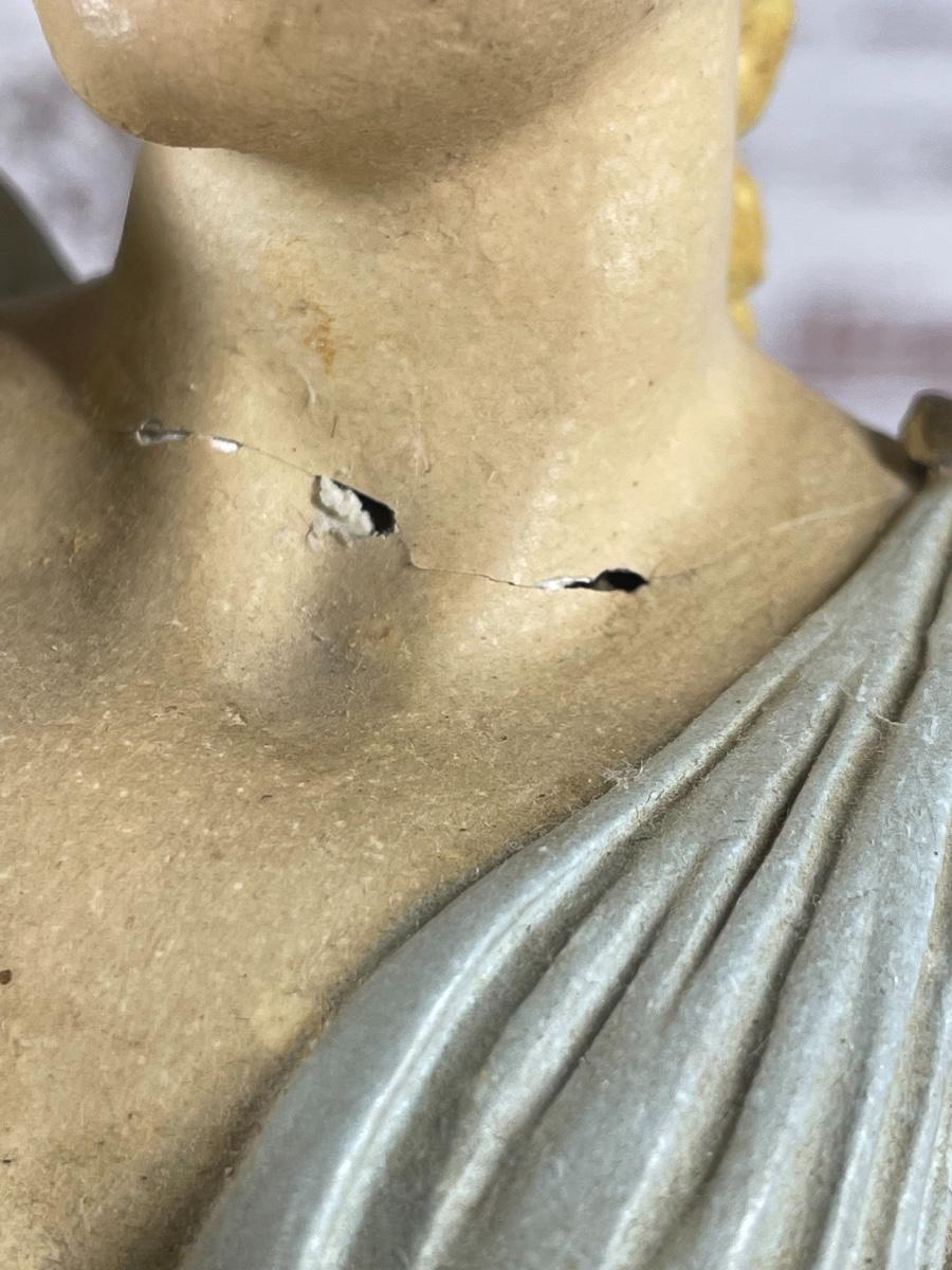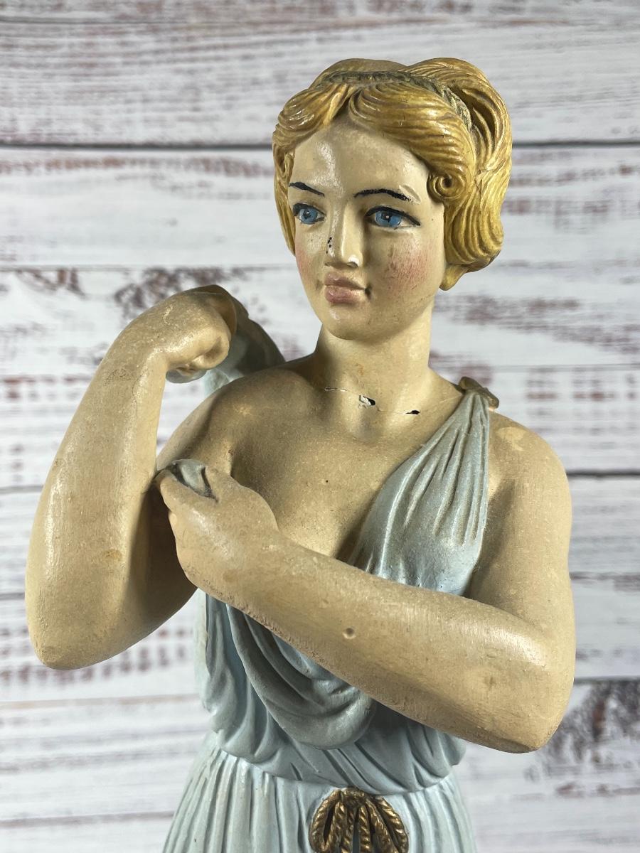 This statue is in good condition. There are some cracks around the woman’s neck and on the bottom of the statue. This item is approximately 18” tall.