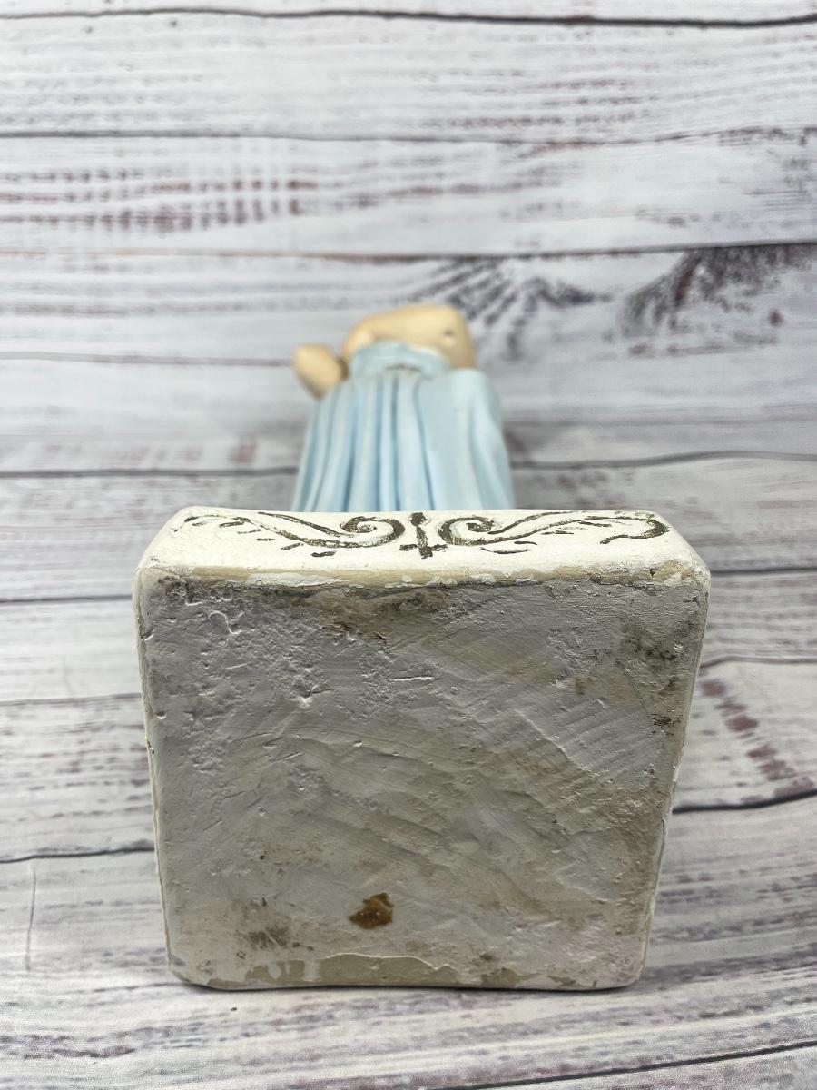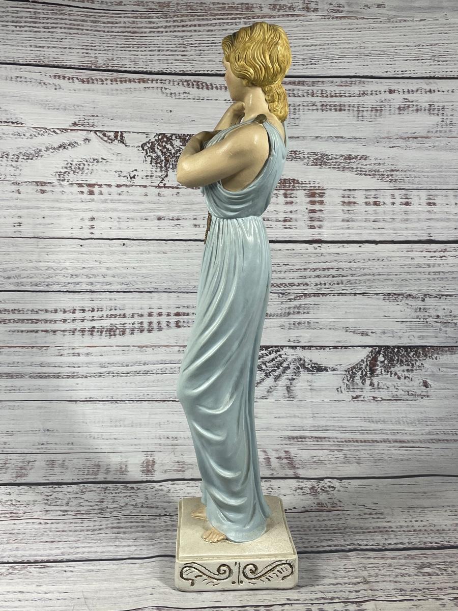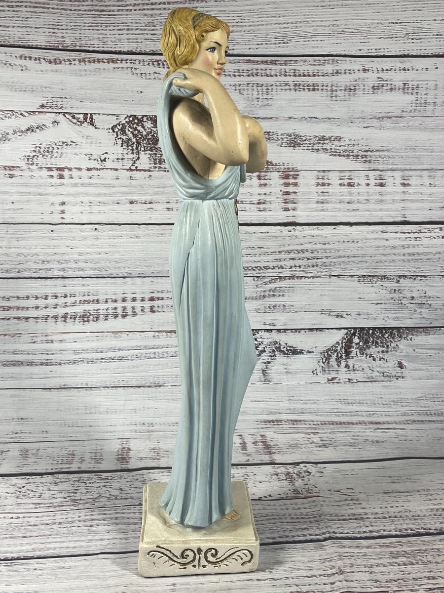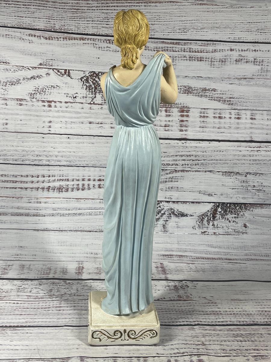 This statue is in good condition. There are some cracks around the woman’s neck and on the bottom of the statue. This item is approximately 18” tall.