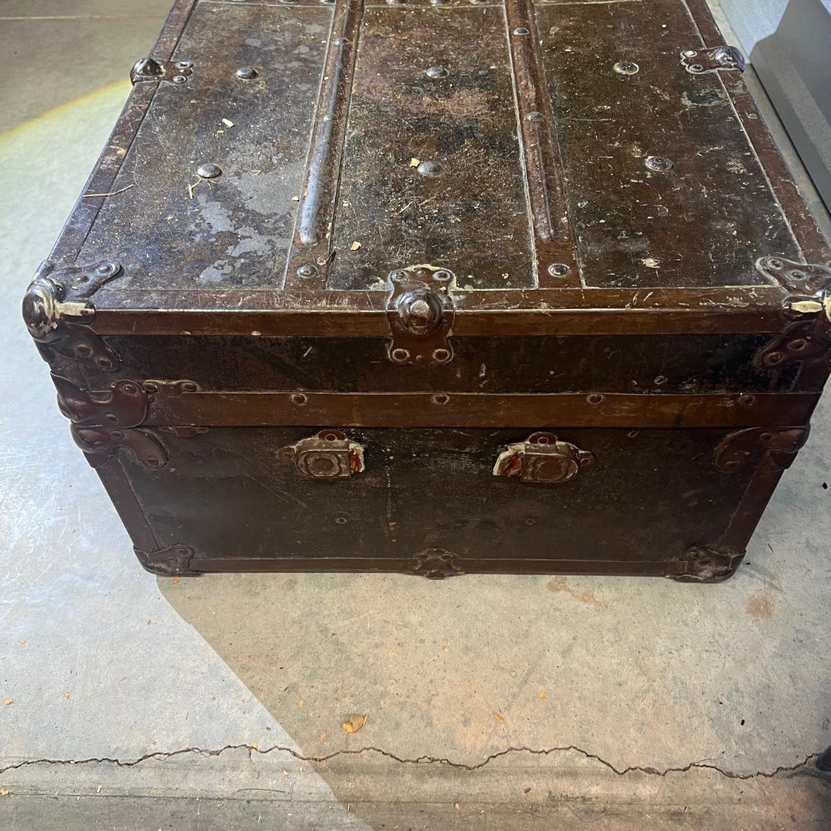 Antique Steamer Trunk with original Paper lining inside, this is a dark metal outside and dimensions are 36"x 19 1/2" x 12 1/2"