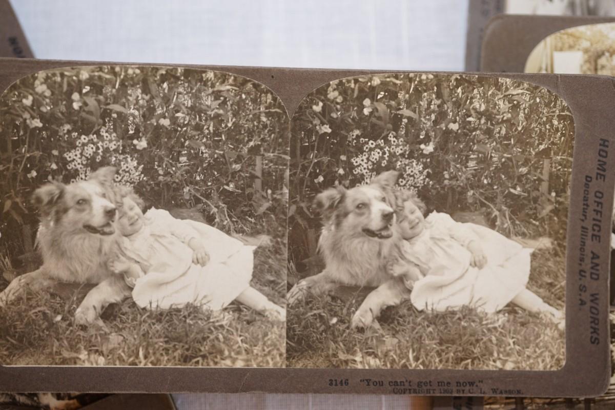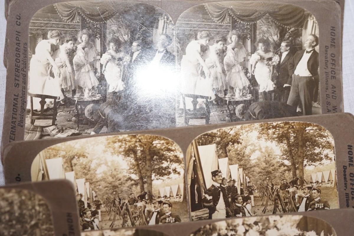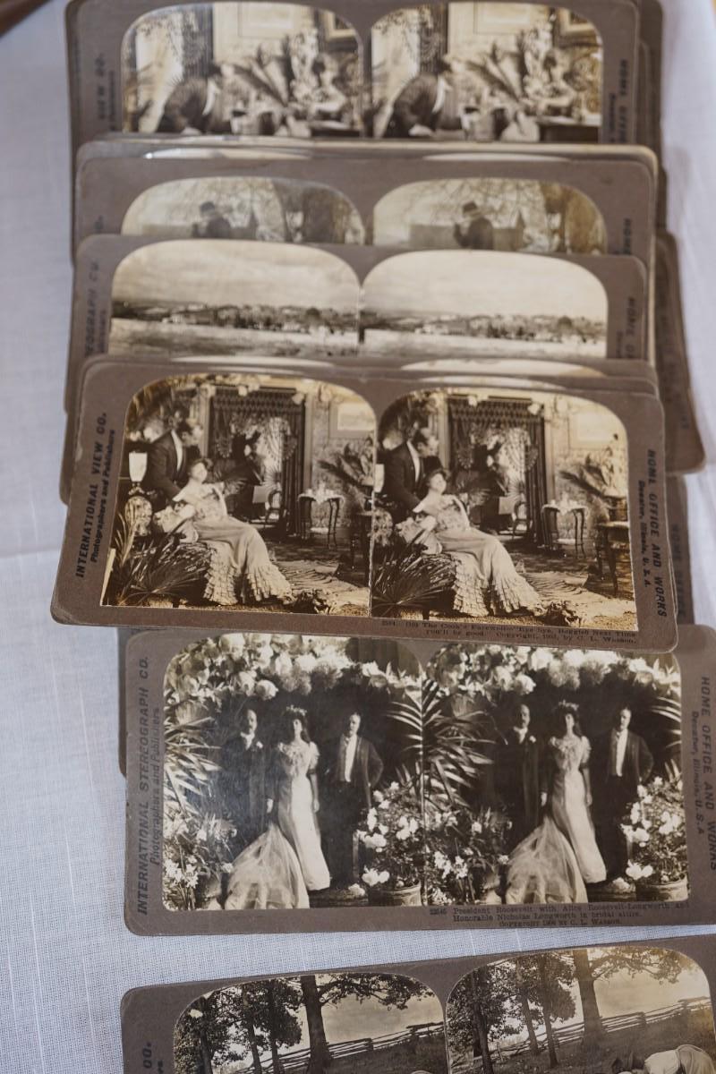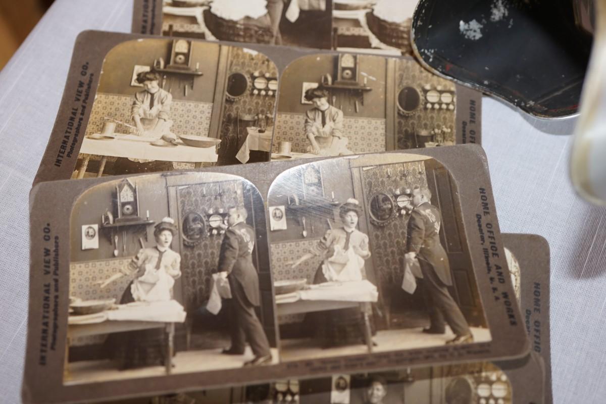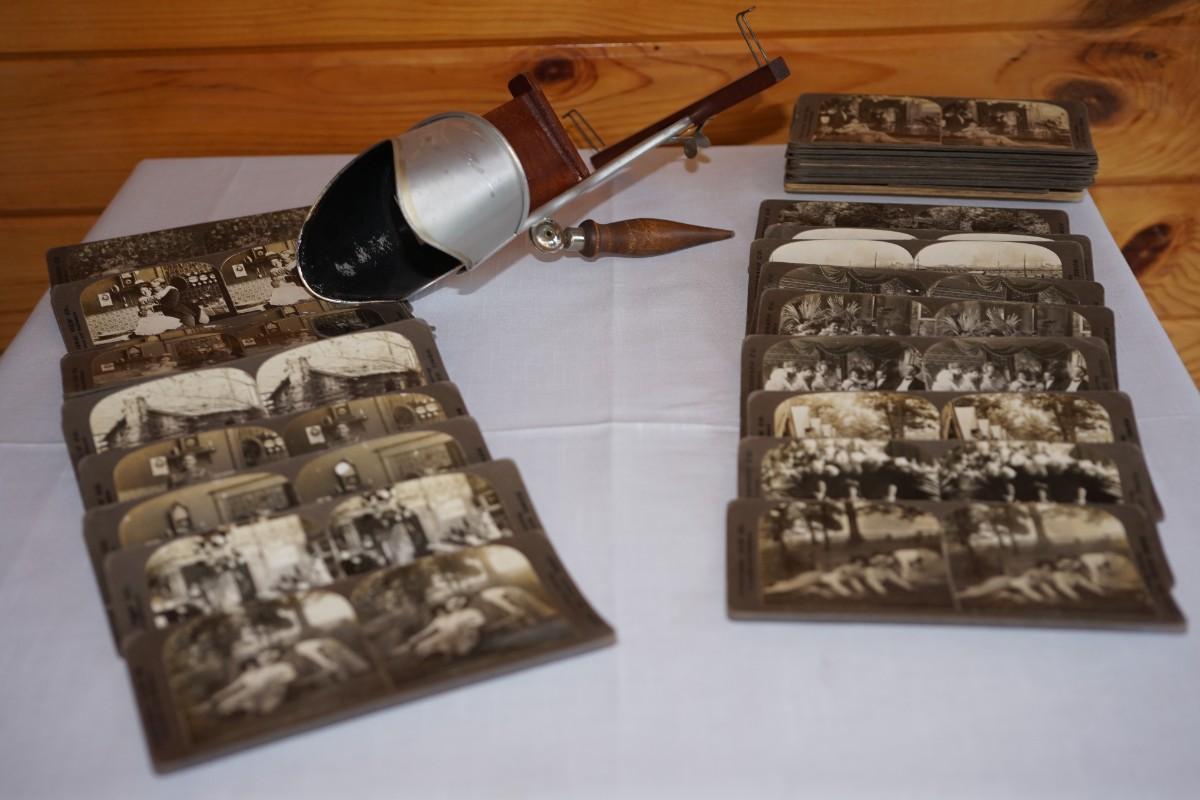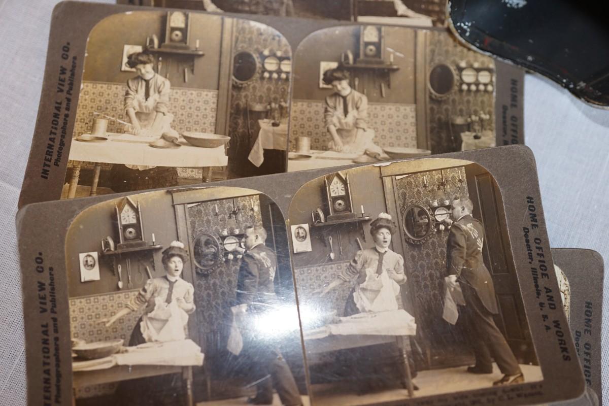ANTIQUE STEREO OPTIC VIEWER W/ 30 CARDS OF EARLY 1900'S HOME INTERIOR / FAMILY