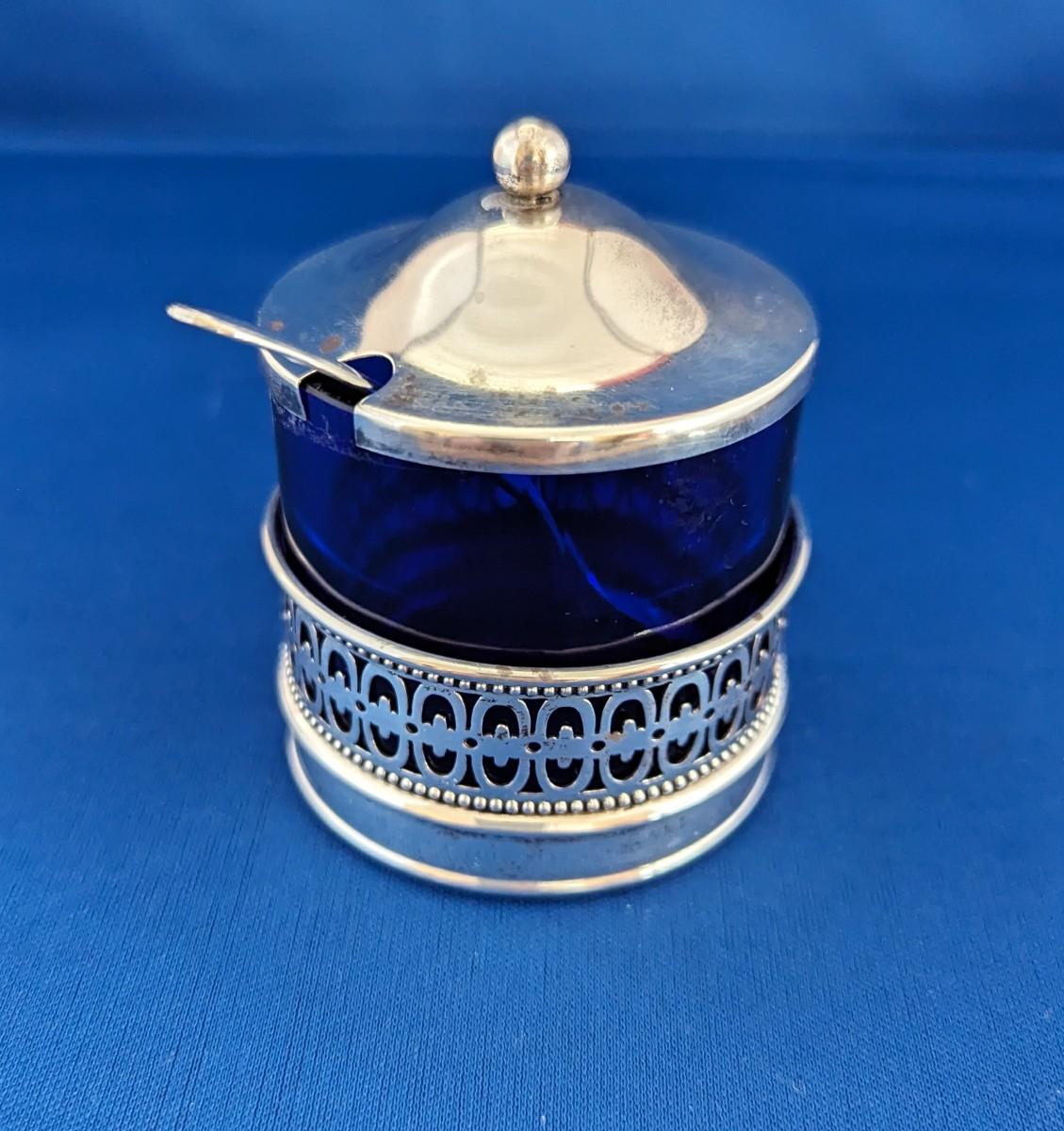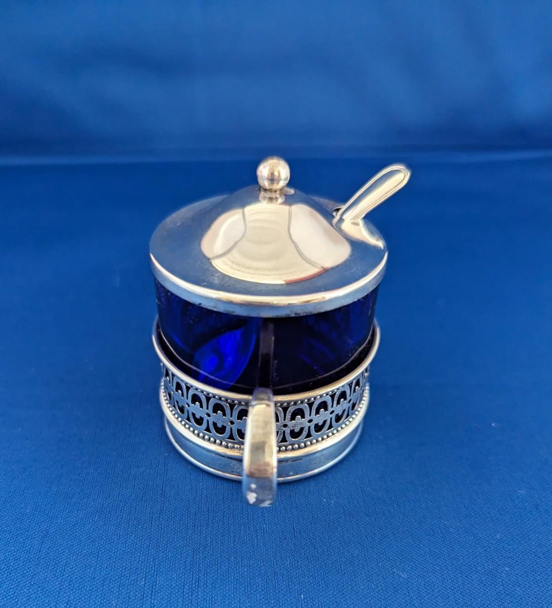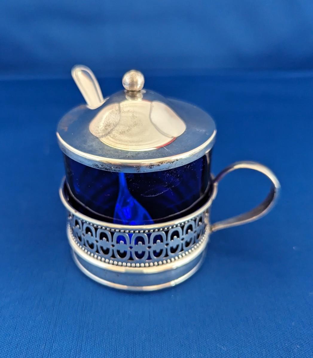 Antique Sterling silver and cobalt blue glass mustard pot with lid and spoon