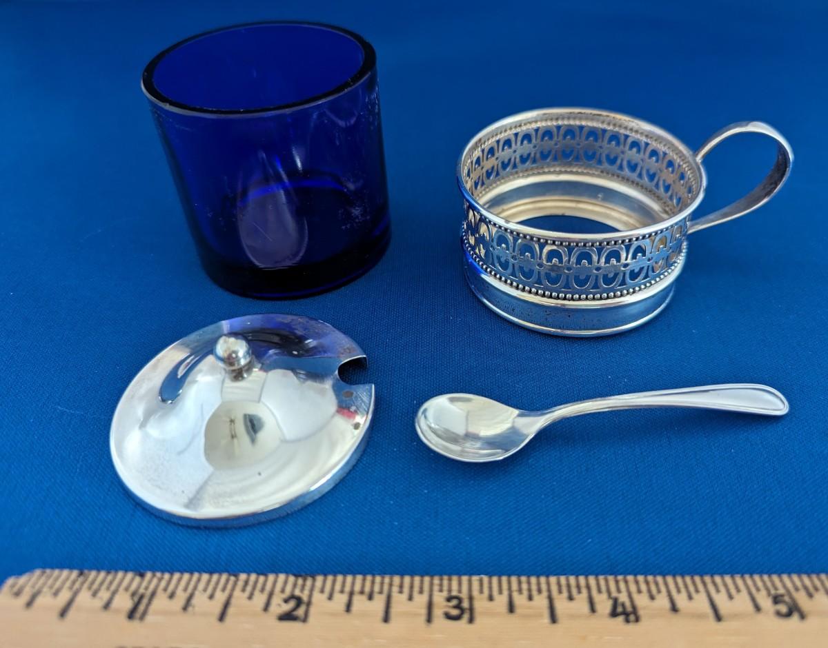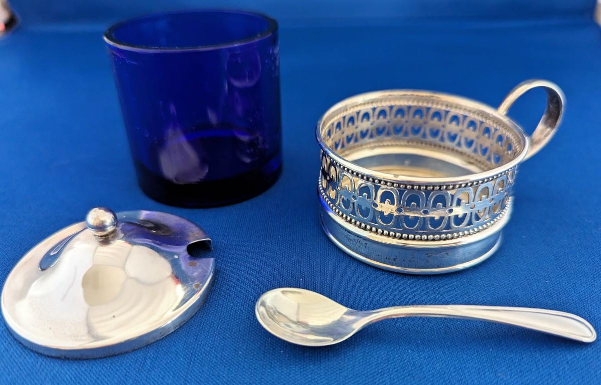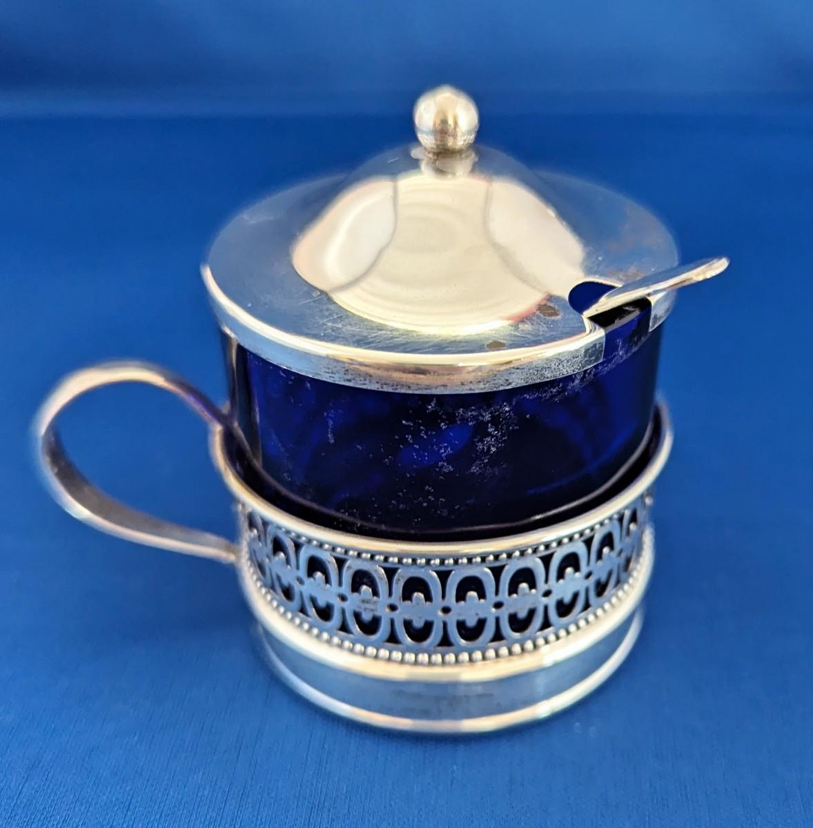Antique Sterling silver and cobalt blue glass mustard pot with lid and spoon