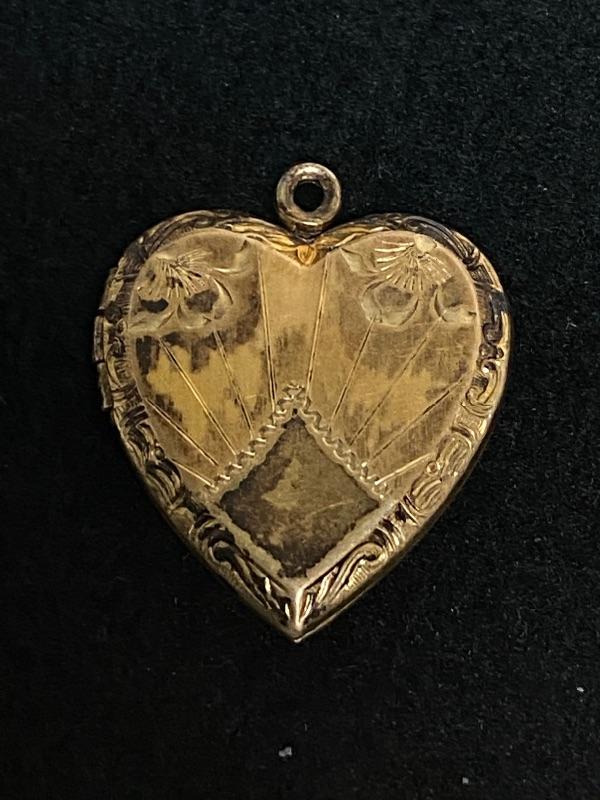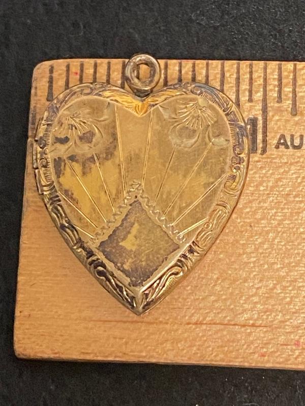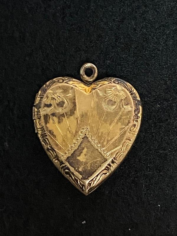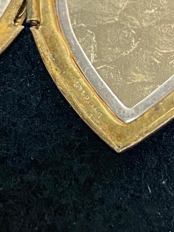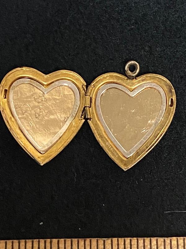 Antique heart shaped locket. Beautifully etched front. Stamped Sterling inside. Has a gold tint to it. Has both heart shaped brackets to hold pictures in place inside as well. About 1" wide and a little over an 1" in length.
