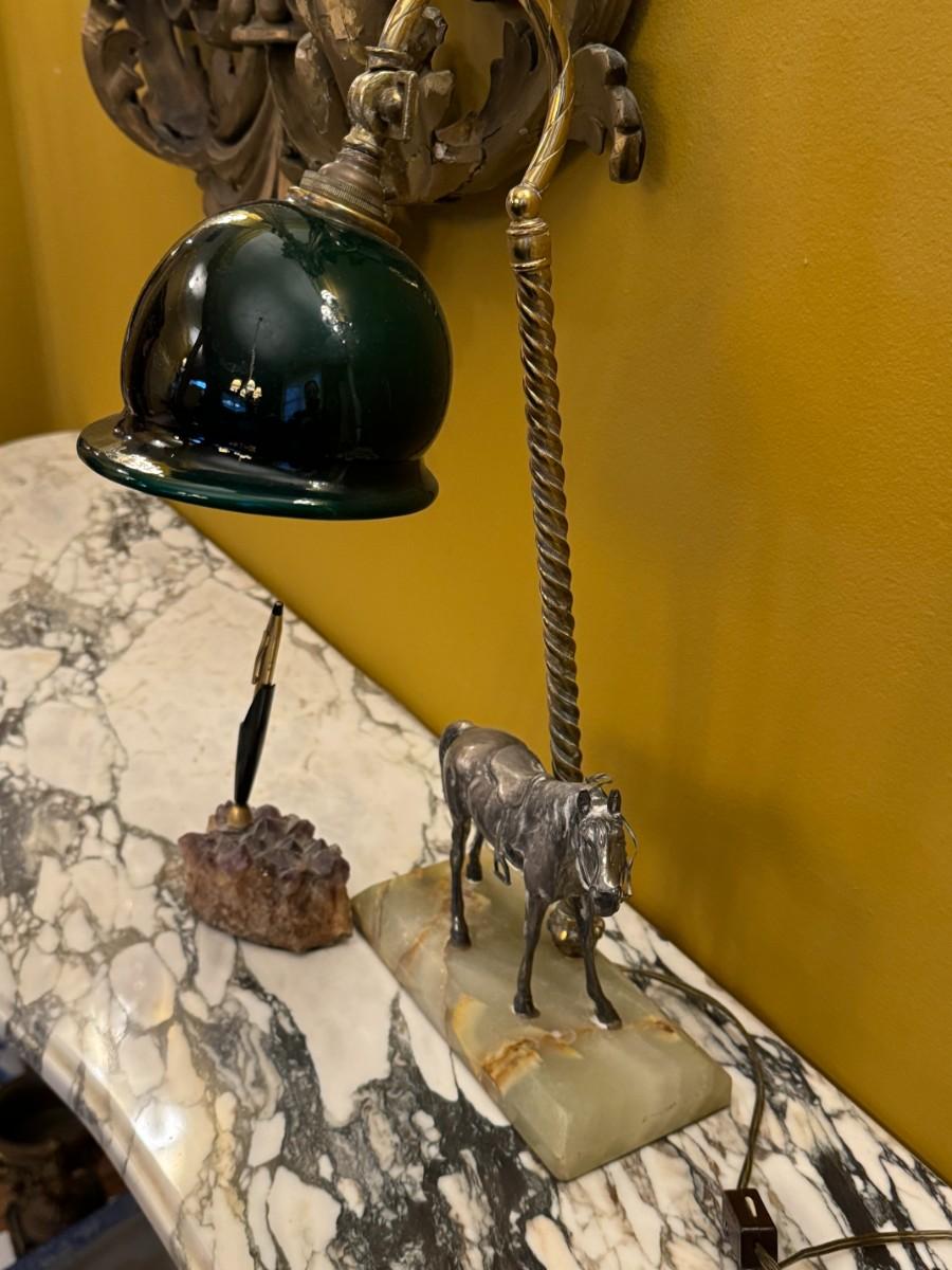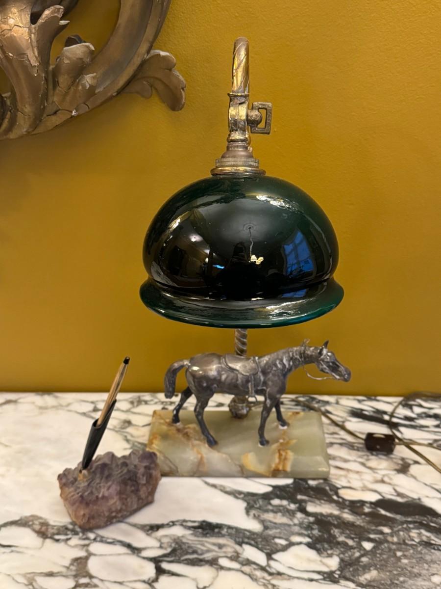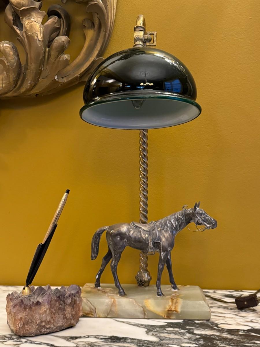 Antique Sterling Silver Horse Desk Lamp with Marble Base and Crystal Pen Holder