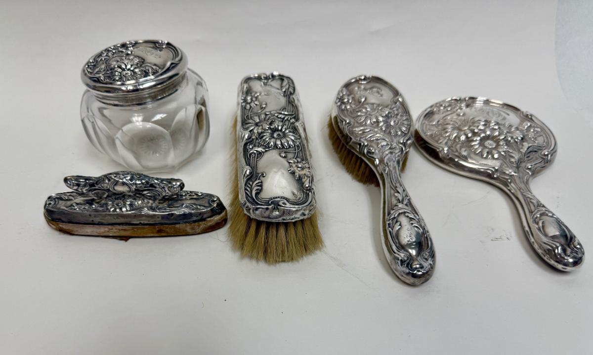 Antique Sterling Silver Vanity 5 piece Set - Mirror, brushes, nail buffer, jar